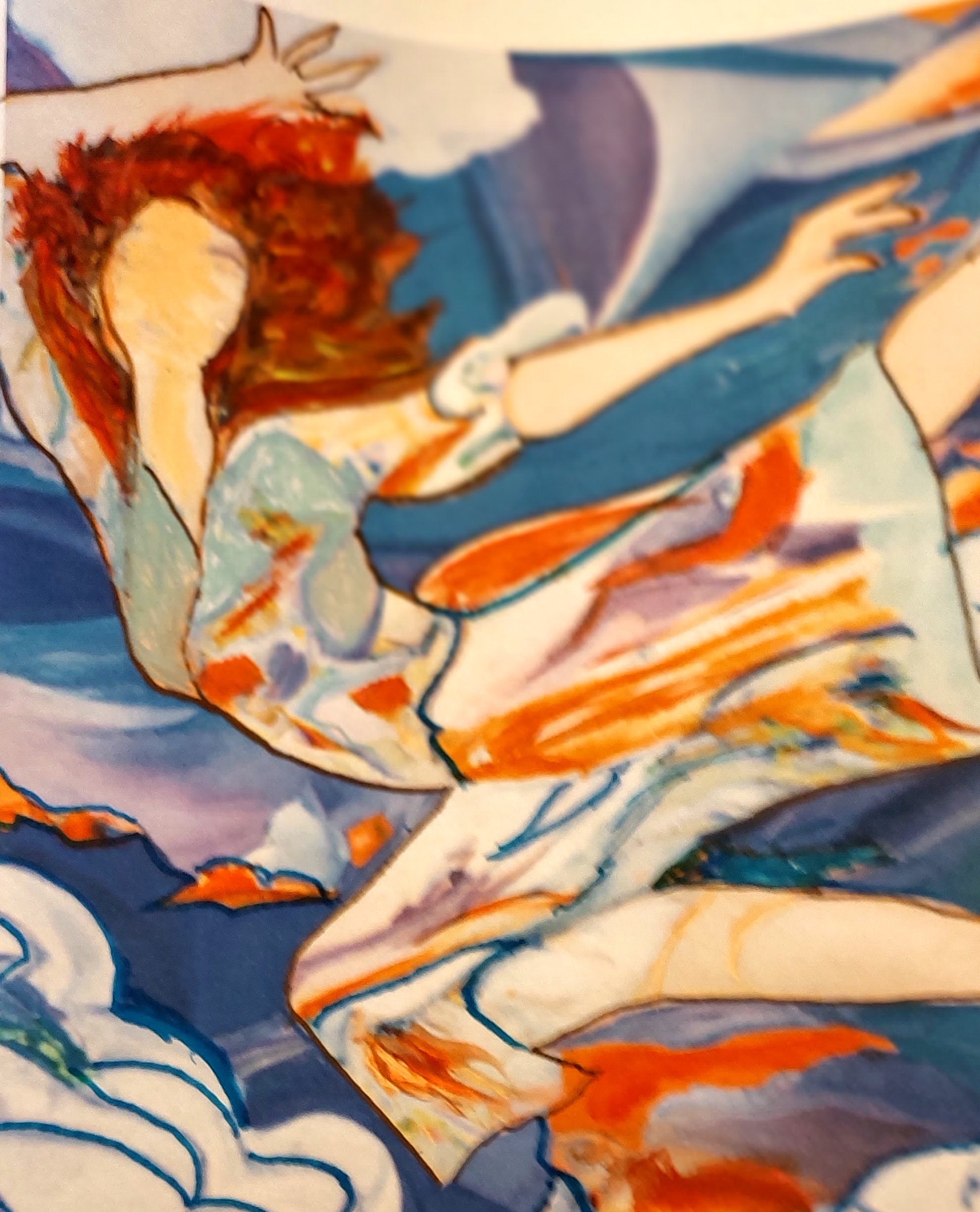 Bring motion, emotion, and color into your space with Dancing with Clouds, an abstract canvas art print by the original artist. This vivid and expressive piece features a surreal female figure caught in fluid movement, set against a swirling backdrop of dreamy cloud forms and bold color contrasts. The artwork combines soft curves and energetic strokes, blending vibrant reds, deep blues, and earthy creams to evoke a sense of freedom, femininity, and imagination.