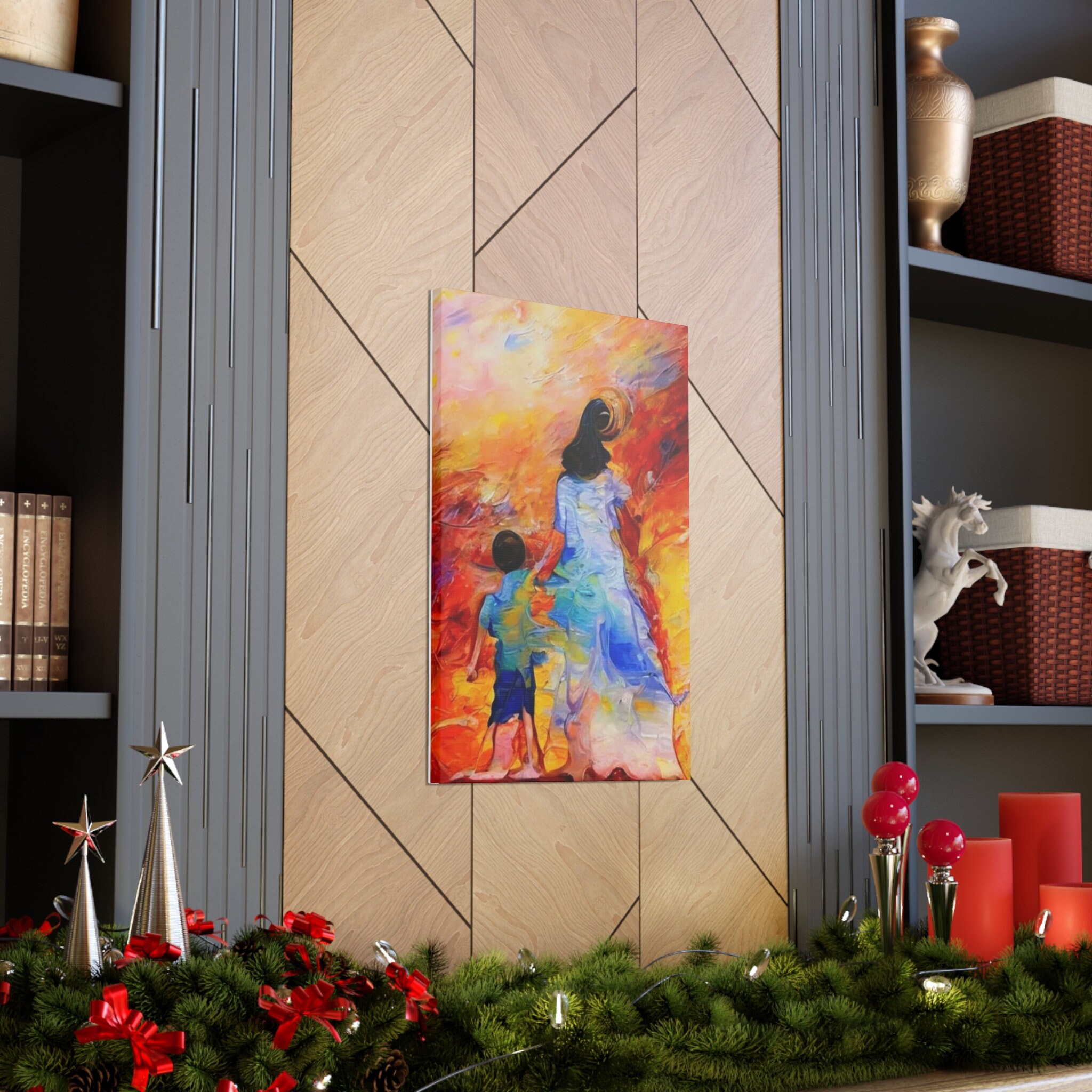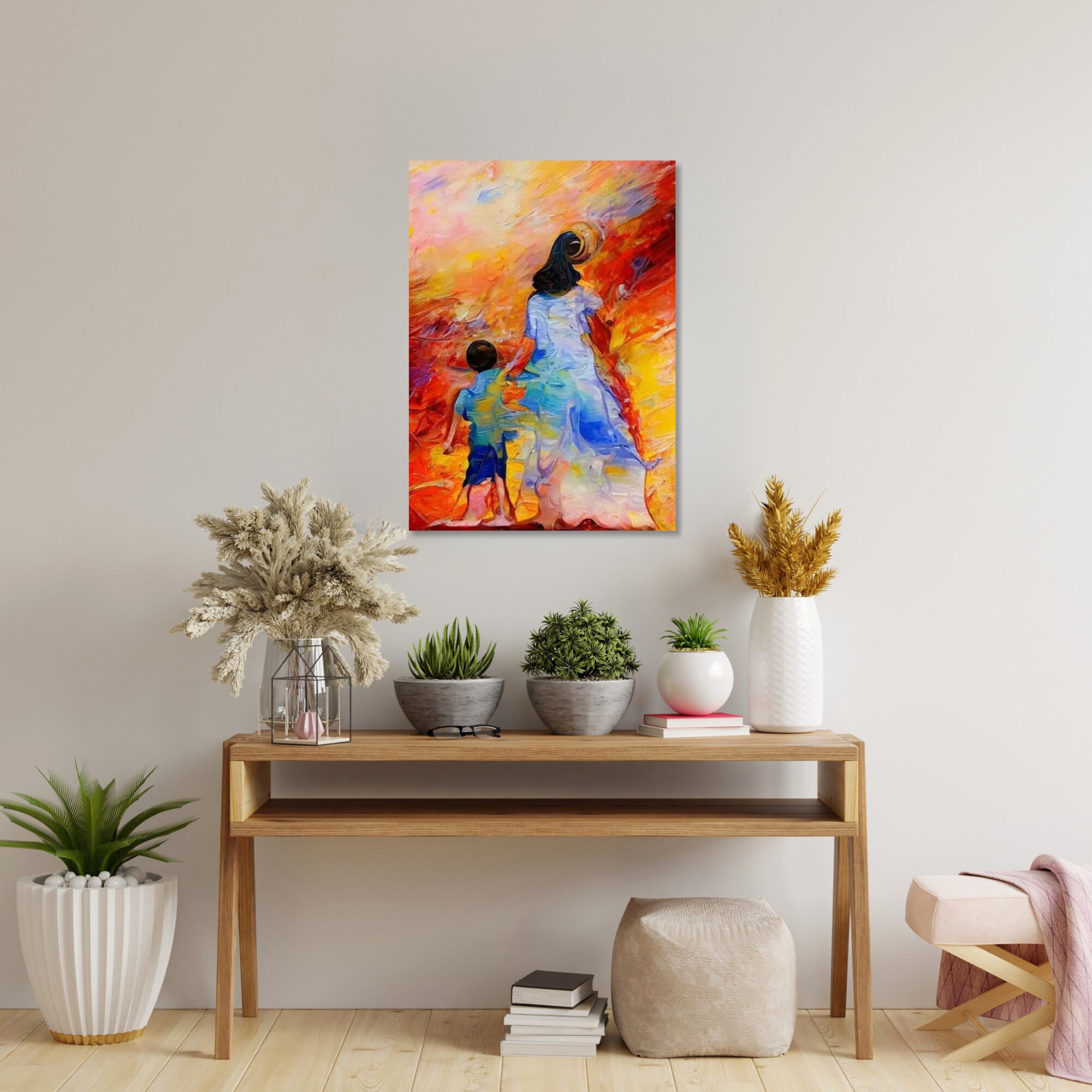 Abstract wall art of a woman holding her sons hand walking forward to the colorful view,