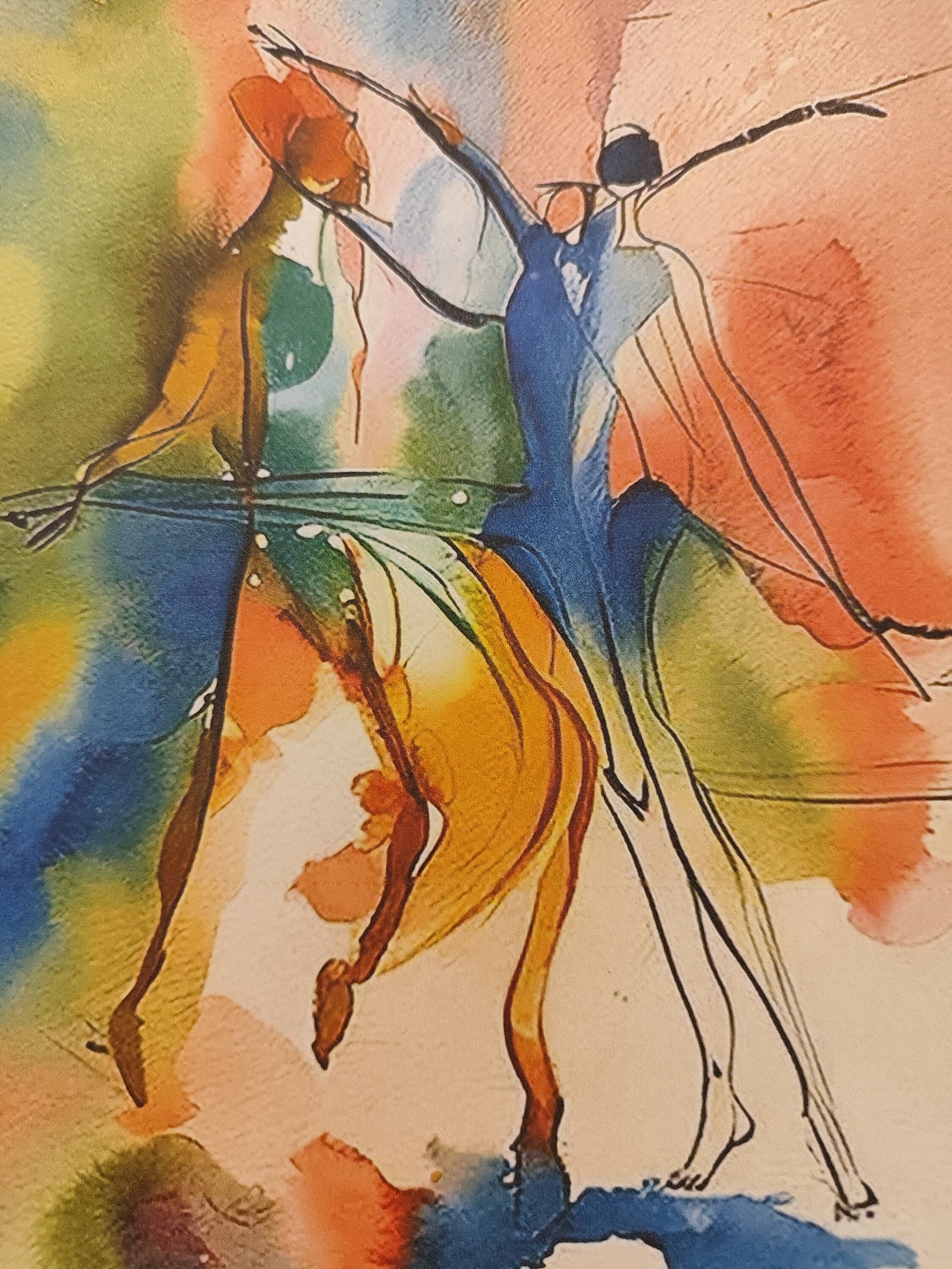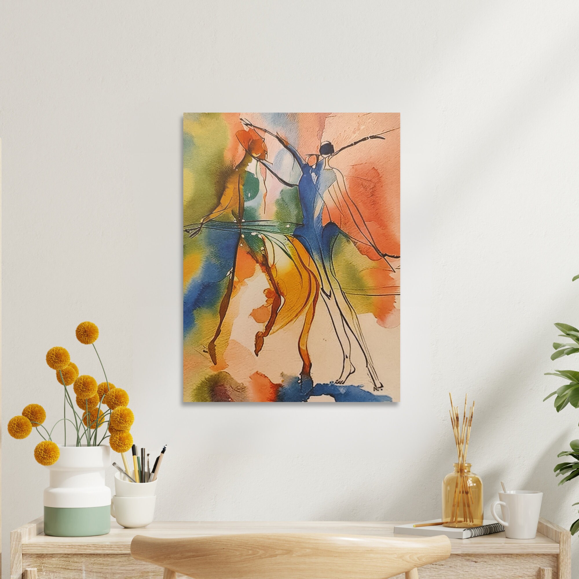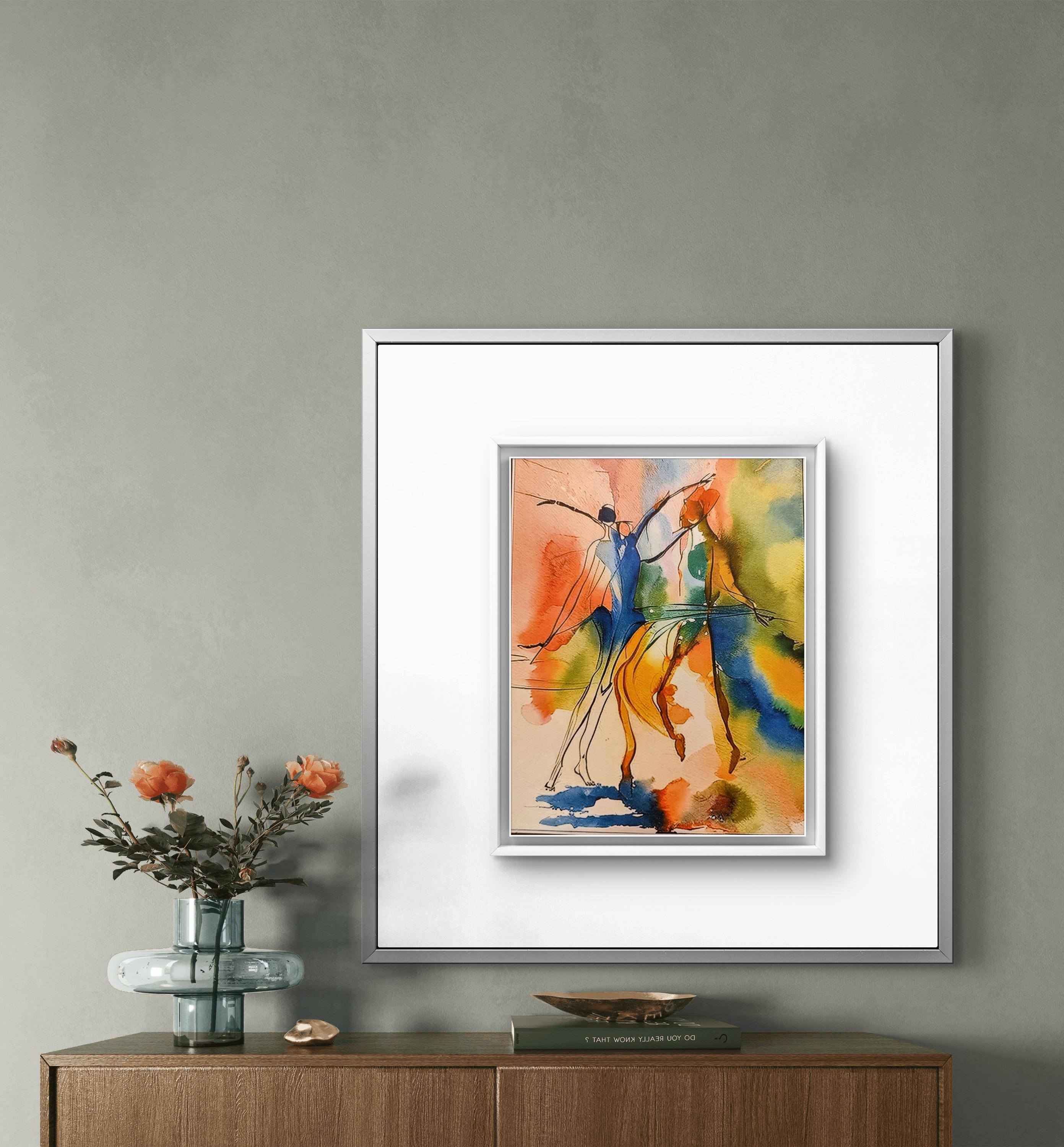 The artwork depicts a group of abstract dancers captured in flowing, vibrant motion. The figures are rendered with elongated, fluid lines and colorful watercolor washes that blend into one another, creating an ethereal, dreamlike quality. The dancers appear to be mid-performance, their poses suggesting grace, harmony, and the energy of movement. The use of warm oranges, yellows, and cool blues creates a striking contrast, emphasizing both the dynamism and unity of the composition.