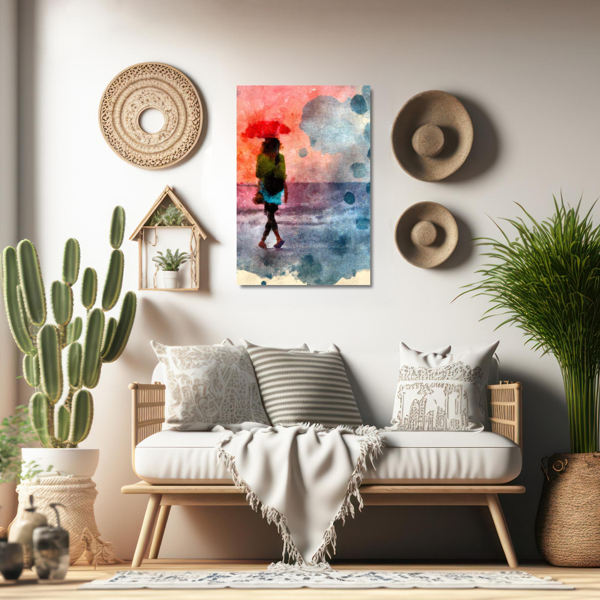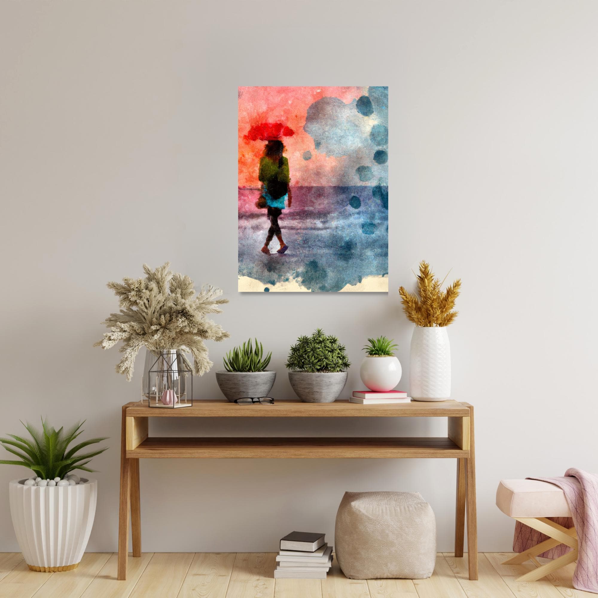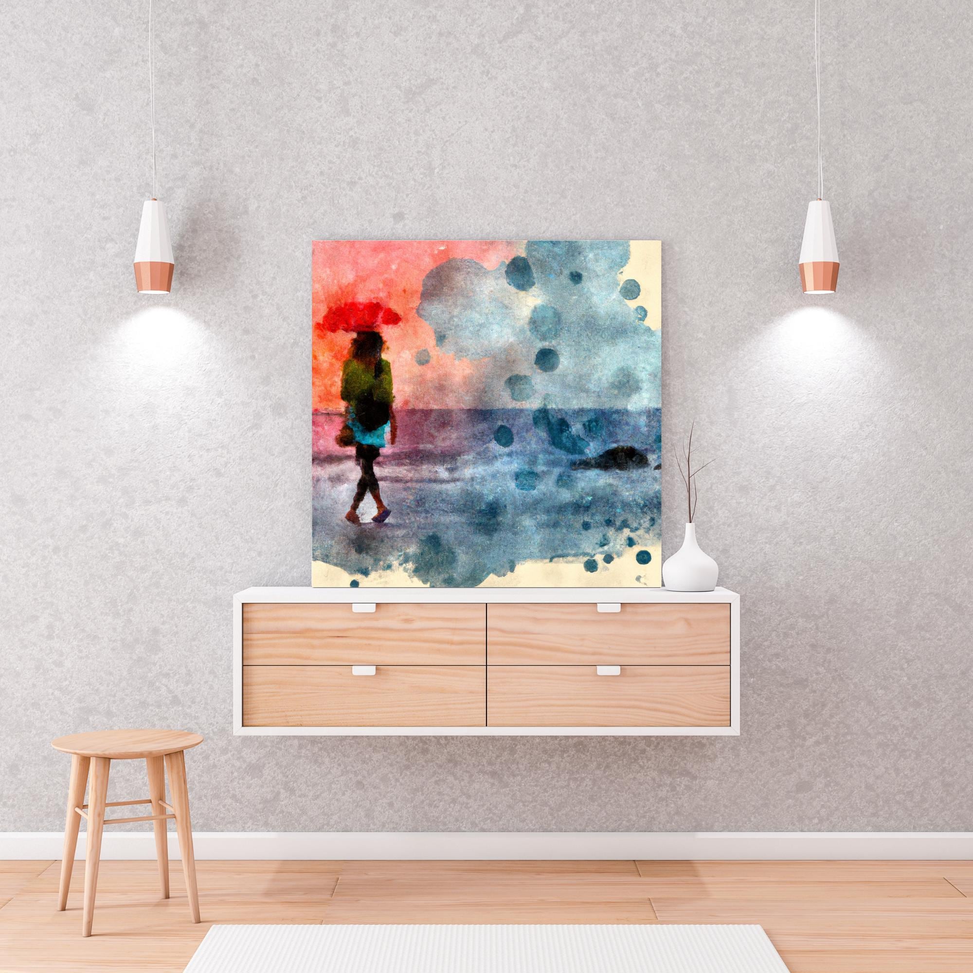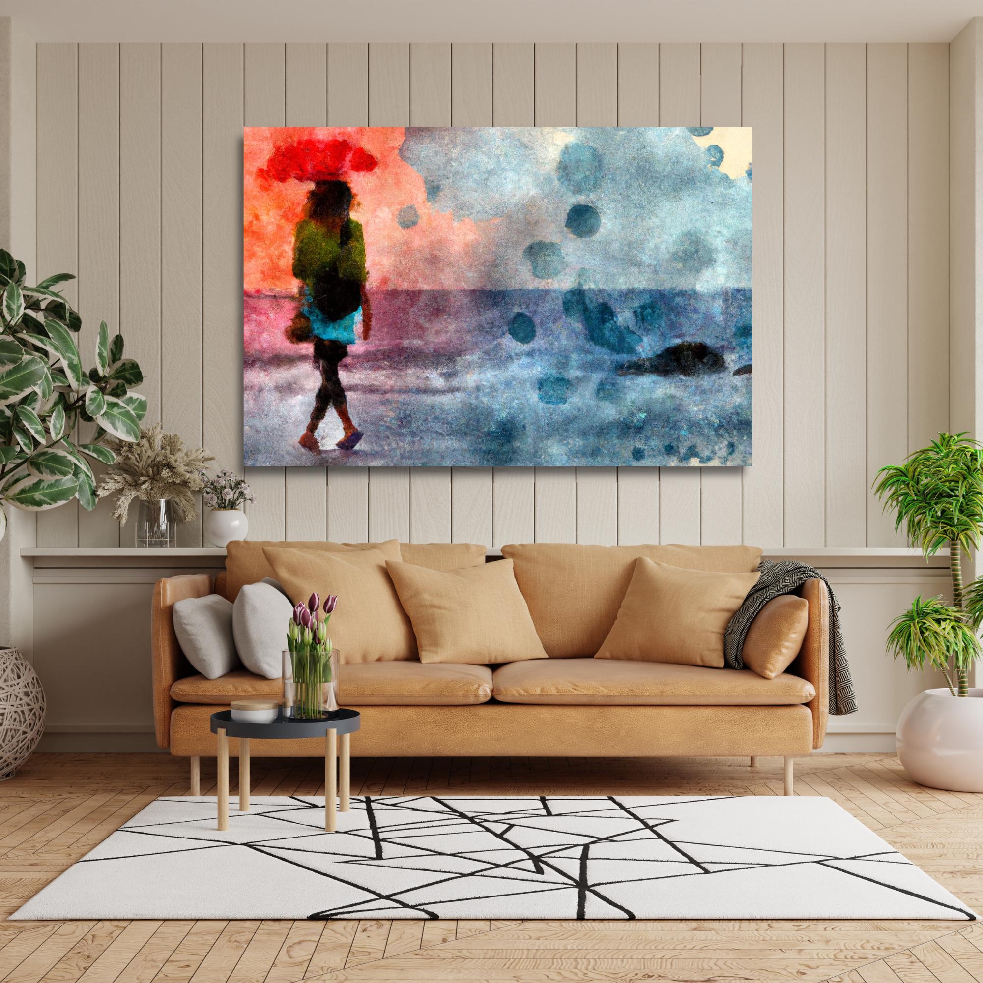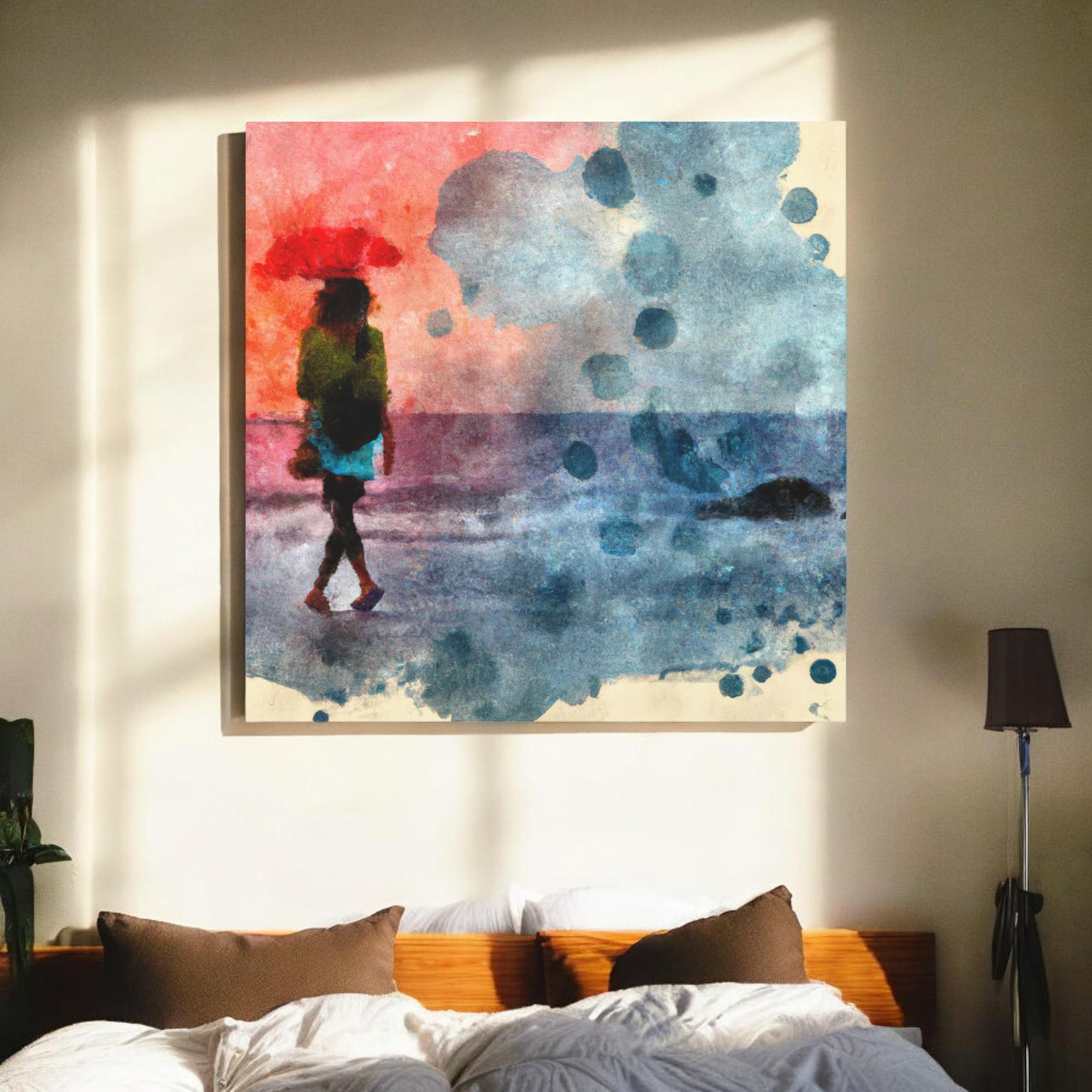 Dreaming Woman walking on Seascape Watercolor Ocean Painting on Canvas