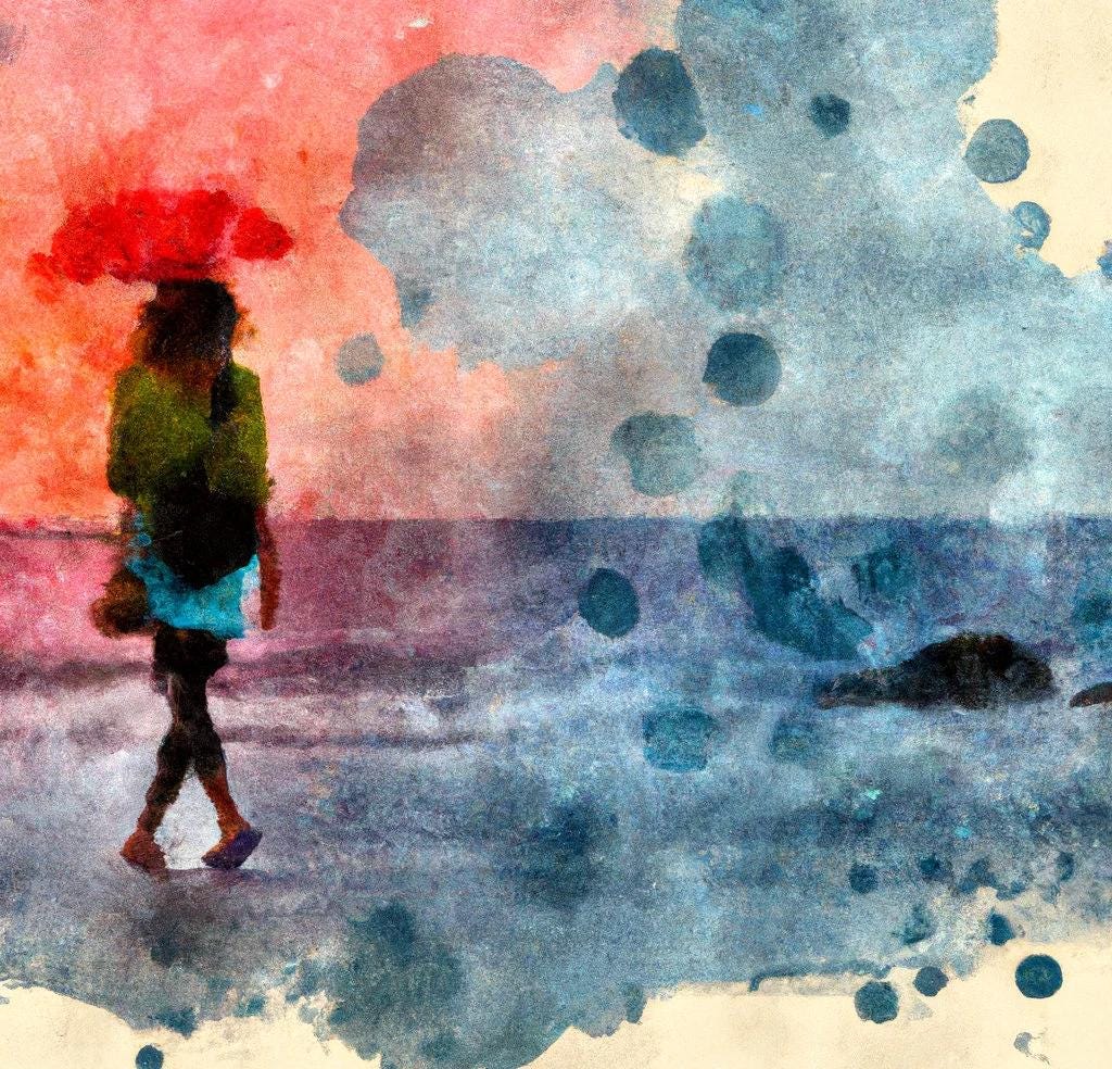Water color Painting of a woman walking alone by the sea. The painting captured her walking on the wet sand, with her hair flying in the wind. The colors of the painting are vibrant, with blues and greens representing the sea, and yellows, oranges, and red representing the sky.