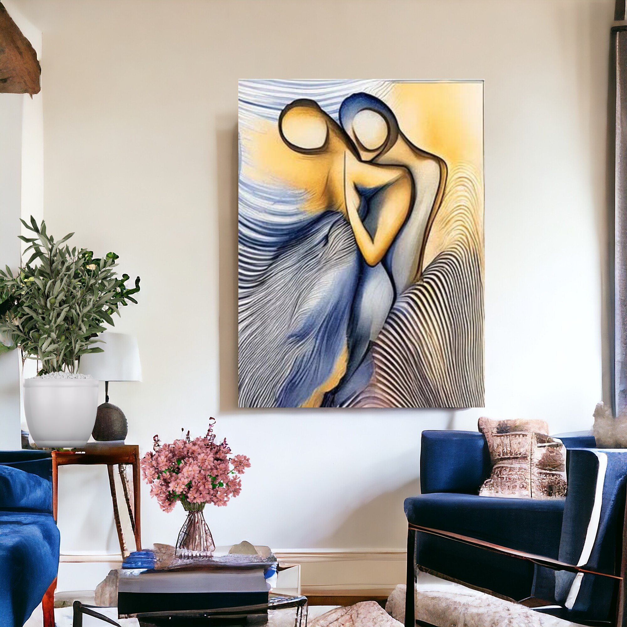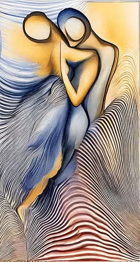 Description: This stunning abstract painting captures the intimate embrace of two human figures, intertwined in a dance of emotional connection. Featuring fluid lines and soft curves, the artwork evokes a sense of warmth and serenity through its use of golden yellows and calming blues. The faceless, stylized figures invite the viewer to interpret the meaning of love and togetherness in their own way. Perfect for contemporary spaces, this modern figurative piece adds elegance and depth to any room, whether displayed in a living area, bedroom, or office. ready to hang