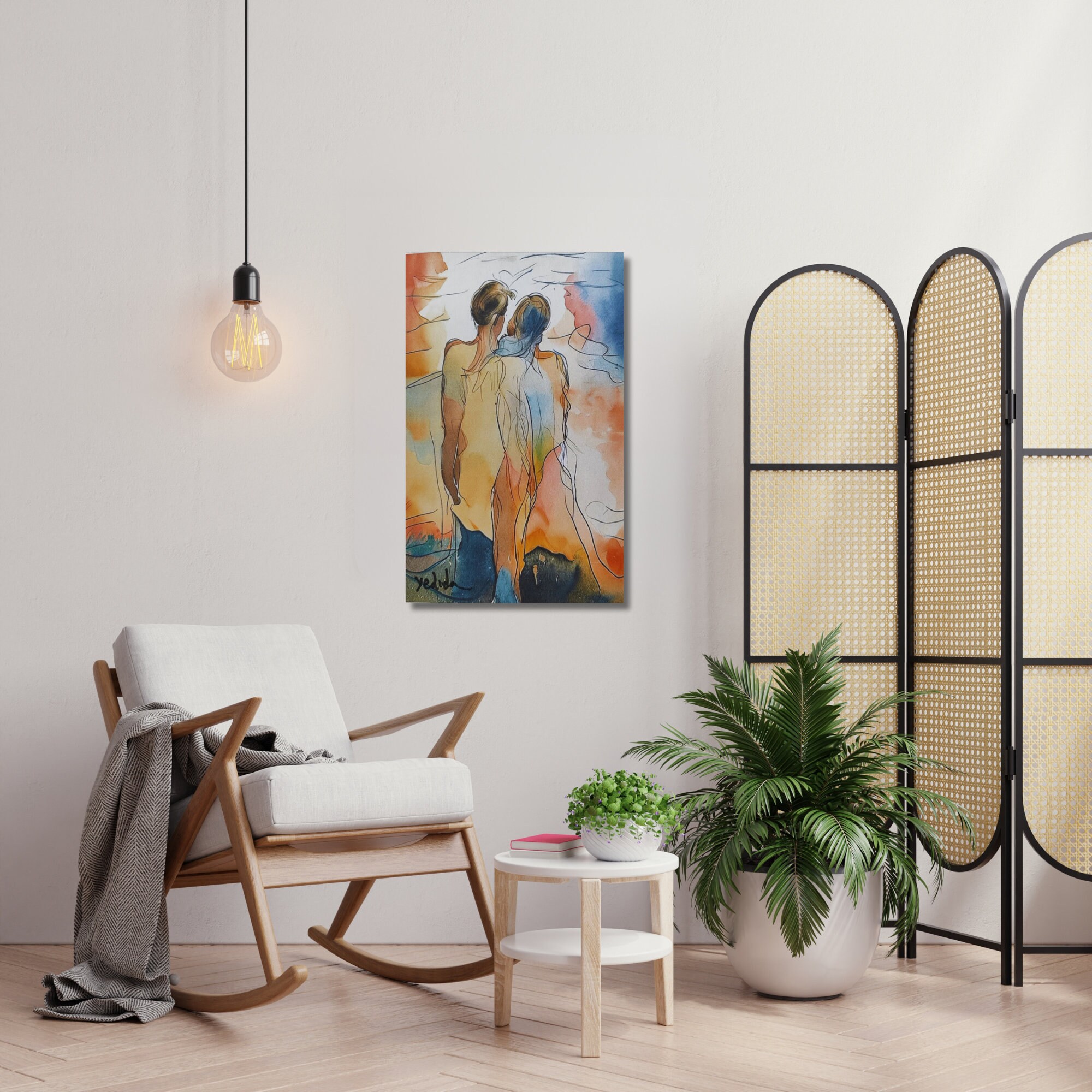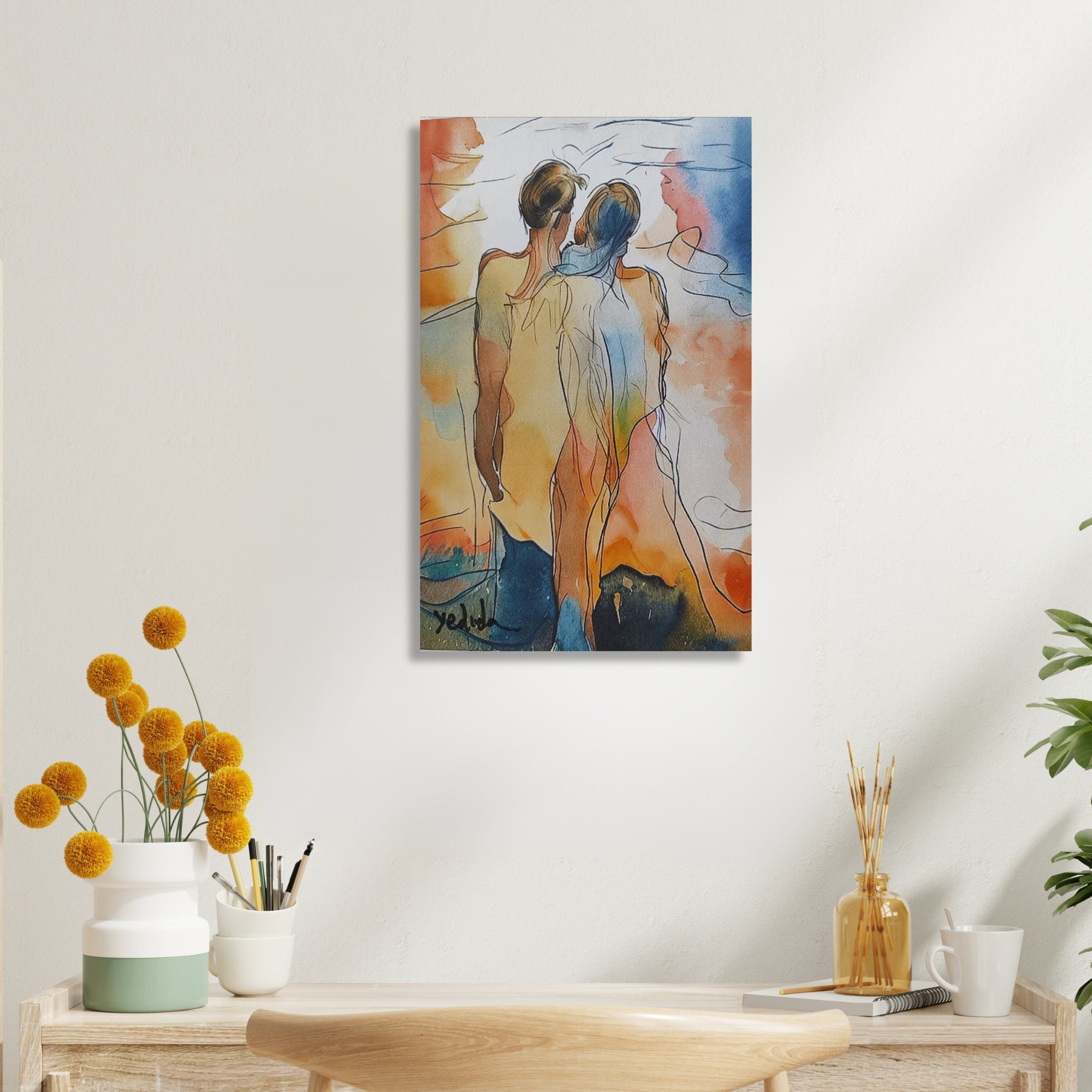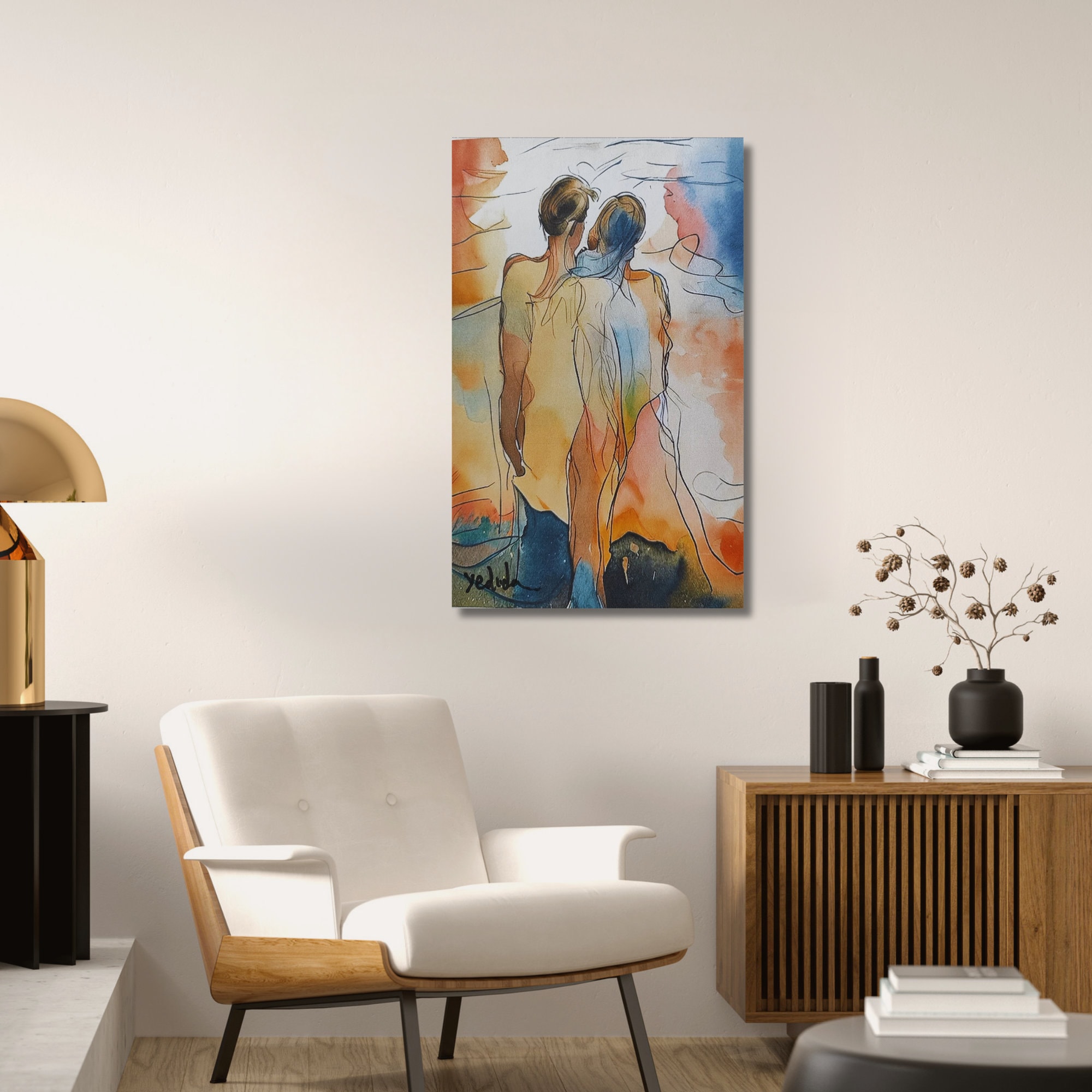 The painting portrays a couple standing together, looking forward into an abstract, dreamlike scene that symbolizes their journey into the future. The figures are intertwined with warm and cool hues, suggesting both unity and the balance of emotions, like passion (red/orange) and calmness (blue/green). The indistinct background merges with their forms, evoking a sense of boundless possibilities and the uncertainty of the future.