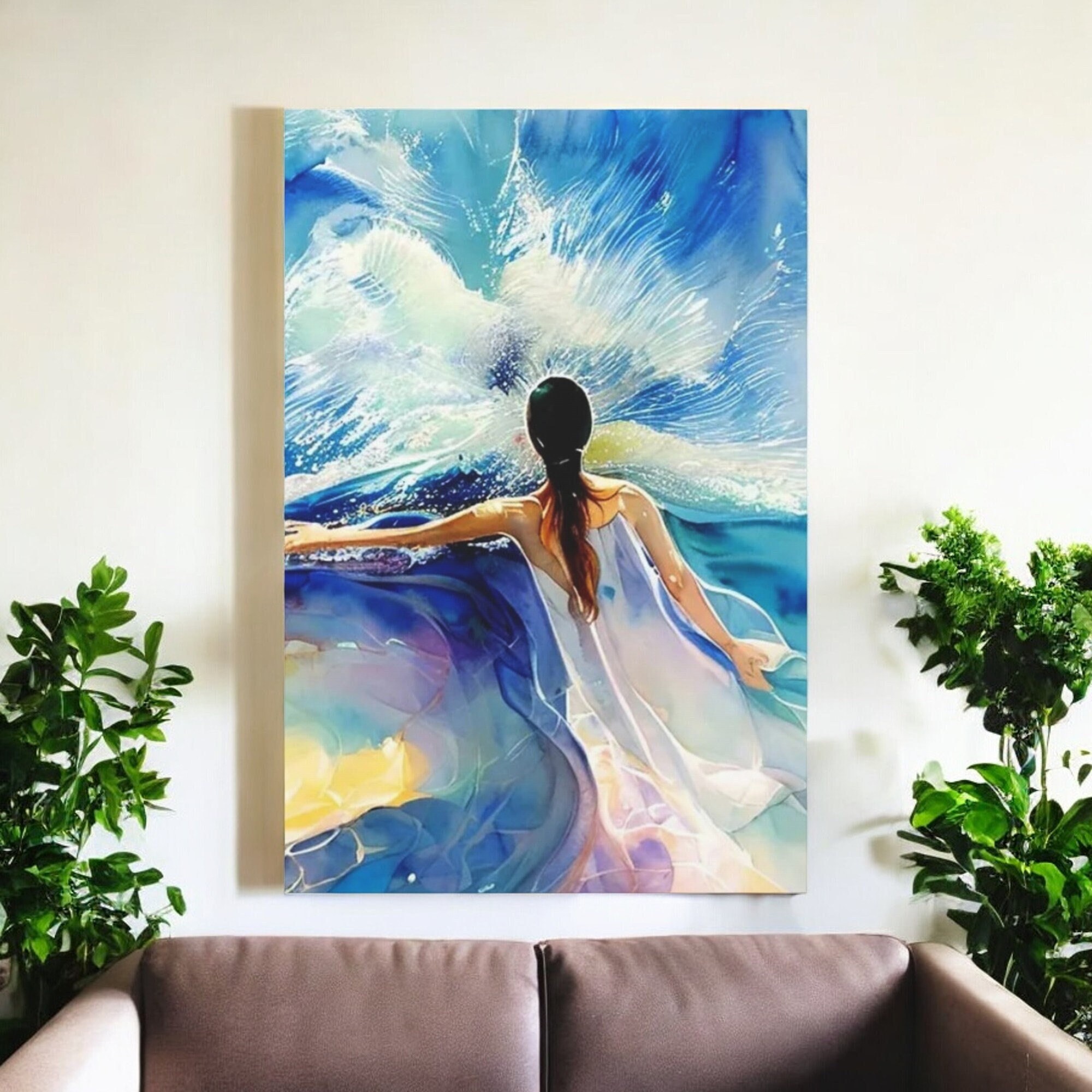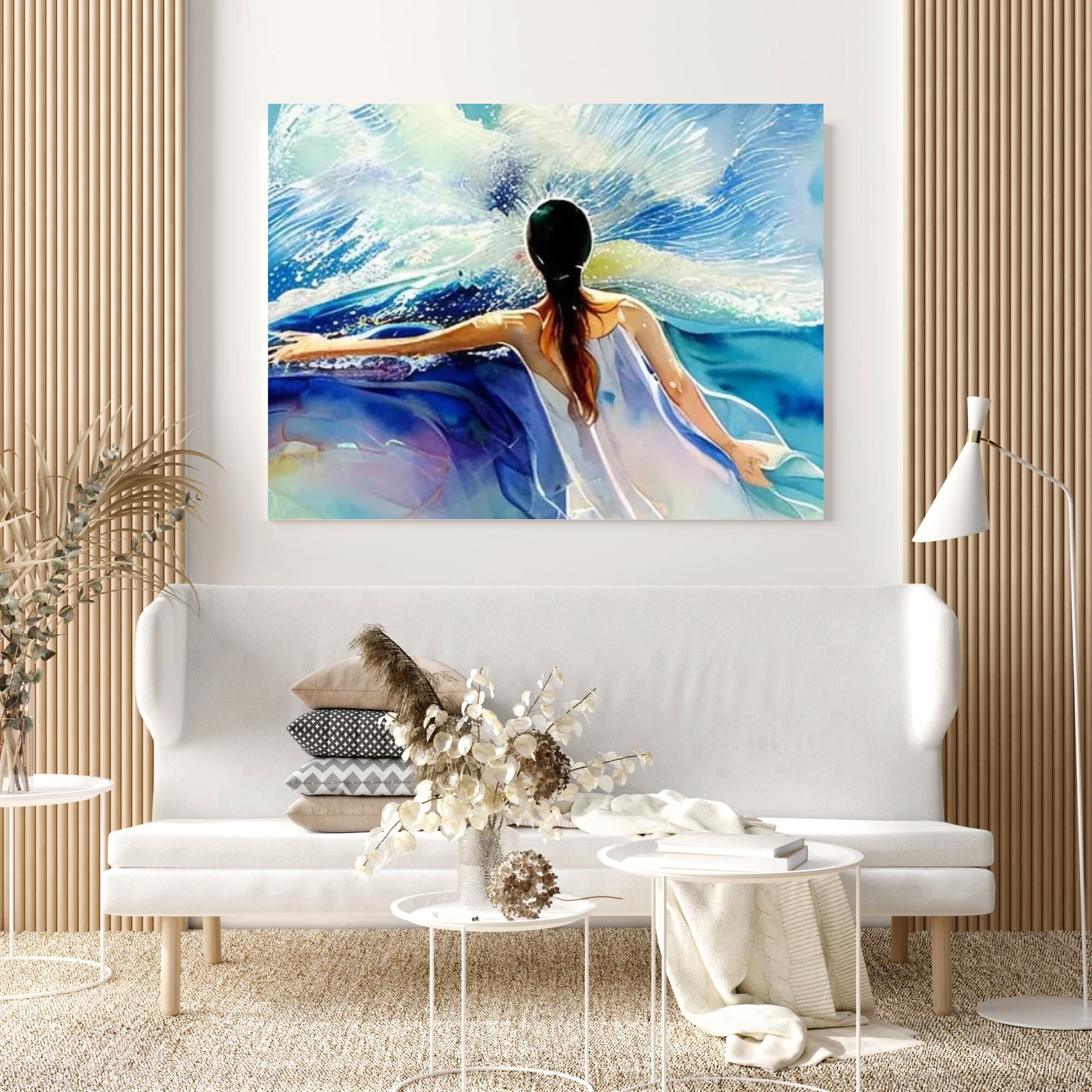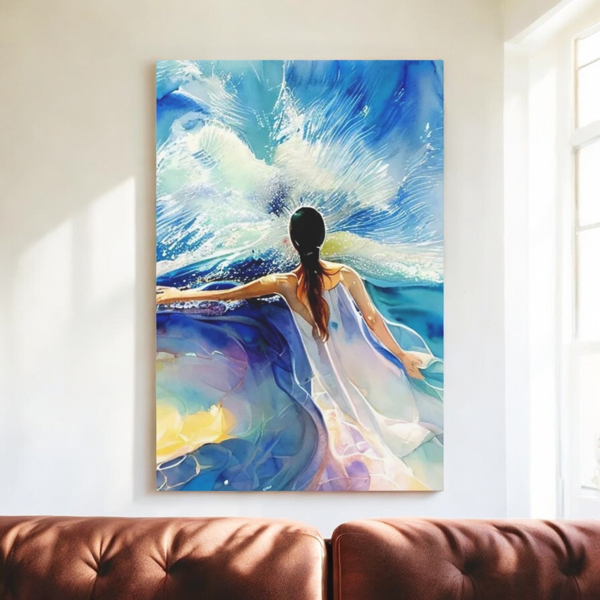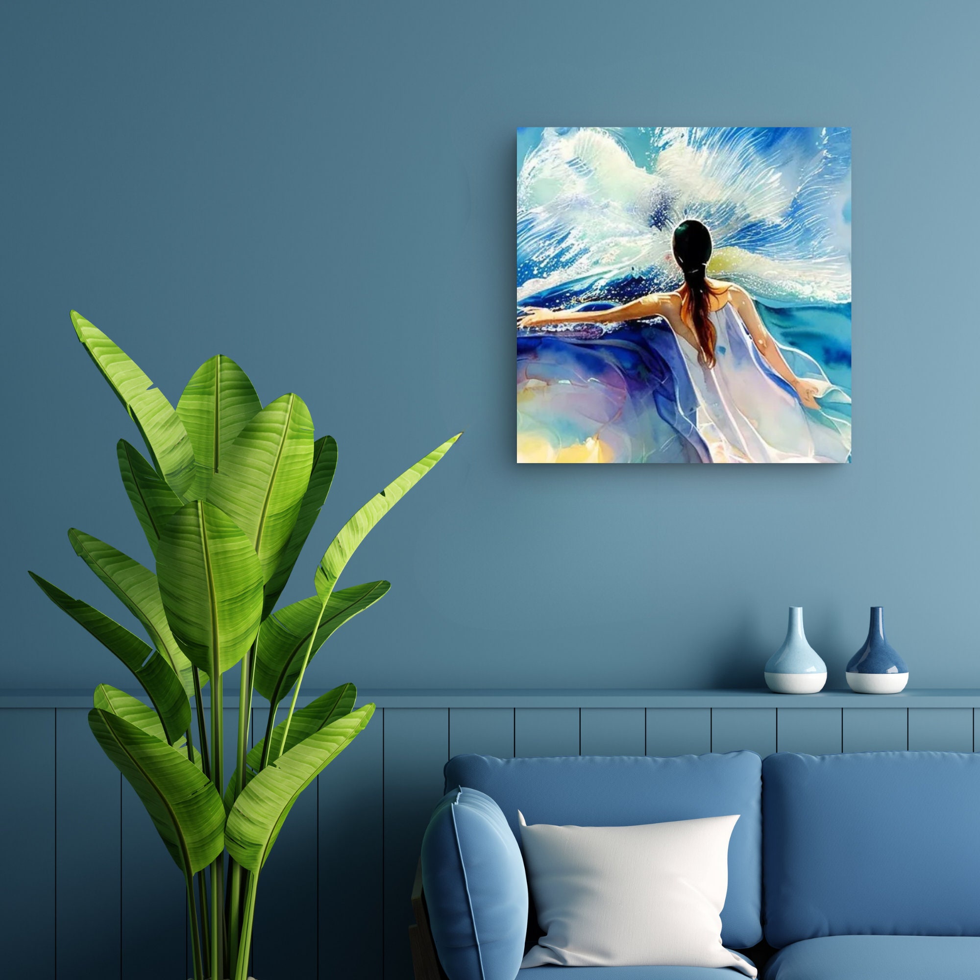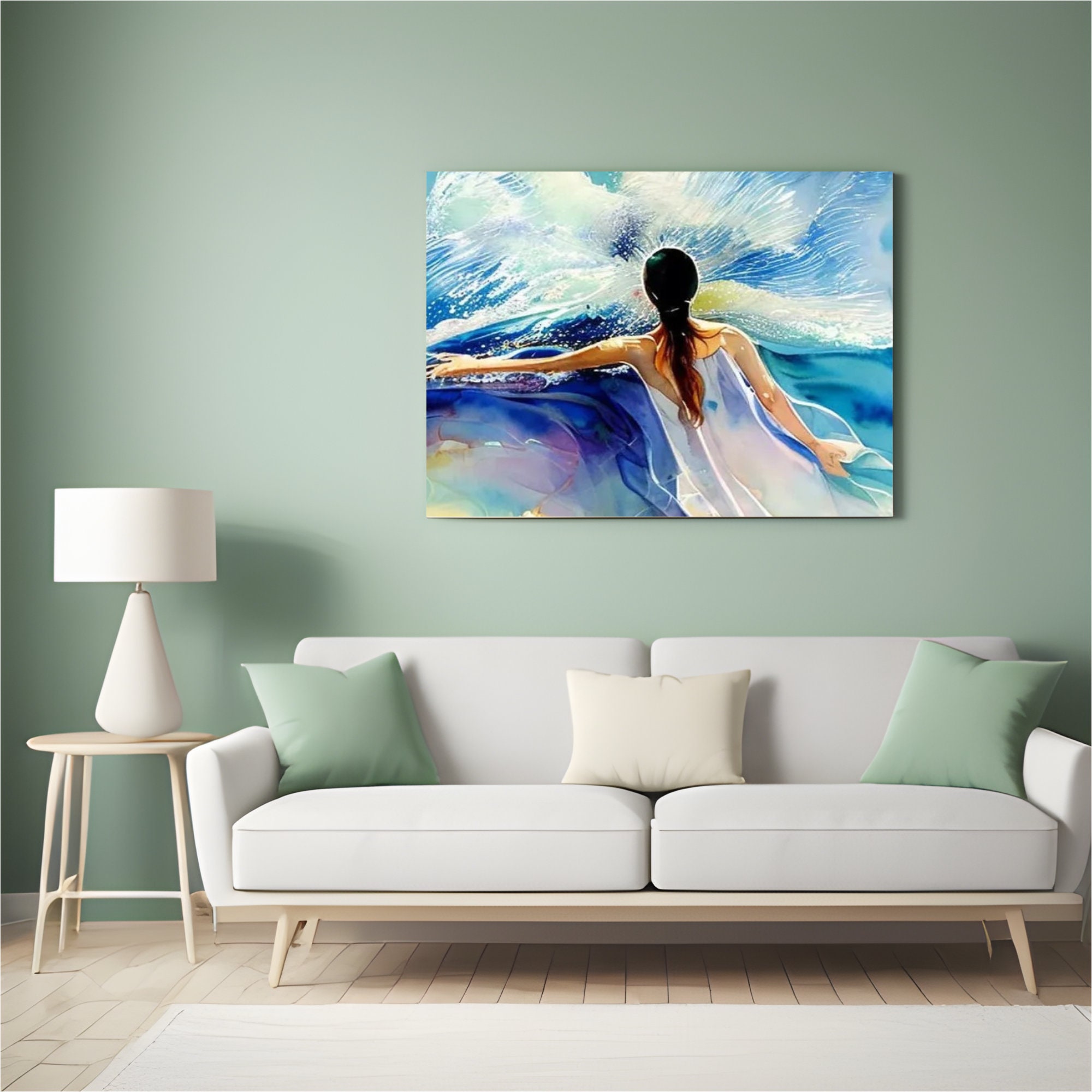 Blue bright woman's figure with bold white dress against a ocean living room wall art