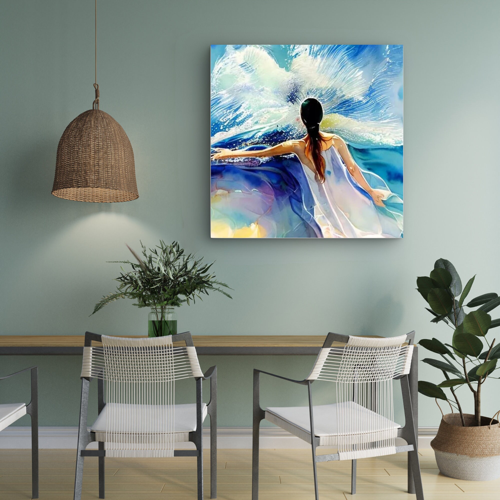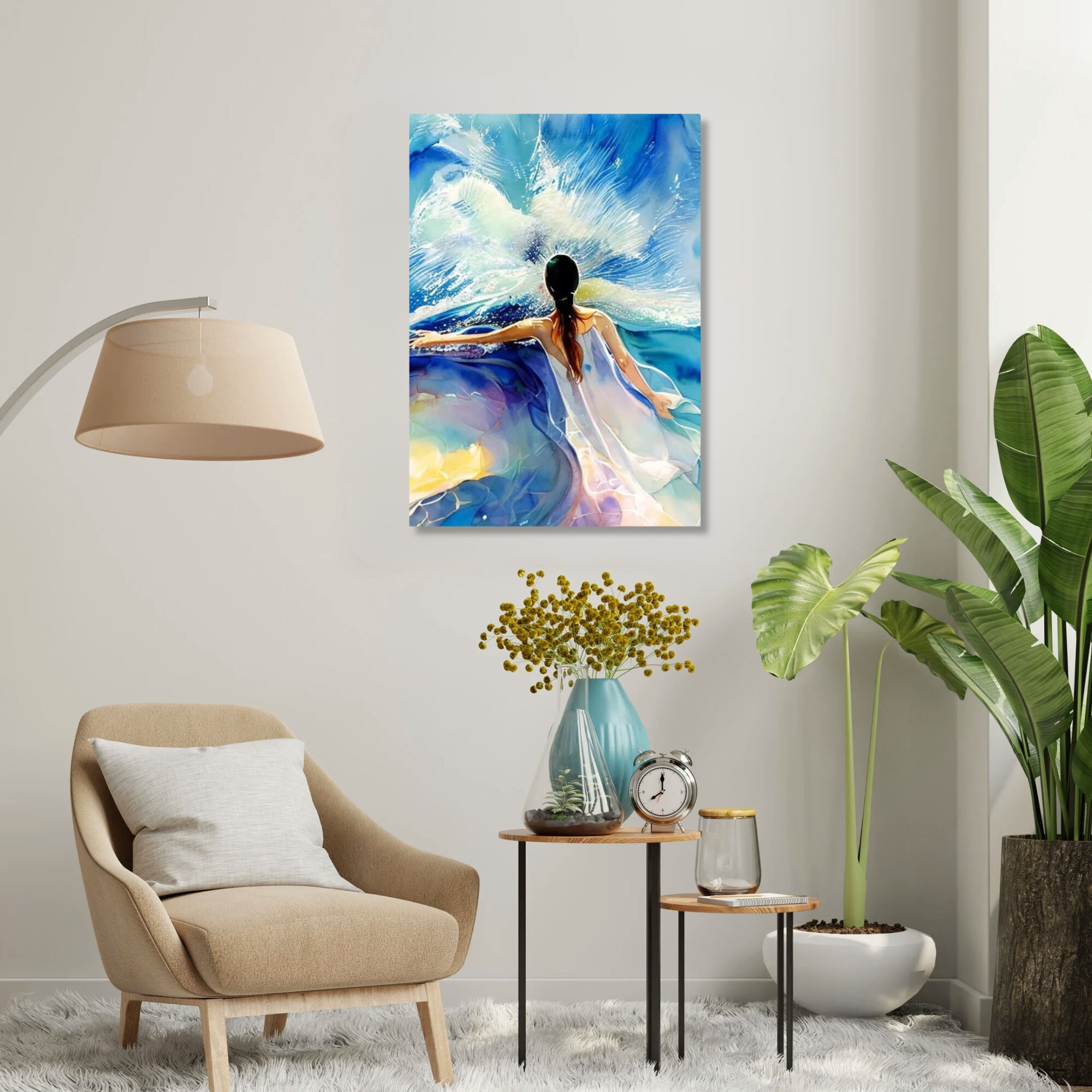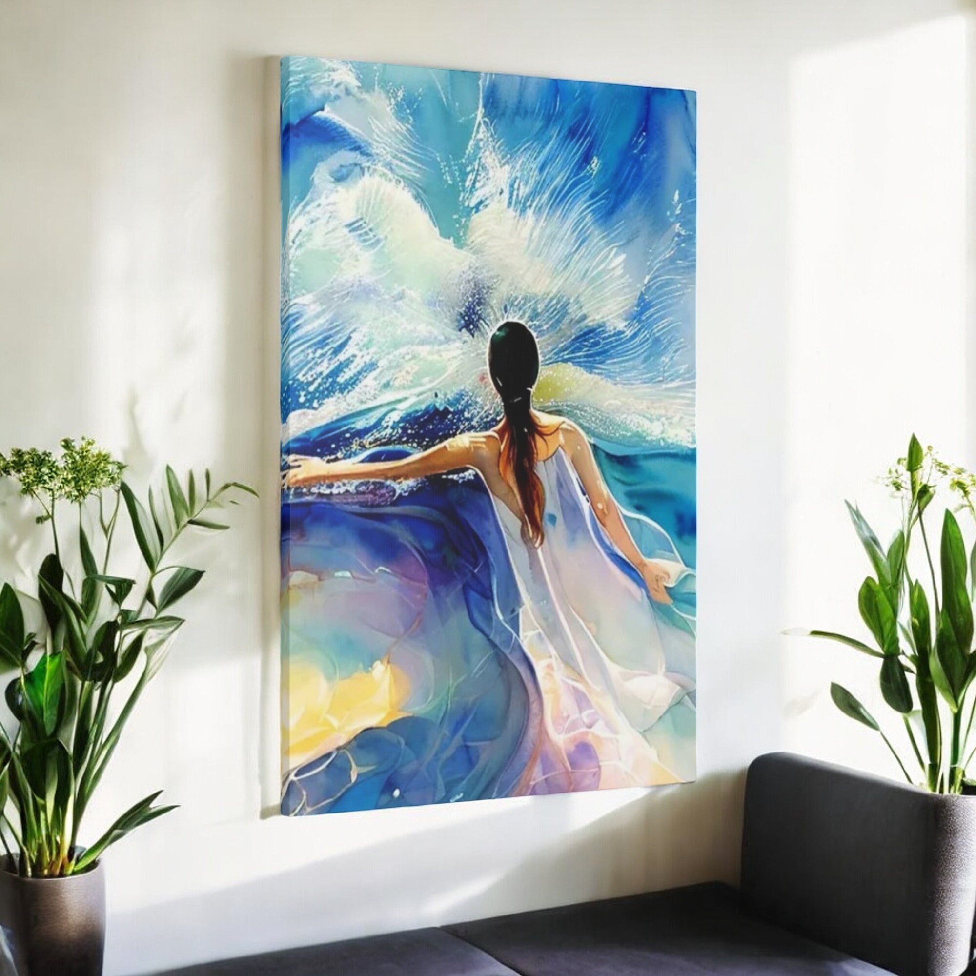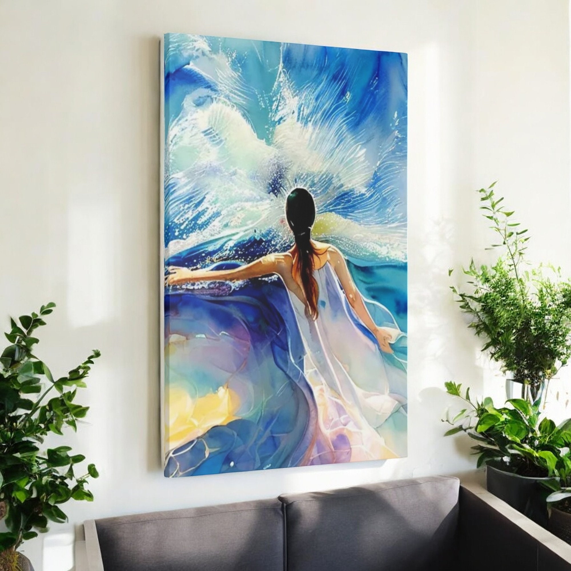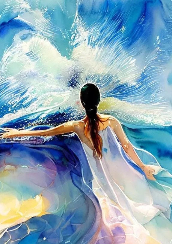 Blue bright woman's figure with bold white dress against a ocean living room wall art