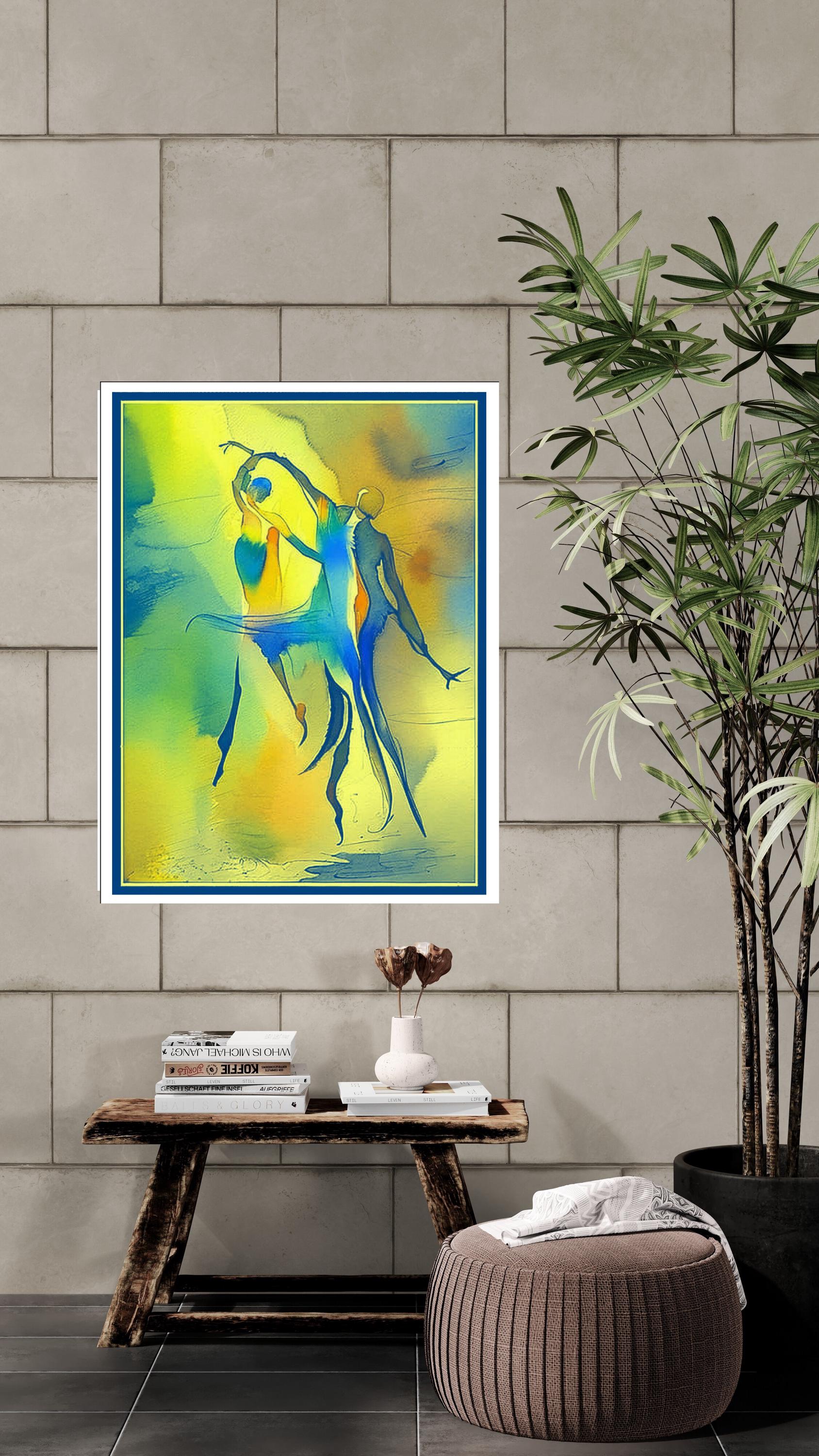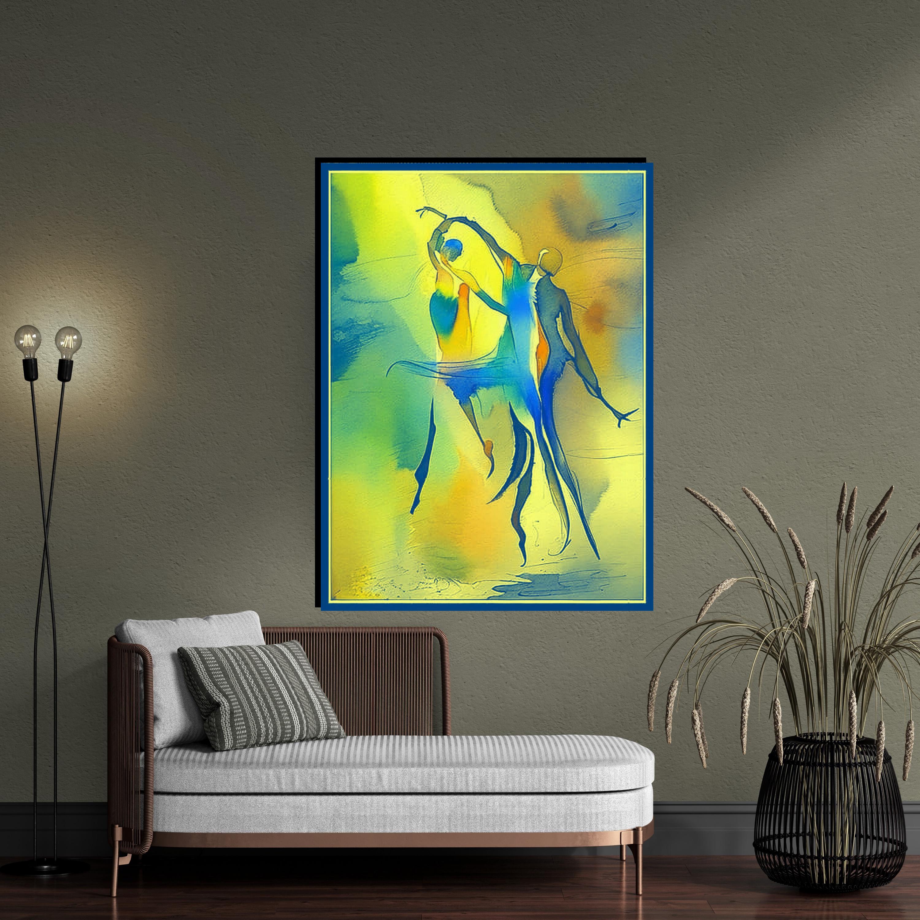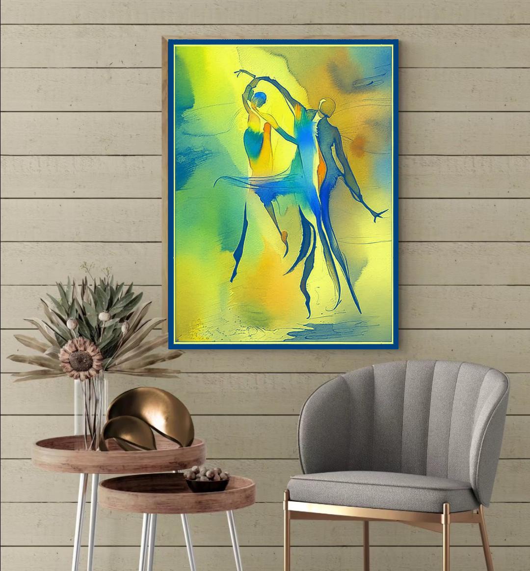 Bring a burst of energy and fluid movement into your home with this stunning abstract watercolor piece. Featuring stylized, elongated silhouettes in a joyful dance, this artwork blends vivid primary tones with soft, ethereal gradients. It is a celebration of human connection, rhythm, and the beauty of motion.