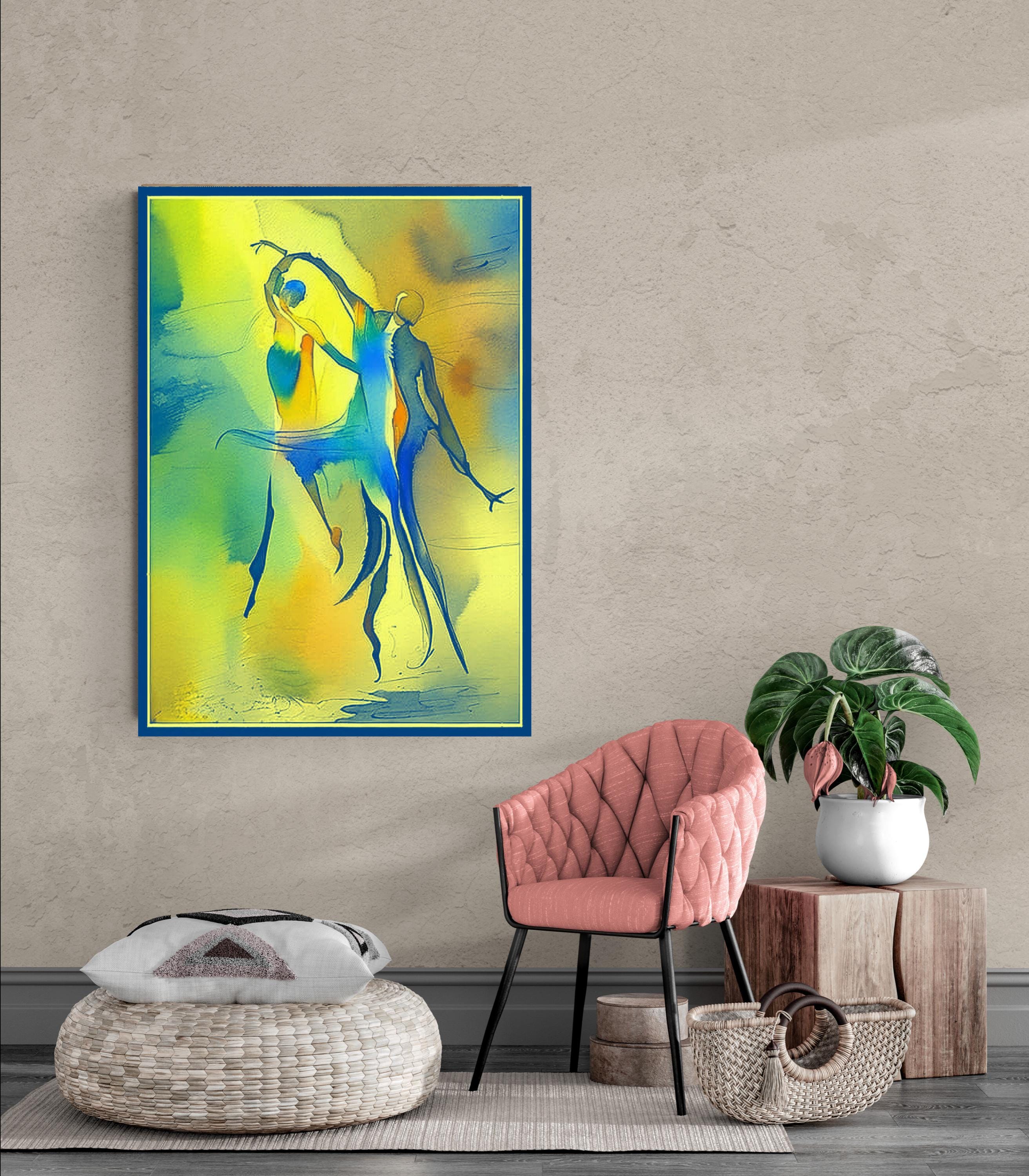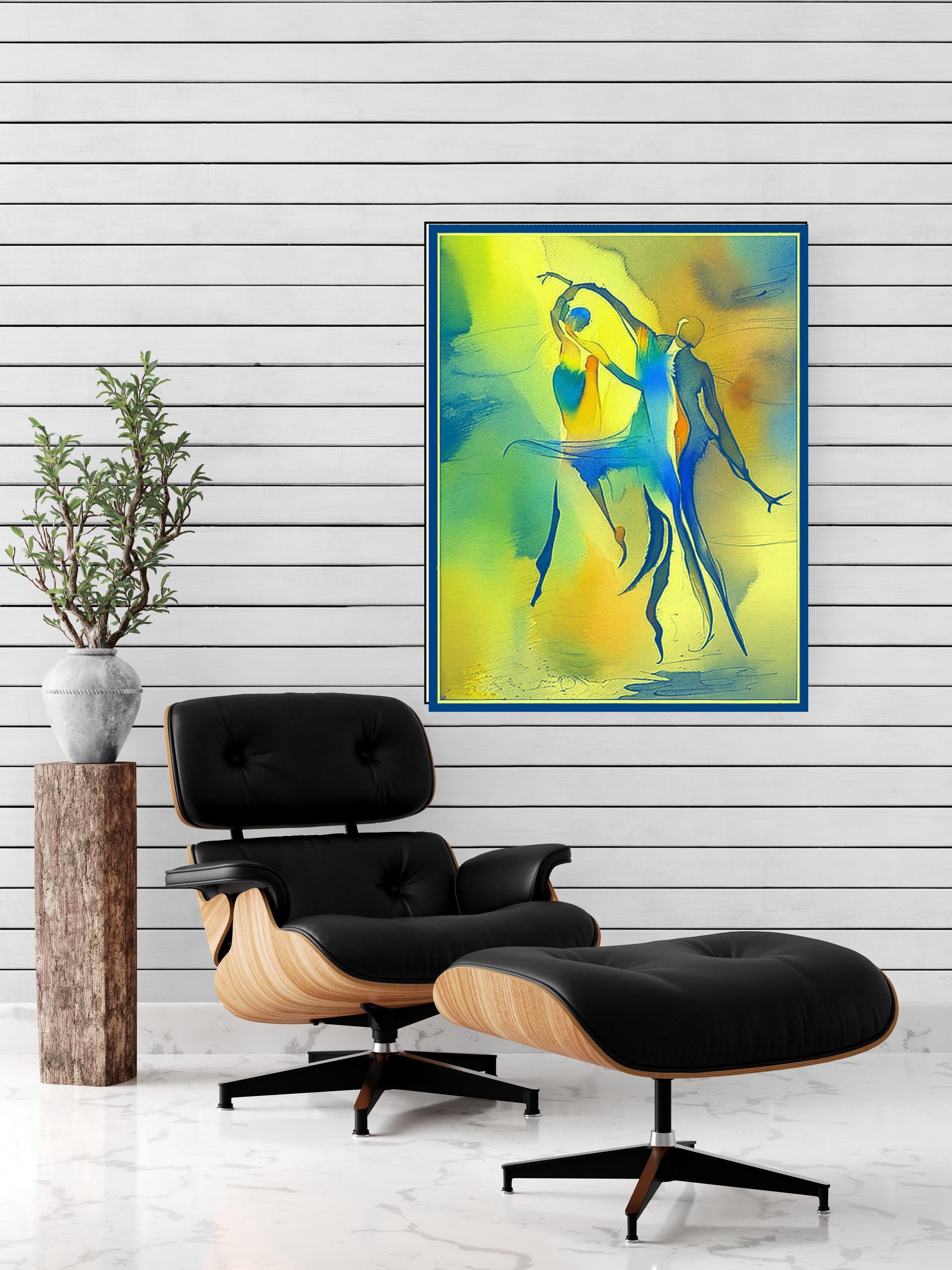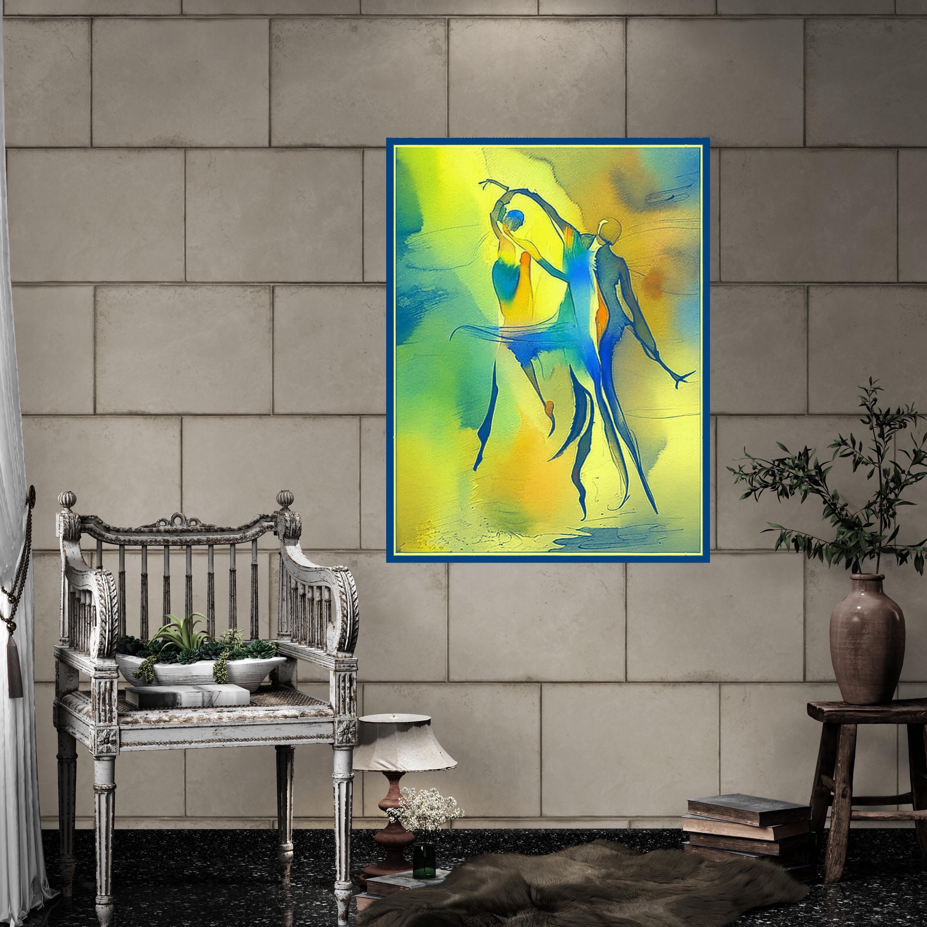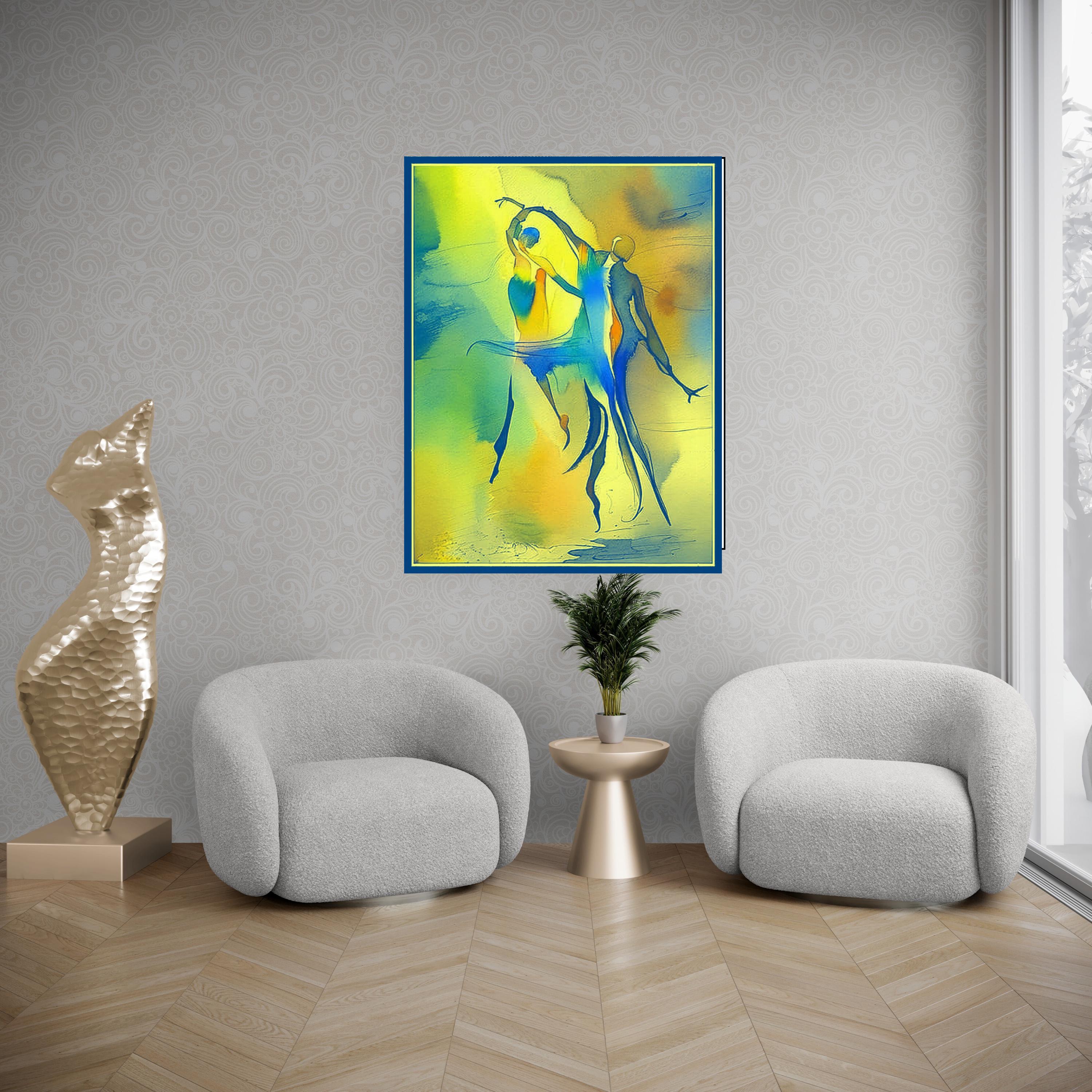 Bring a burst of energy and fluid movement into your home with this stunning abstract watercolor piece. Featuring stylized, elongated silhouettes in a joyful dance, this artwork blends vivid primary tones with soft, ethereal gradients. It is a celebration of human connection, rhythm, and the beauty of motion.
