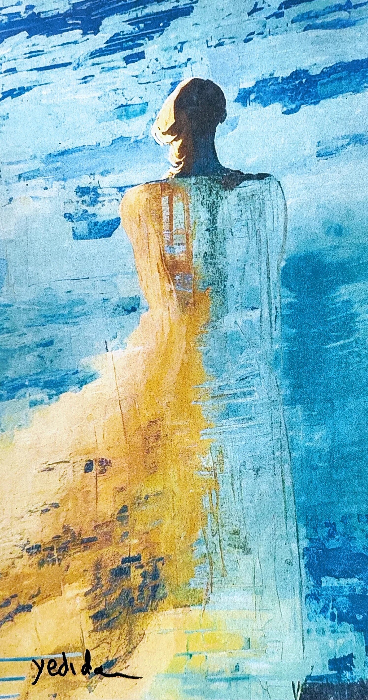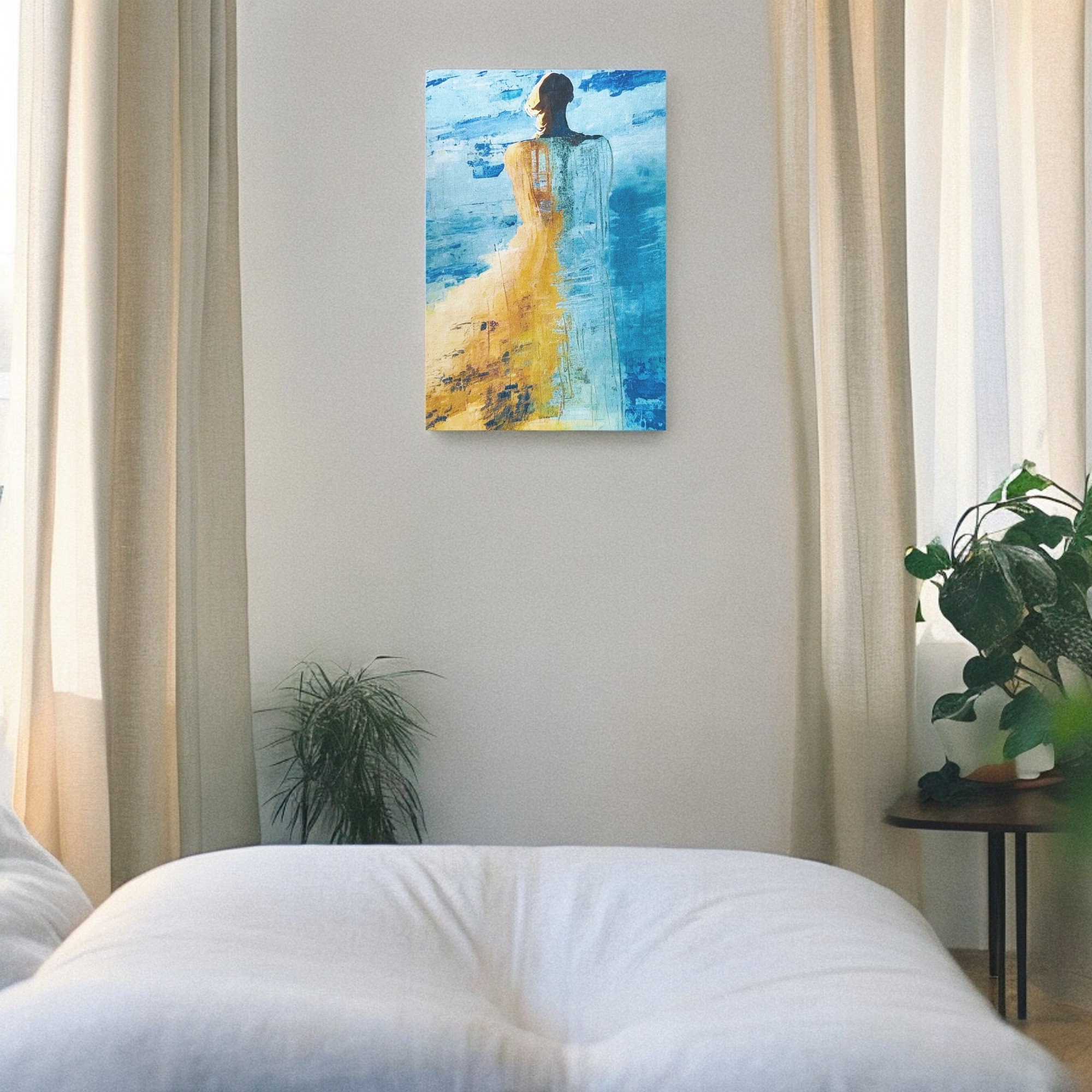 The painting depicts a woman in a flowing, ethereal gown, standing gracefully against a vast blue void. Her long gown trails behind her, blending into the color of the background. her body feels that somethings within the void appear to beckon her, creating a sense of mystery, as if a hidden destiny