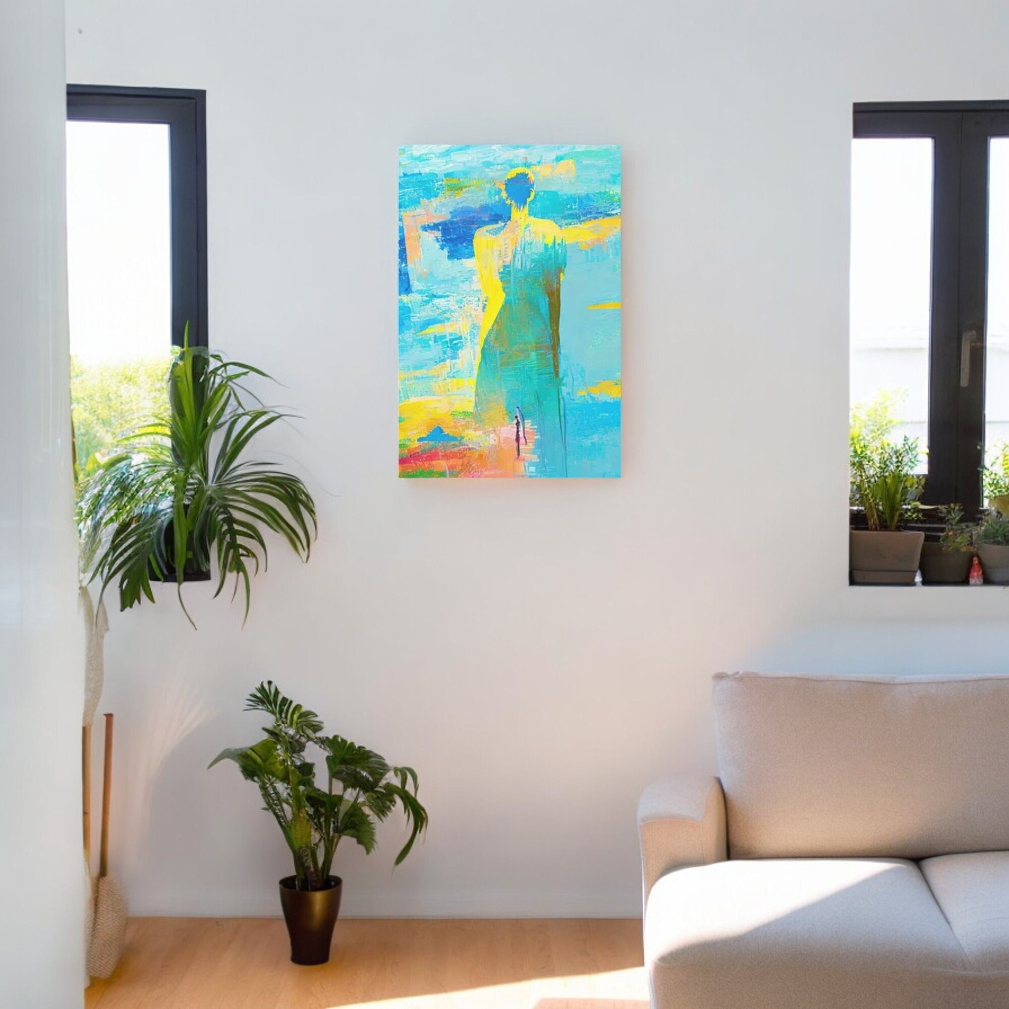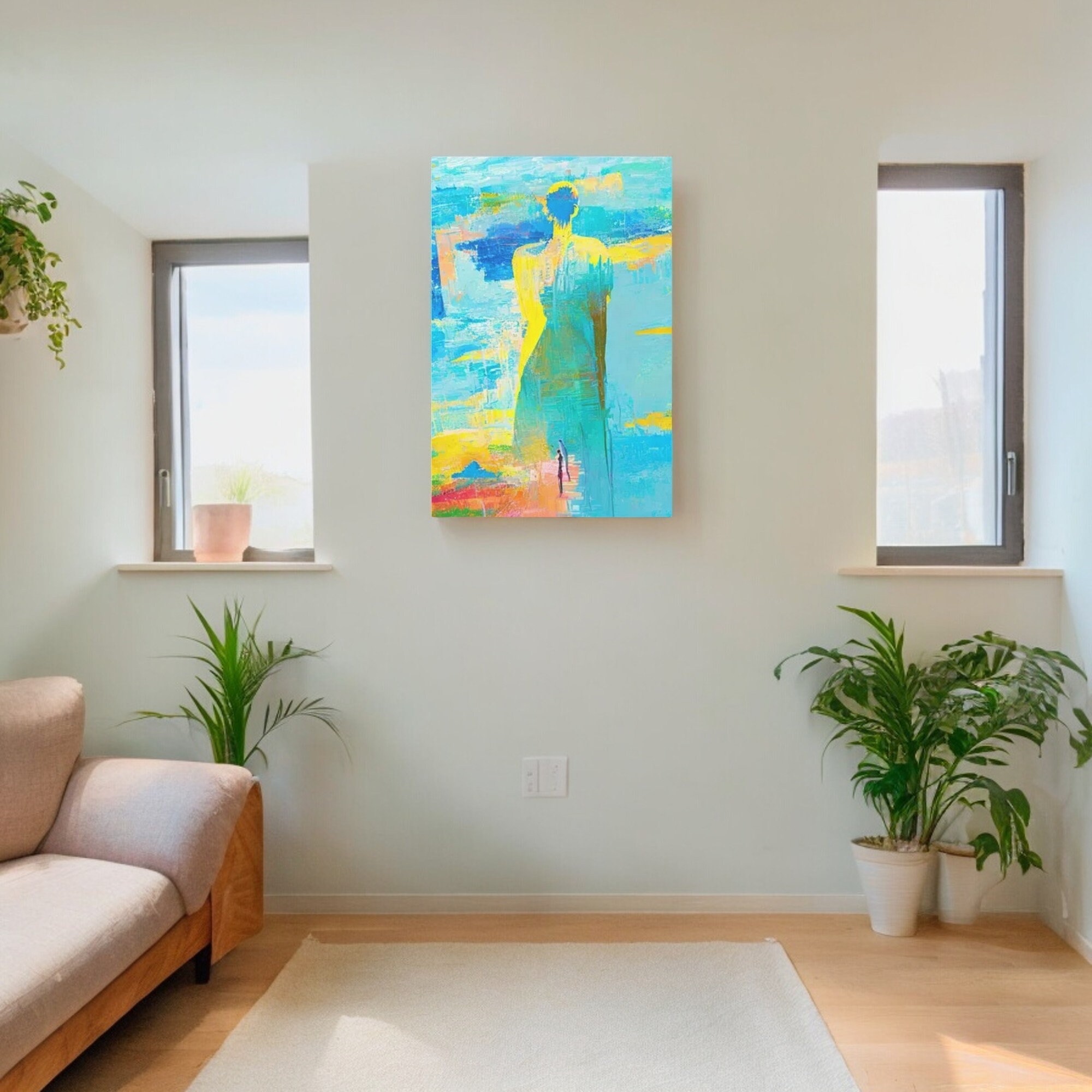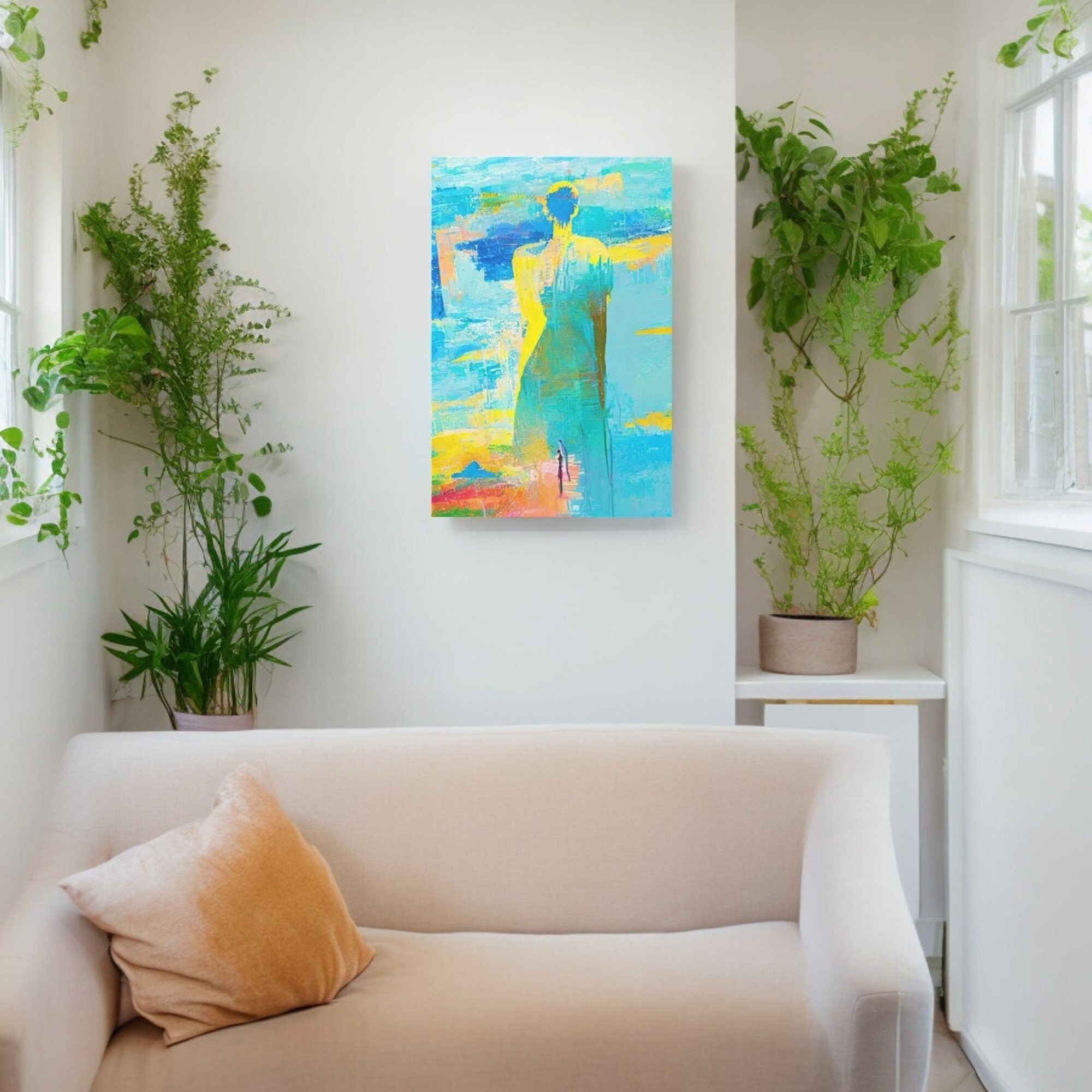 Figurative abstract painting of a woman with a long gown, wall art living room Home decor. Abstract canvas art of a forward woman to a view we can only imagine. living room acrylic painting,