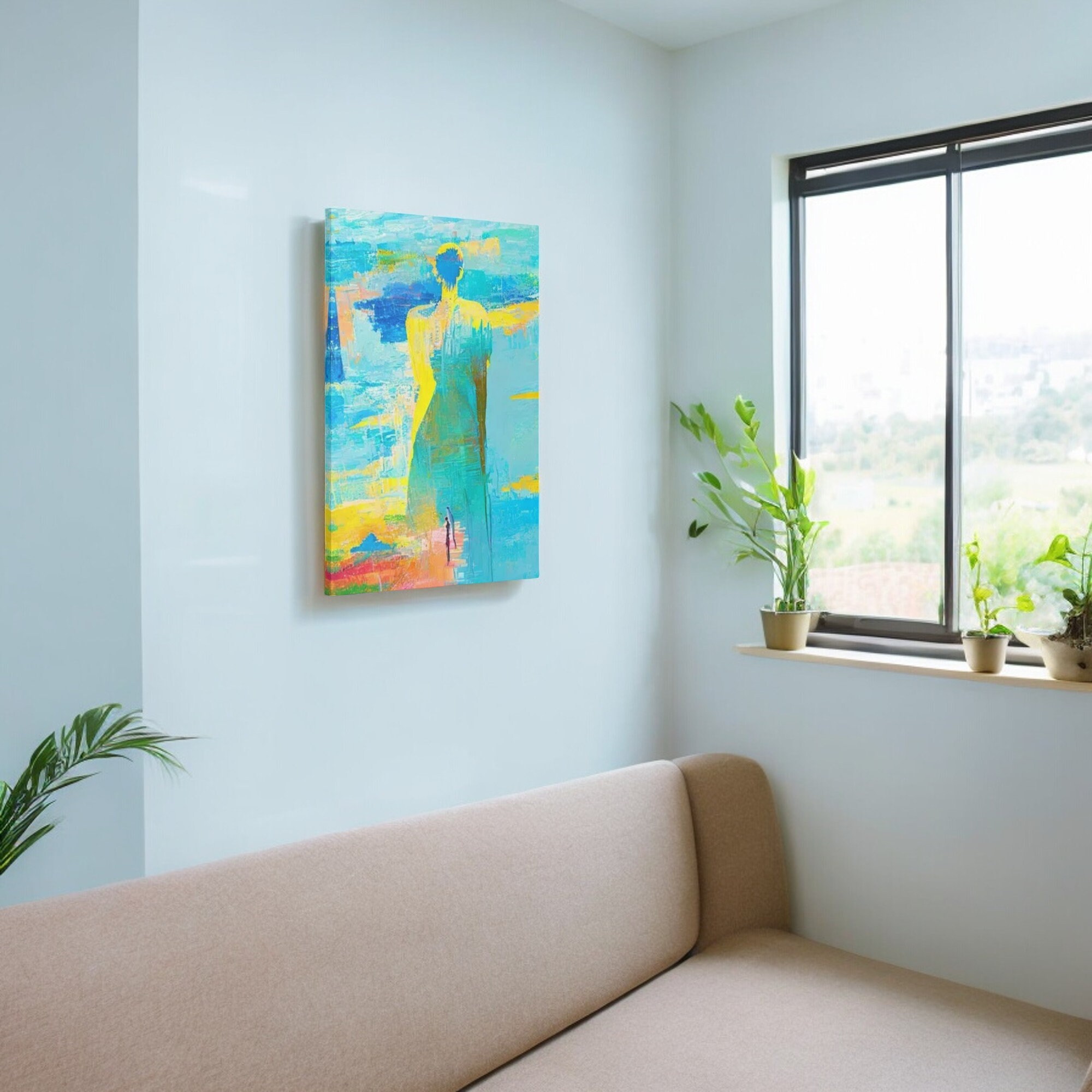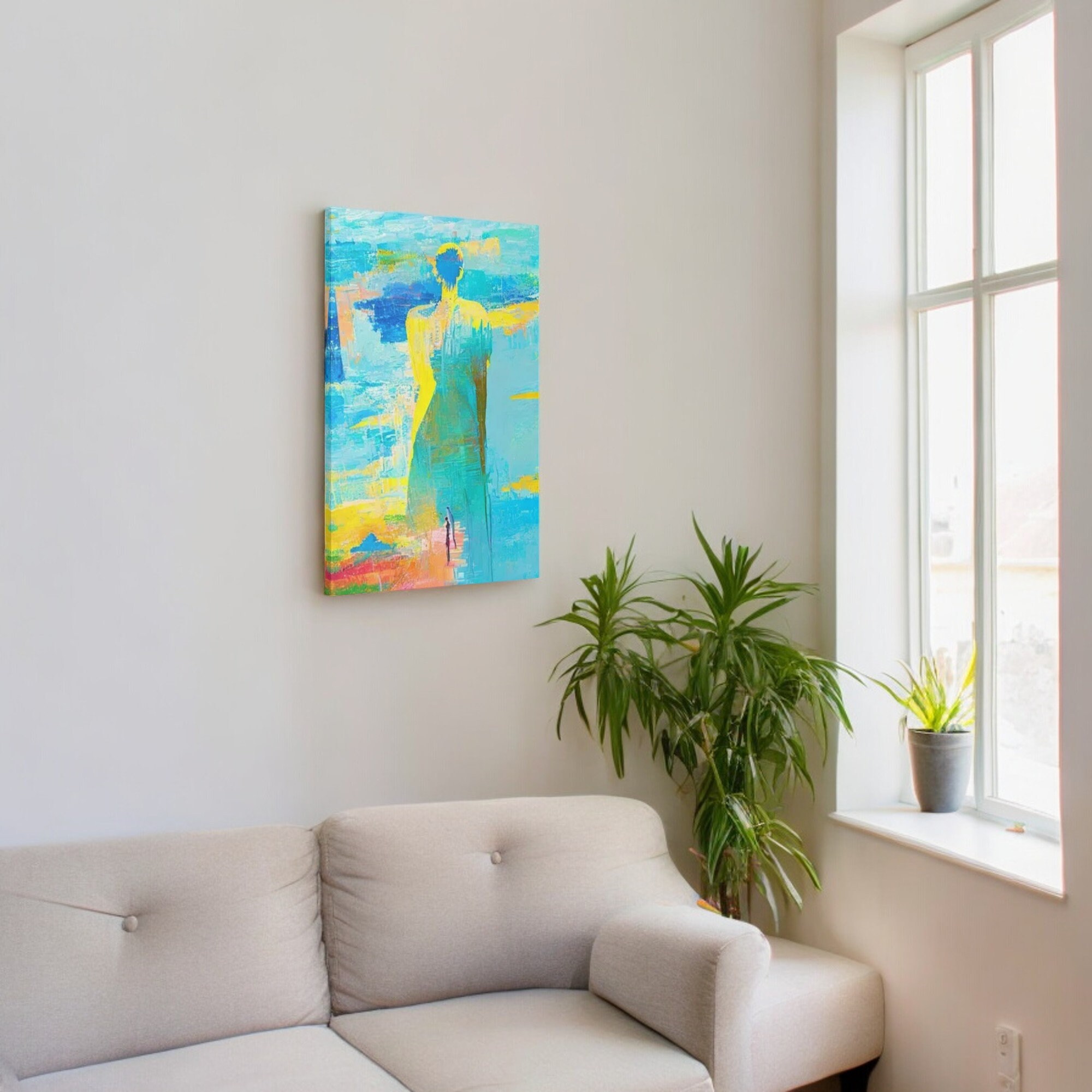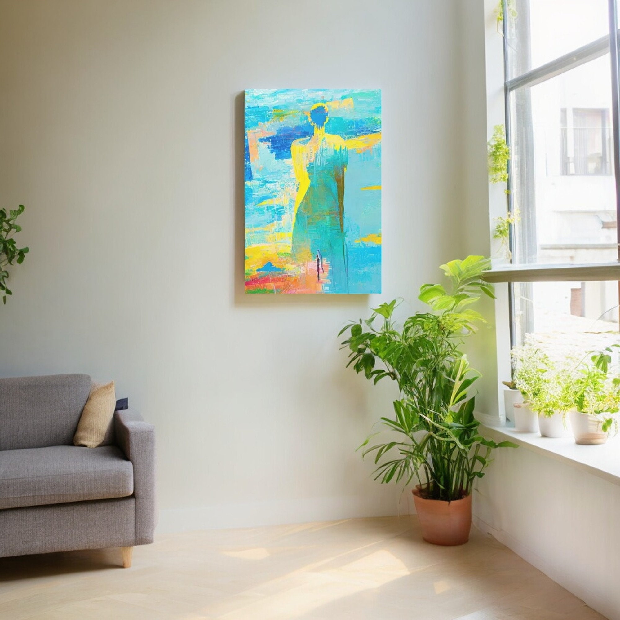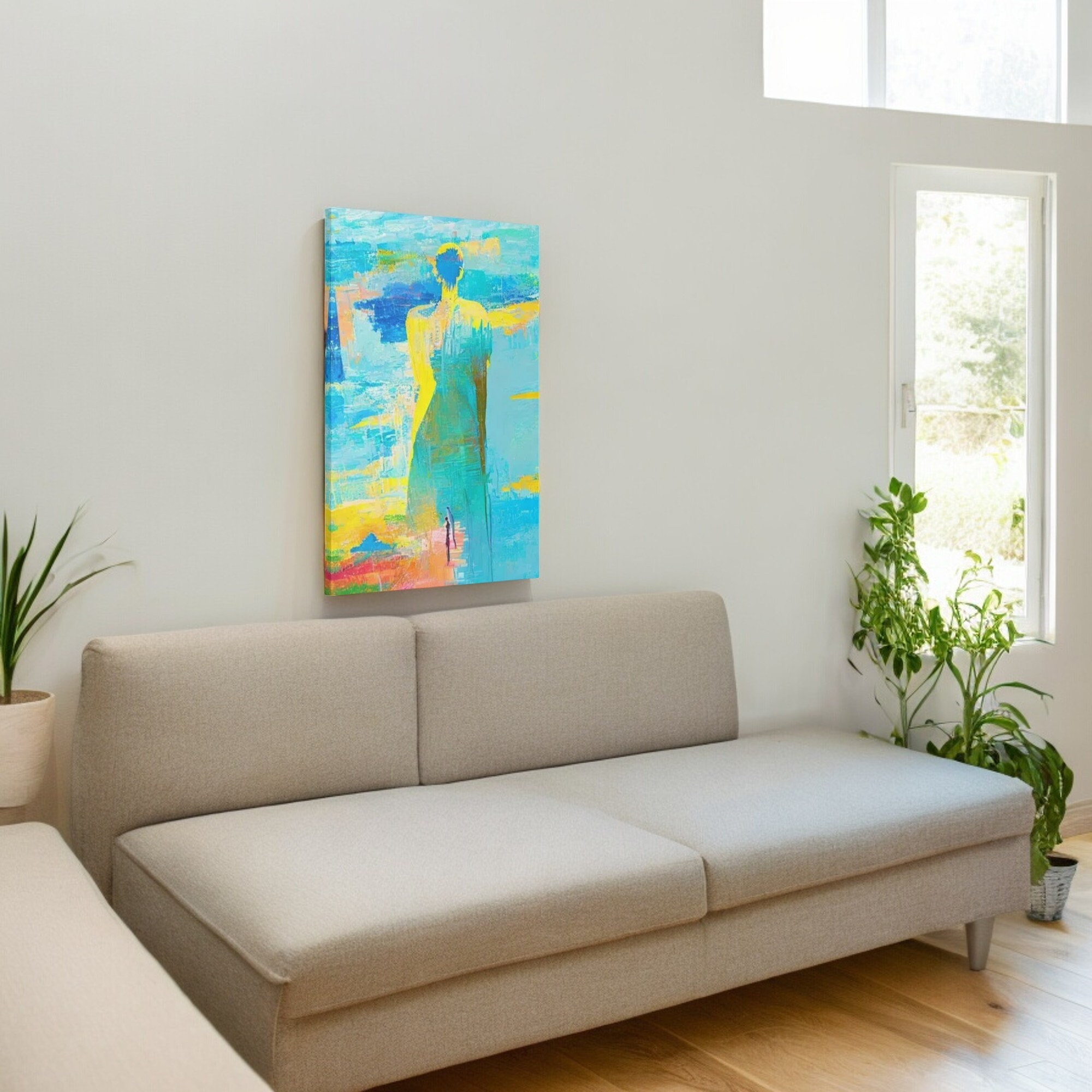 Figurative abstract painting of a woman with a long gown, wall art living room Home decor. Abstract canvas art of a forward woman to a view we can only imagine. living room acrylic painting,