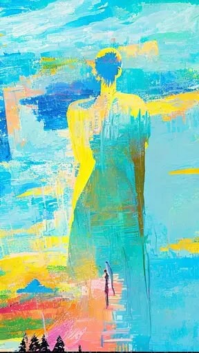 This abstract painting portrays the silhouette of a woman's figure painted with bold yellow against a bright blue