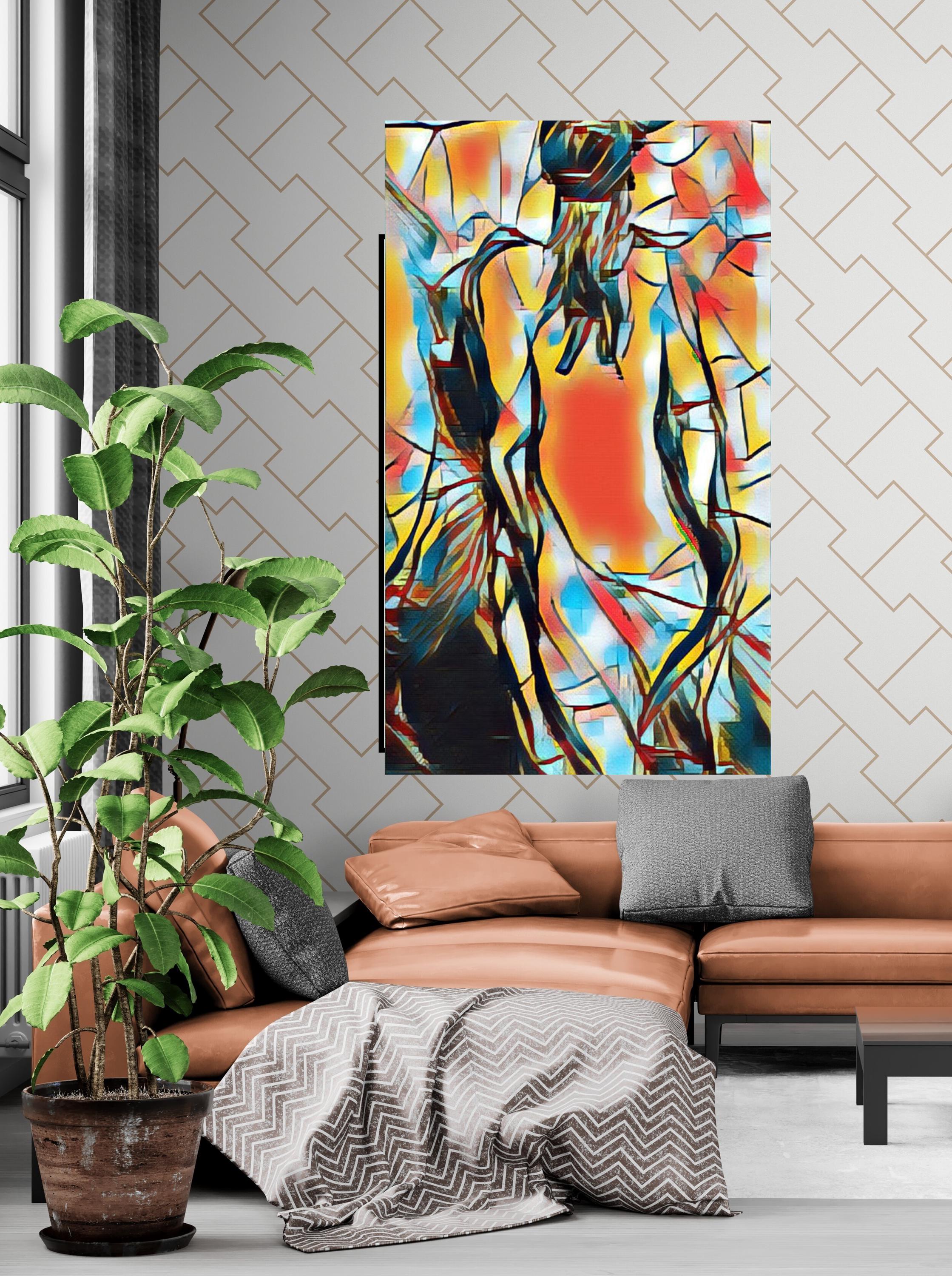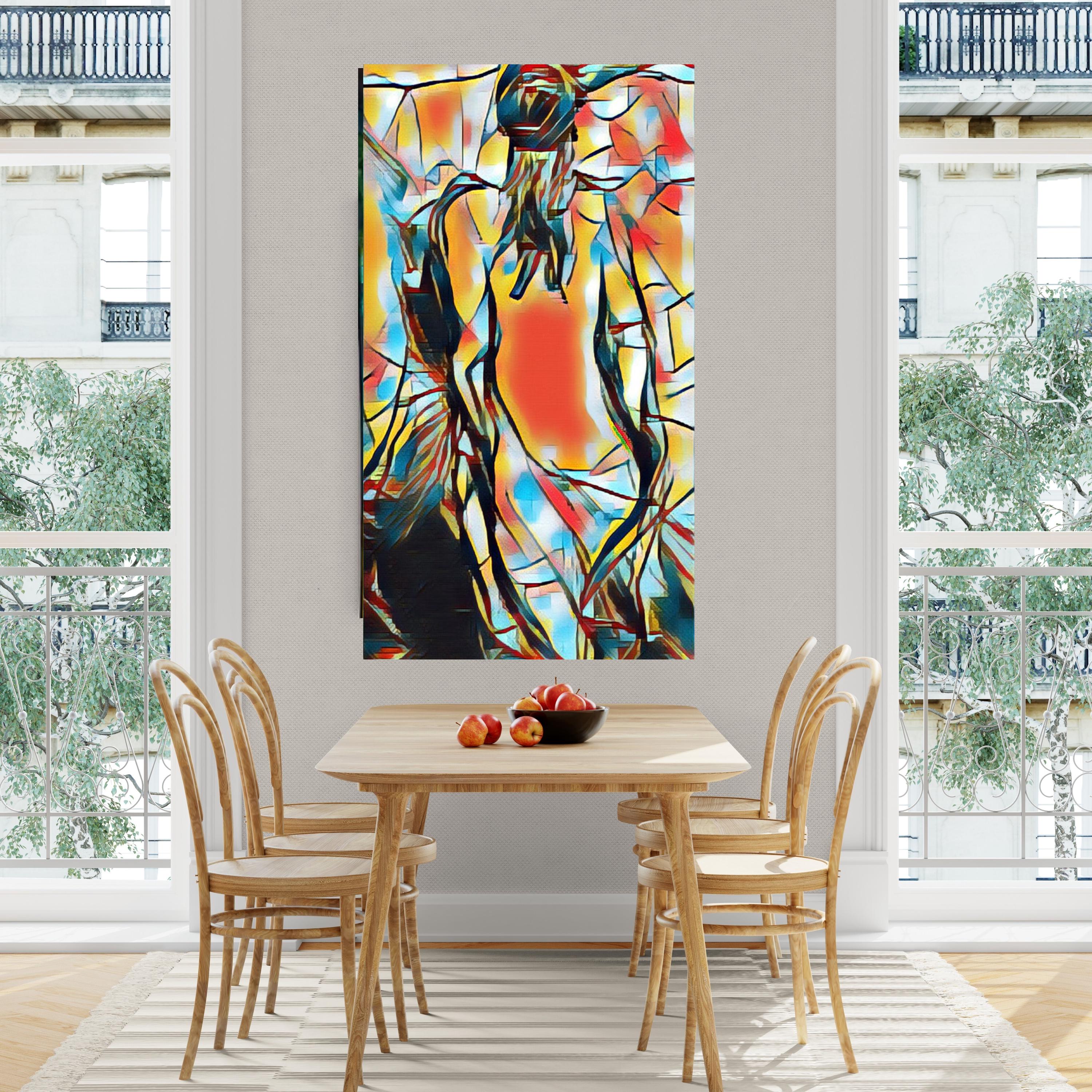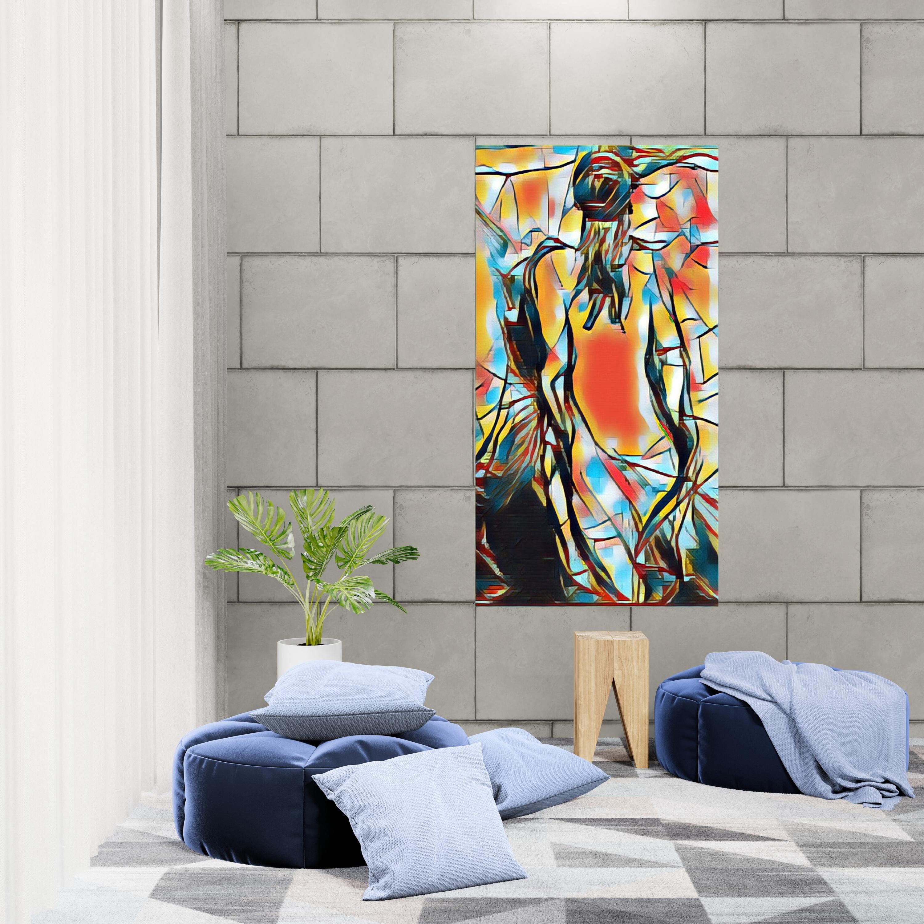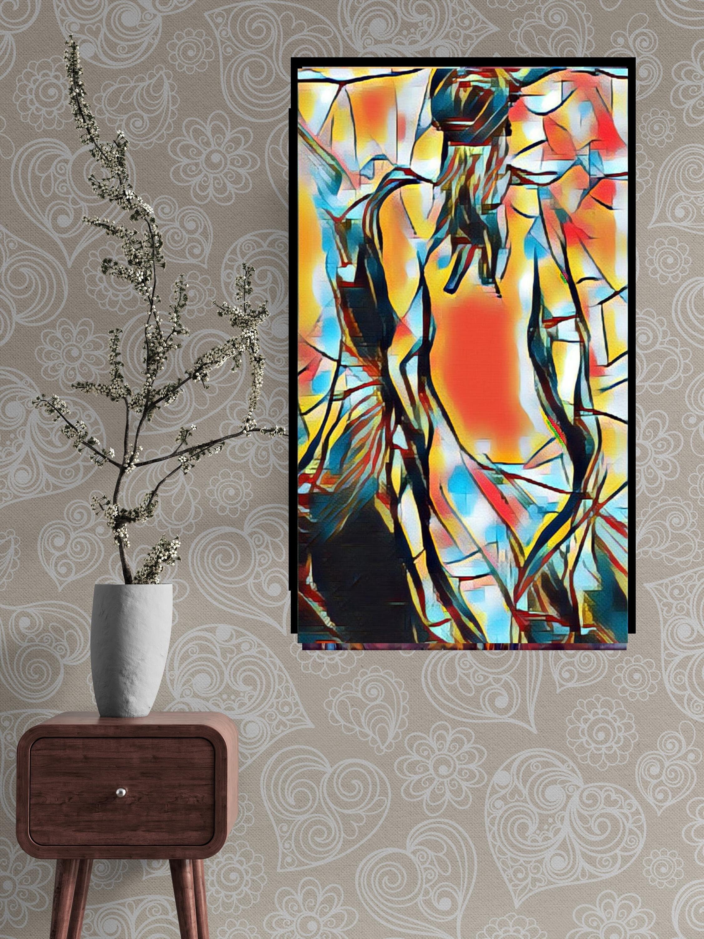 This striking print on canvas showcases an abstract, colorful representation of a woman's back, blending flowing, sketch-like lines with geometric accents. The artwork exudes elegance and emotion, creating a sense of depth and motion. Printed on high-quality canvas, this piece is perfect for adding a touch of sophistication to any space, whether displayed in a living room, bedroom, or office. The buyer can choose from multiple sizes to suit their needs, allowing for customized home décor. This unframed print arrives ready for the buyer to frame or mount as desired.