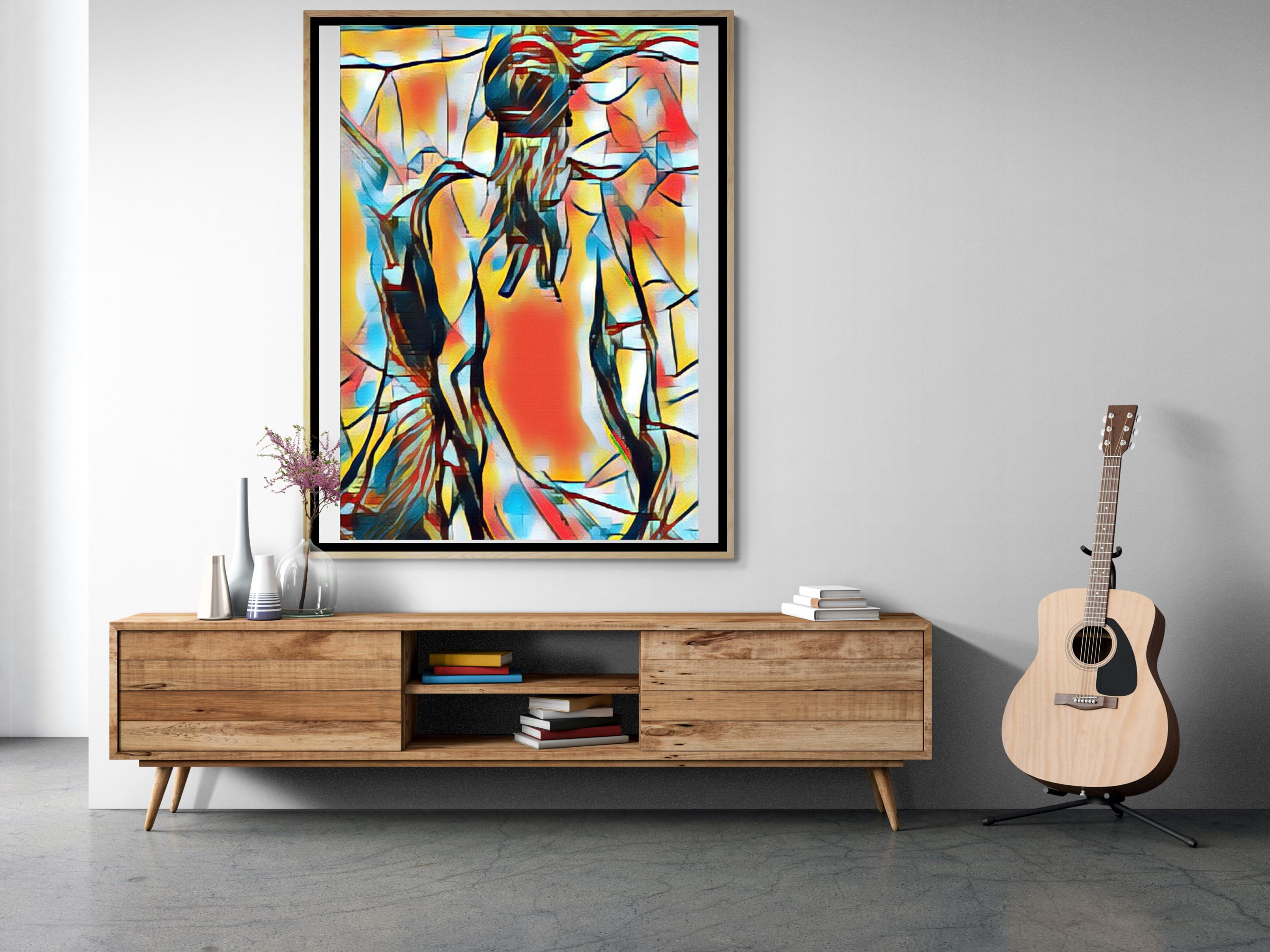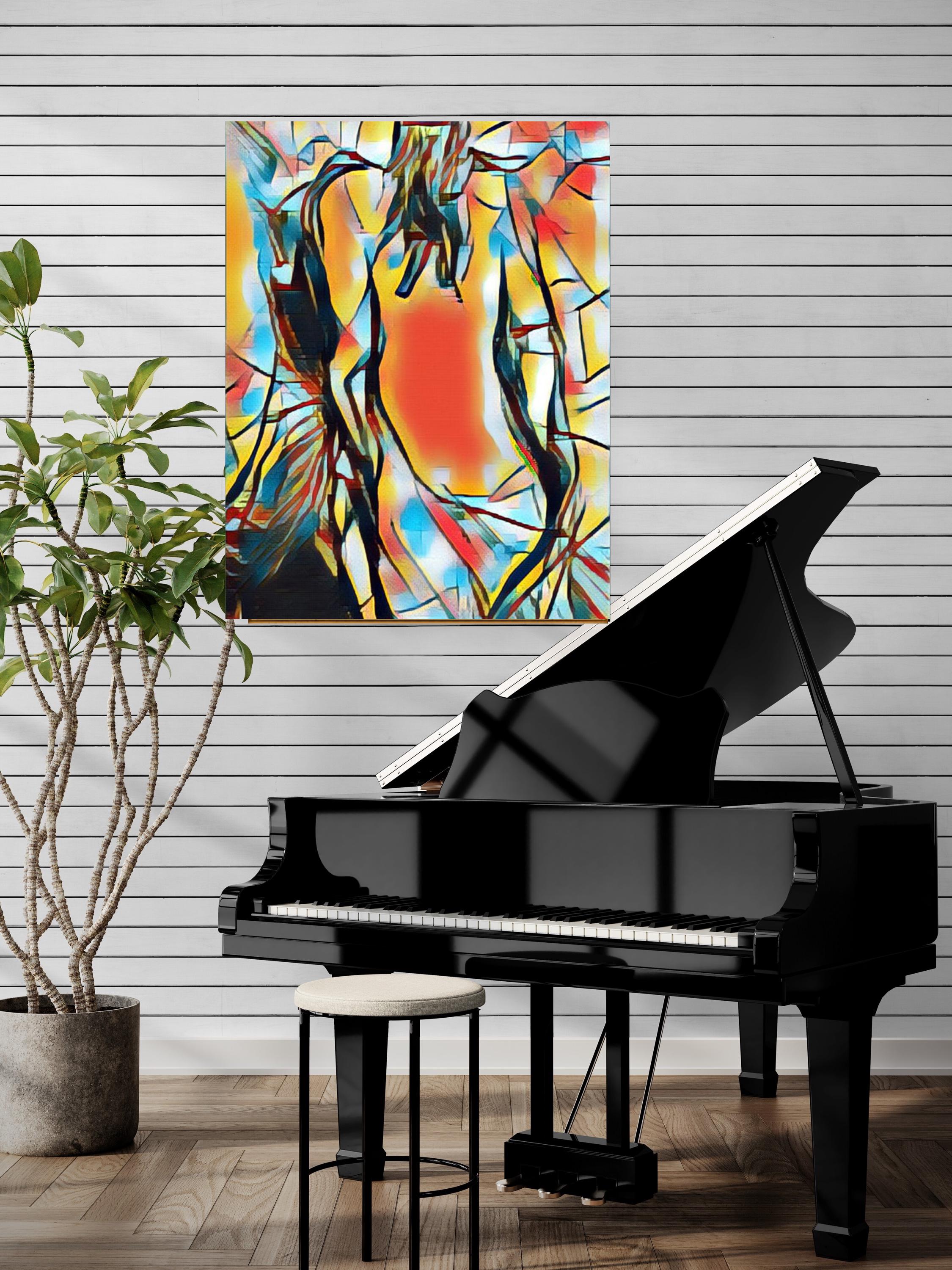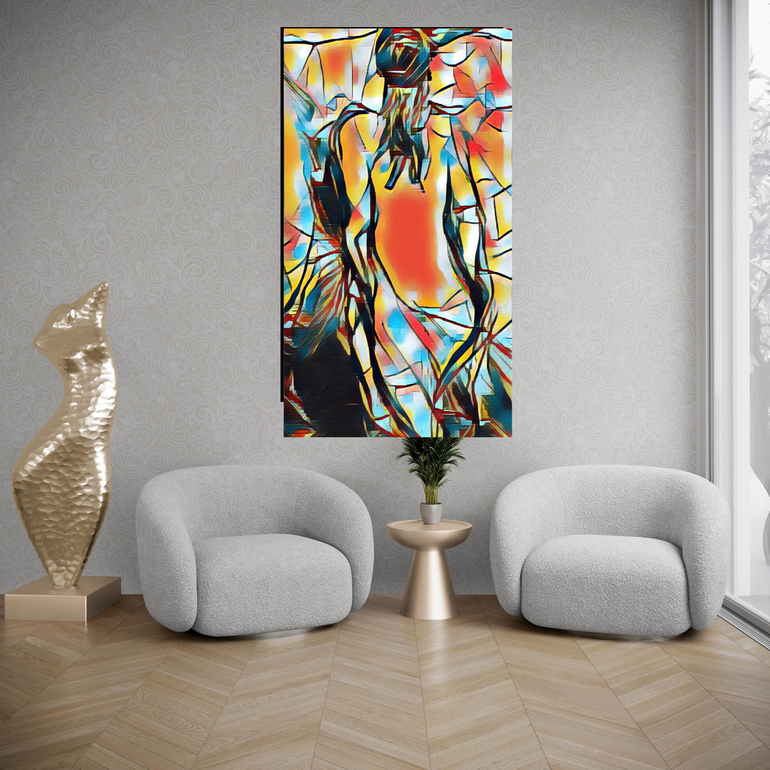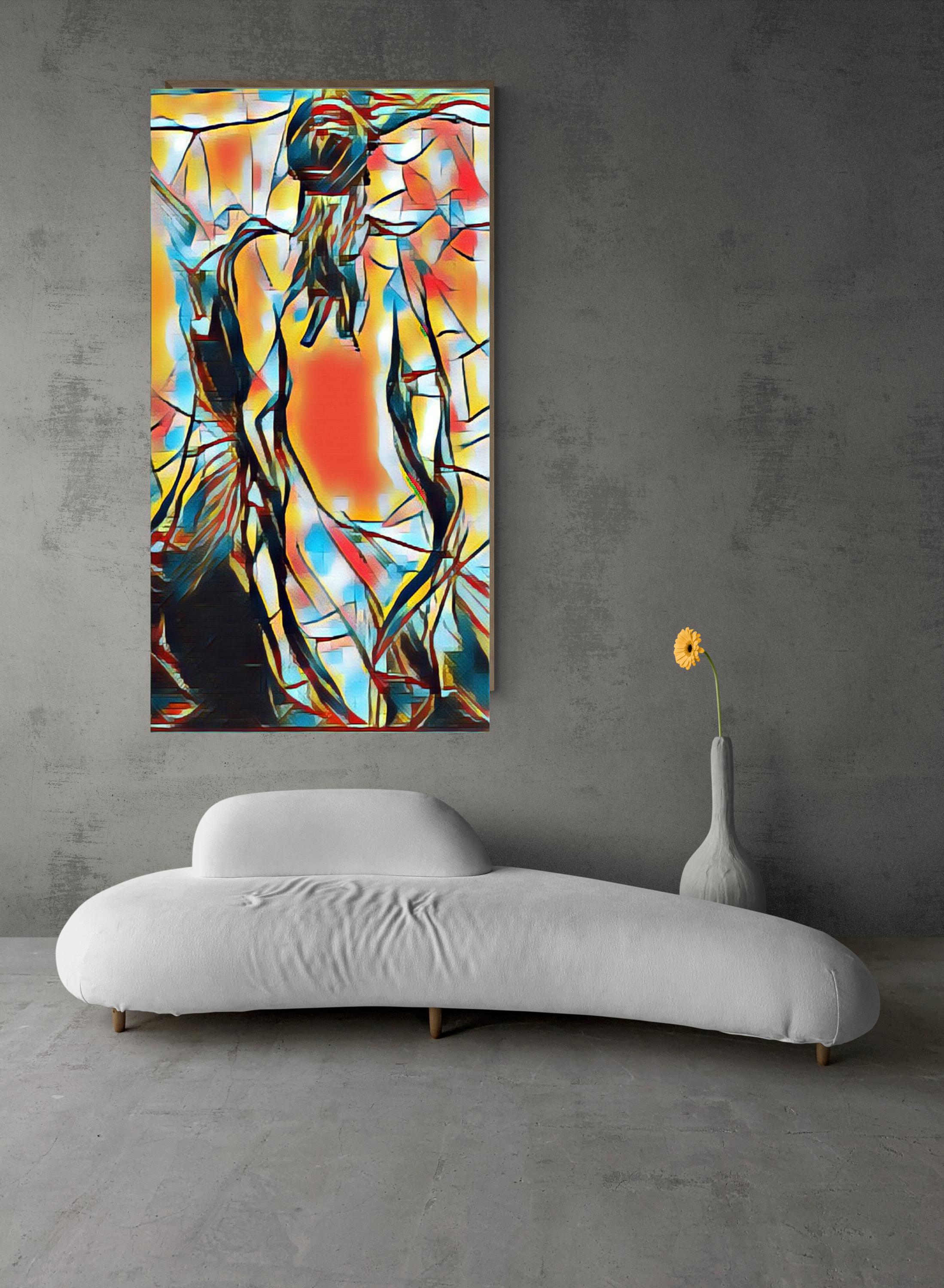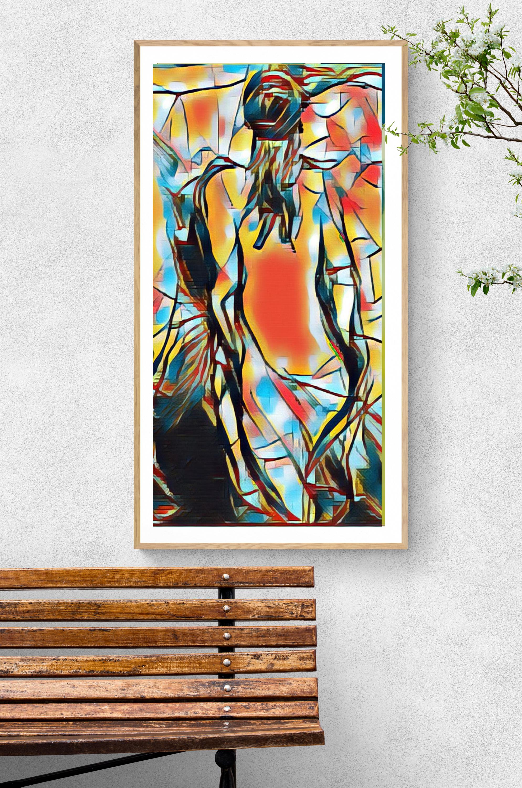 This striking print on canvas showcases an abstract, colorful representation of a woman's back, blending flowing, sketch-like lines with geometric accents. The artwork exudes elegance and emotion, creating a sense of depth and motion. Printed on high-quality canvas, this piece is perfect for adding a touch of sophistication to any space, whether displayed in a living room, bedroom, or office. The buyer can choose from multiple sizes to suit their needs, allowing for customized home décor. This unframed print arrives ready for the buyer to frame or mount as desired.