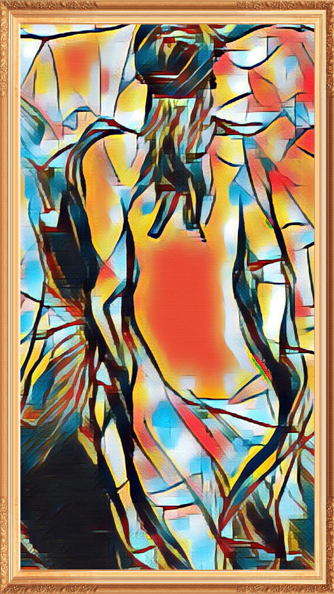 This image depicts an artistic, abstract representation of a figure seen from behind. The sketch-like composition blends organic, flowing lines with geometric shapes, creating a sense of movement and depth. The use of color tones emphasizes the contours and intricate details of the hair and body, giving it a dynamic, expressive quality. The abstract background adds a layer of complexity, suggesting both structure and fluidity.