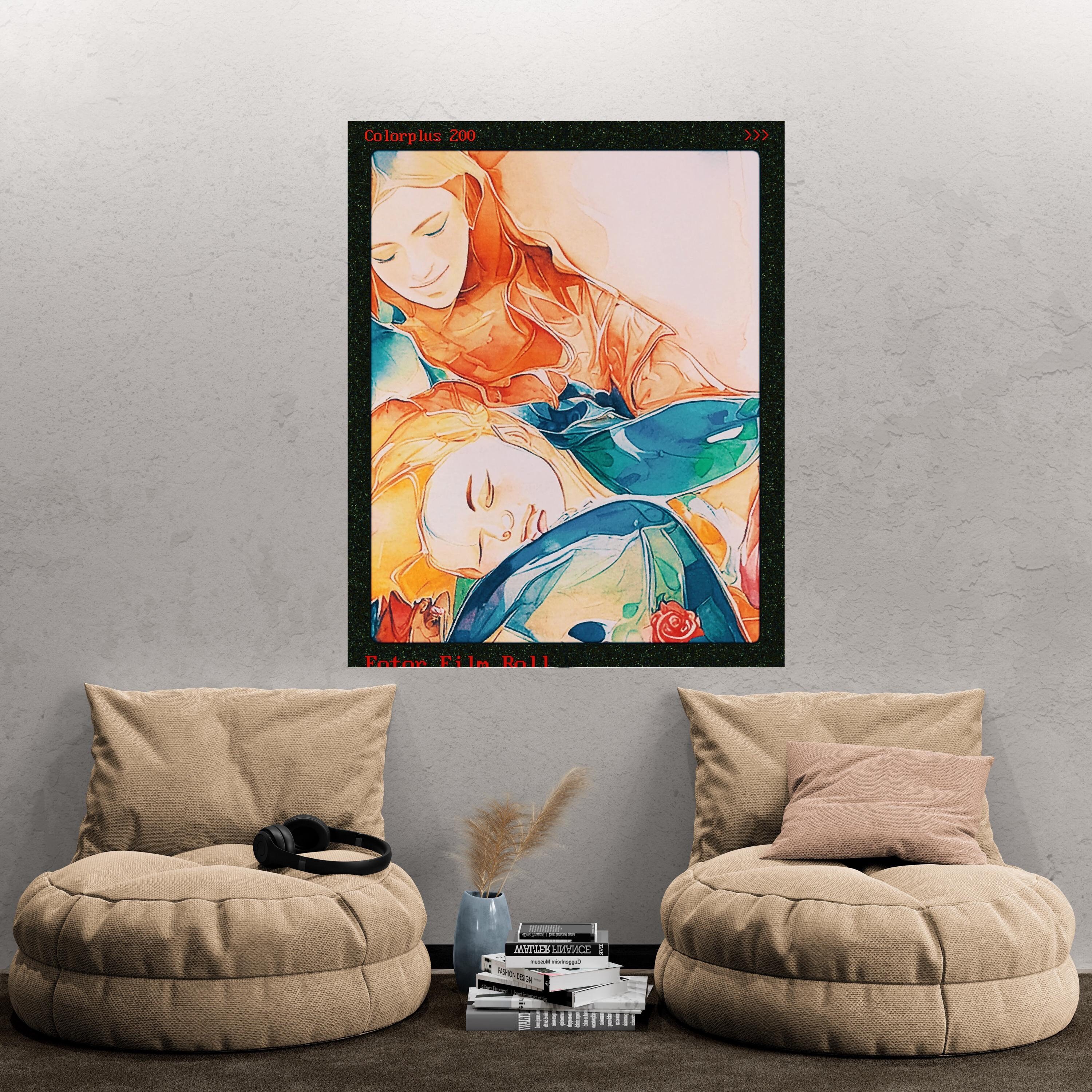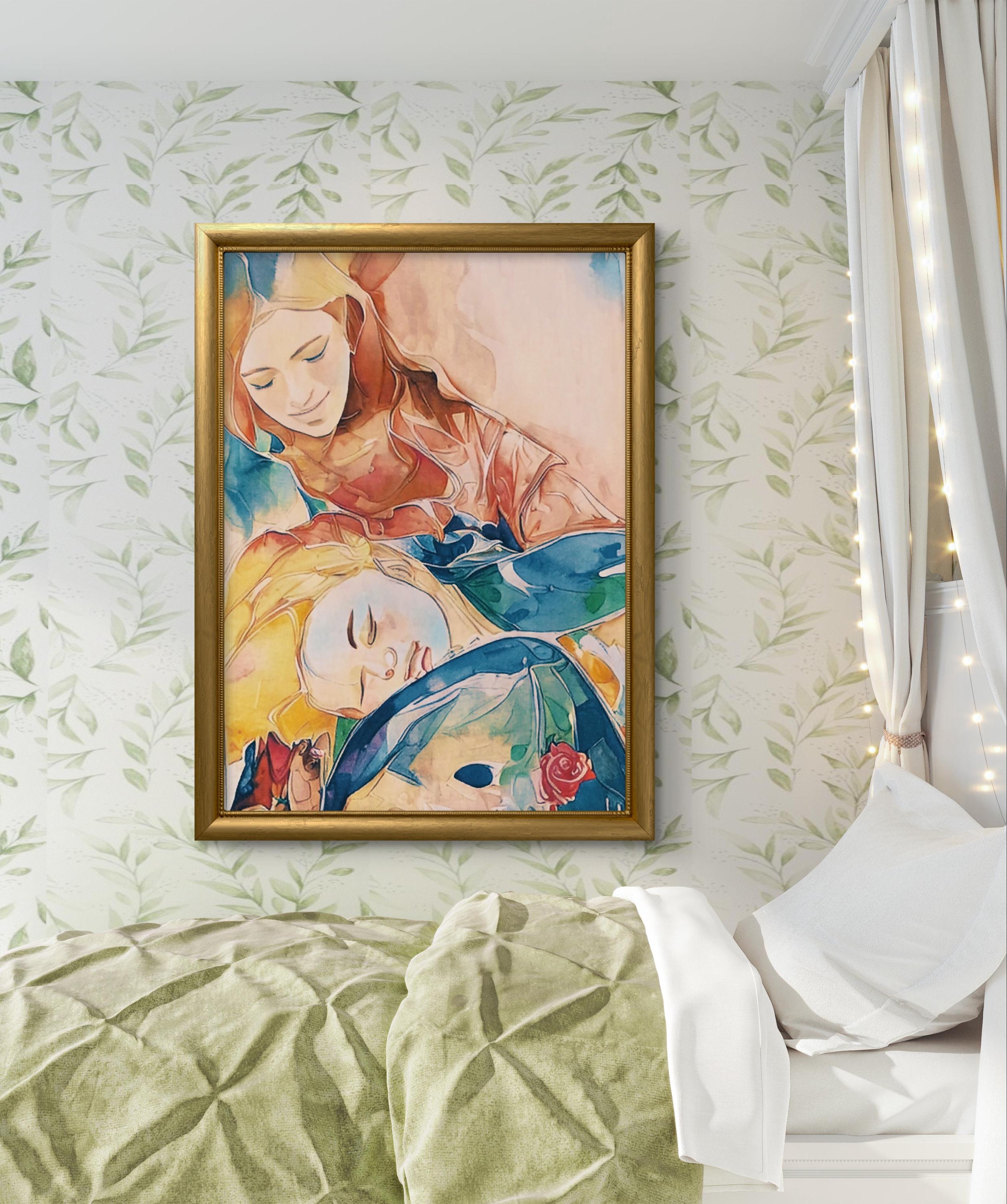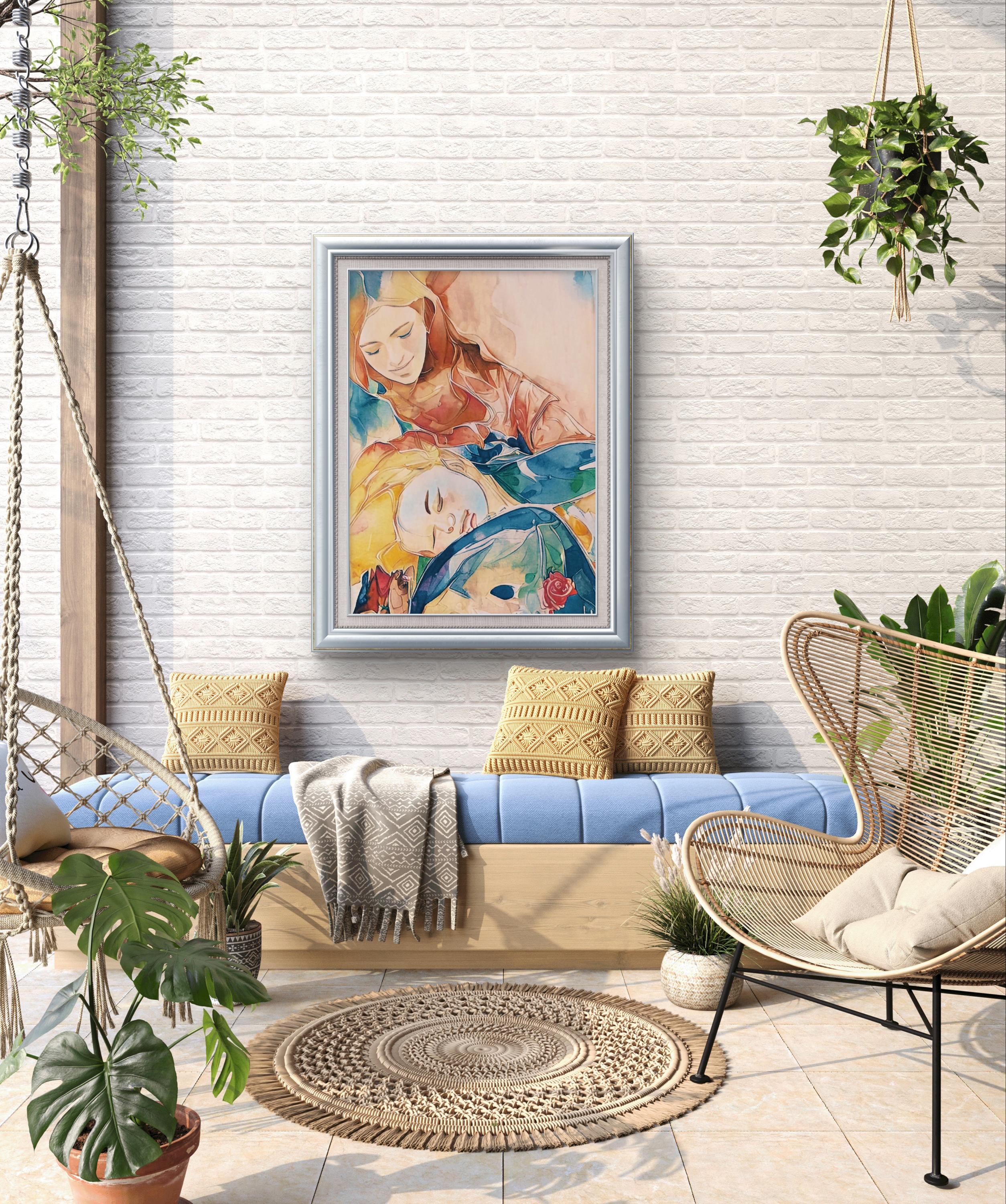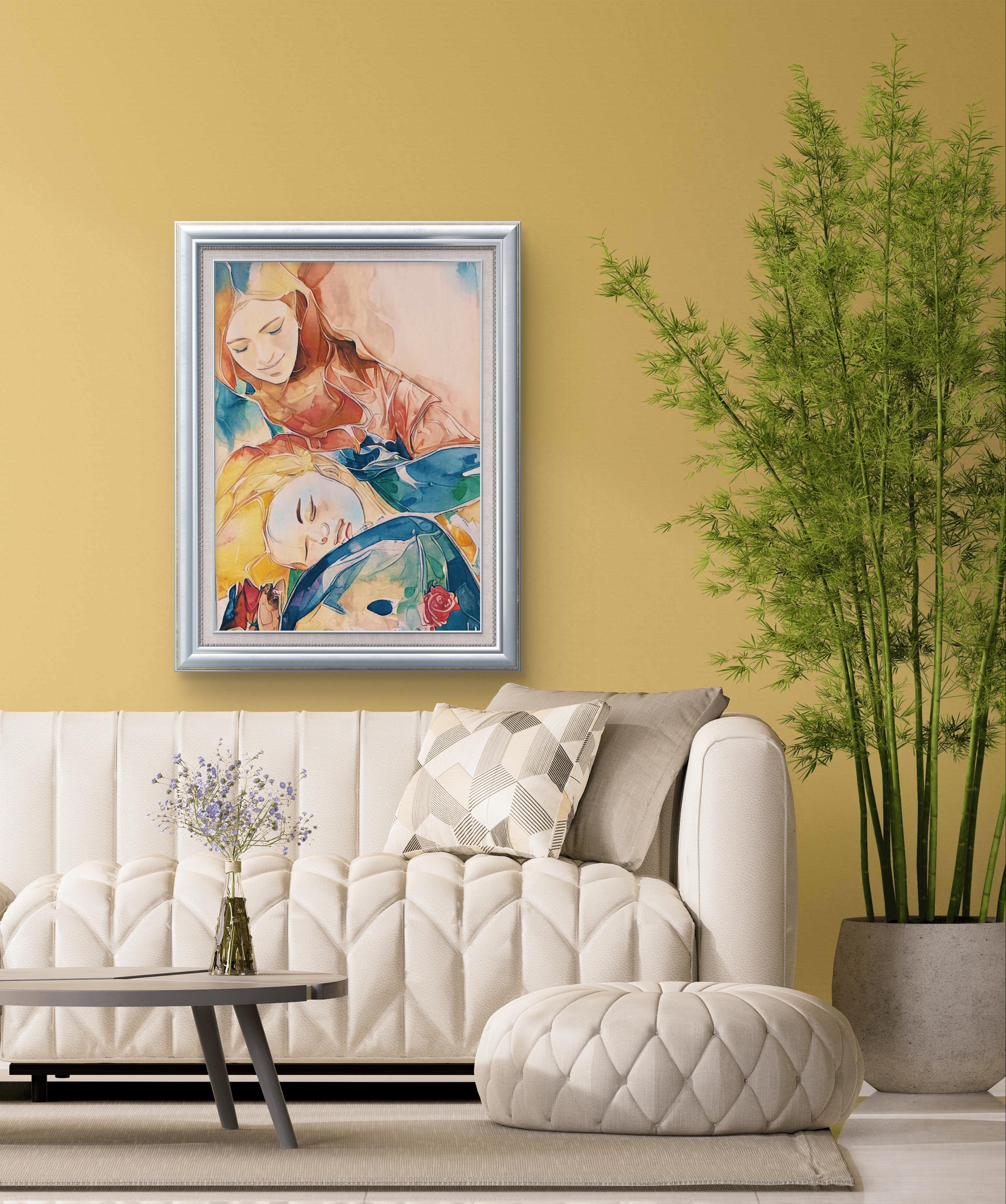 From a psychological perspective, the composition speaks to universal human needs: the desire for safety, love, and nurturing. The positioning of the figures—where the child rests his head on the mother’s lap—conveys a complete surrender to trust. The artwork evokes a sense of peace, security, and unconditional acceptance.