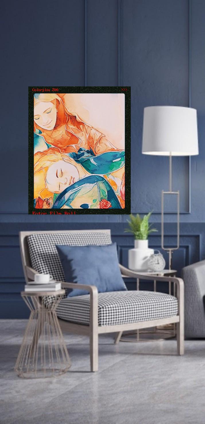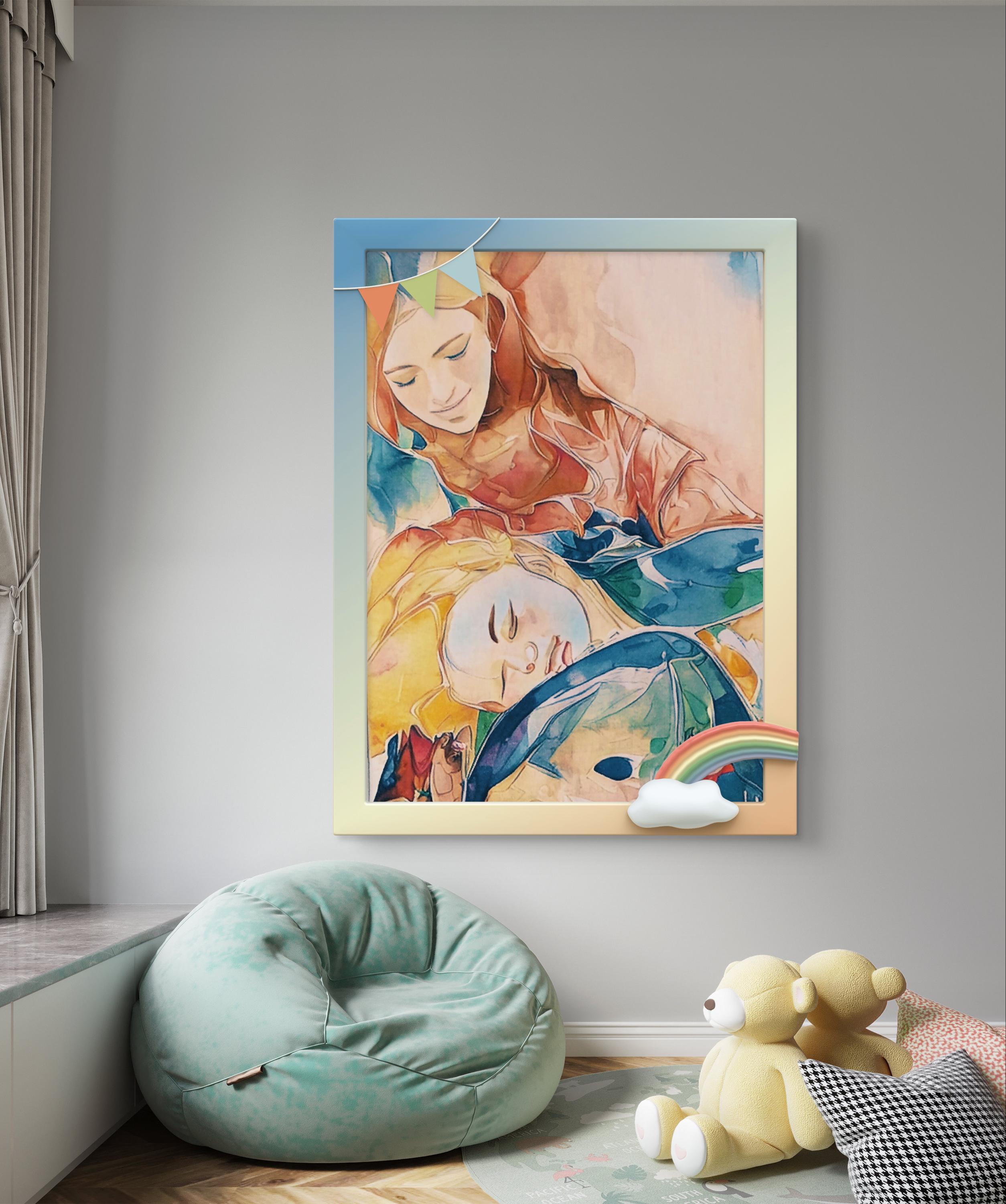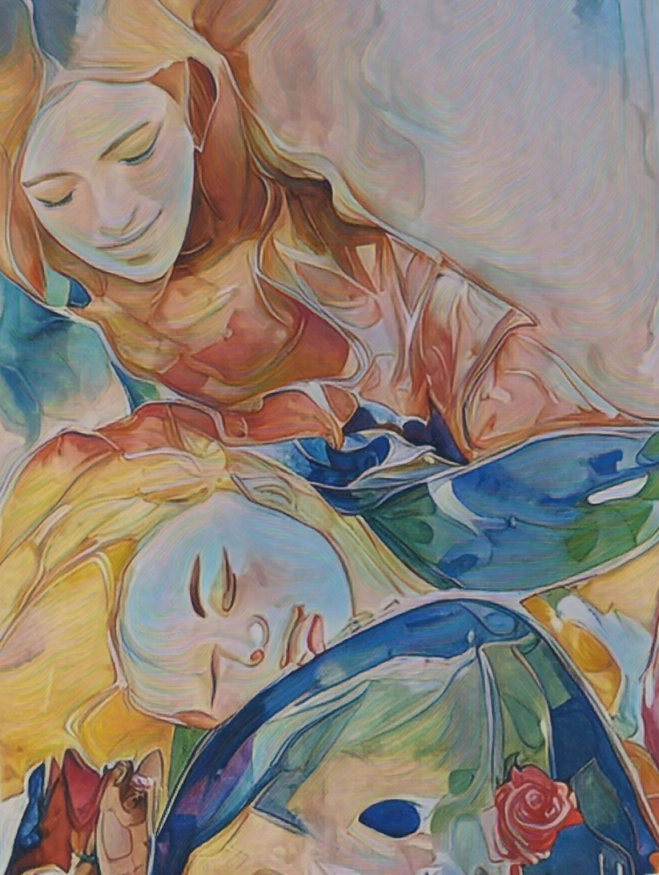 This artwork portrays a tender moment between a woman and her child, emphasizing themes of maternal love, protection, and emotional security. The woman, rendered in soft, warm hues, gently cradles the child's head as he lies on her lap, exuding comfort and trust. The use of vibrant, abstract colors such as yellows, reds, and blues enhances the emotional depth of the scene, suggesting warmth, joy, and a spiritual connection. The brushstrokes and blending of colors create a dreamlike quality, symbolizing the profound, almost ethereal bond between parent and child.
