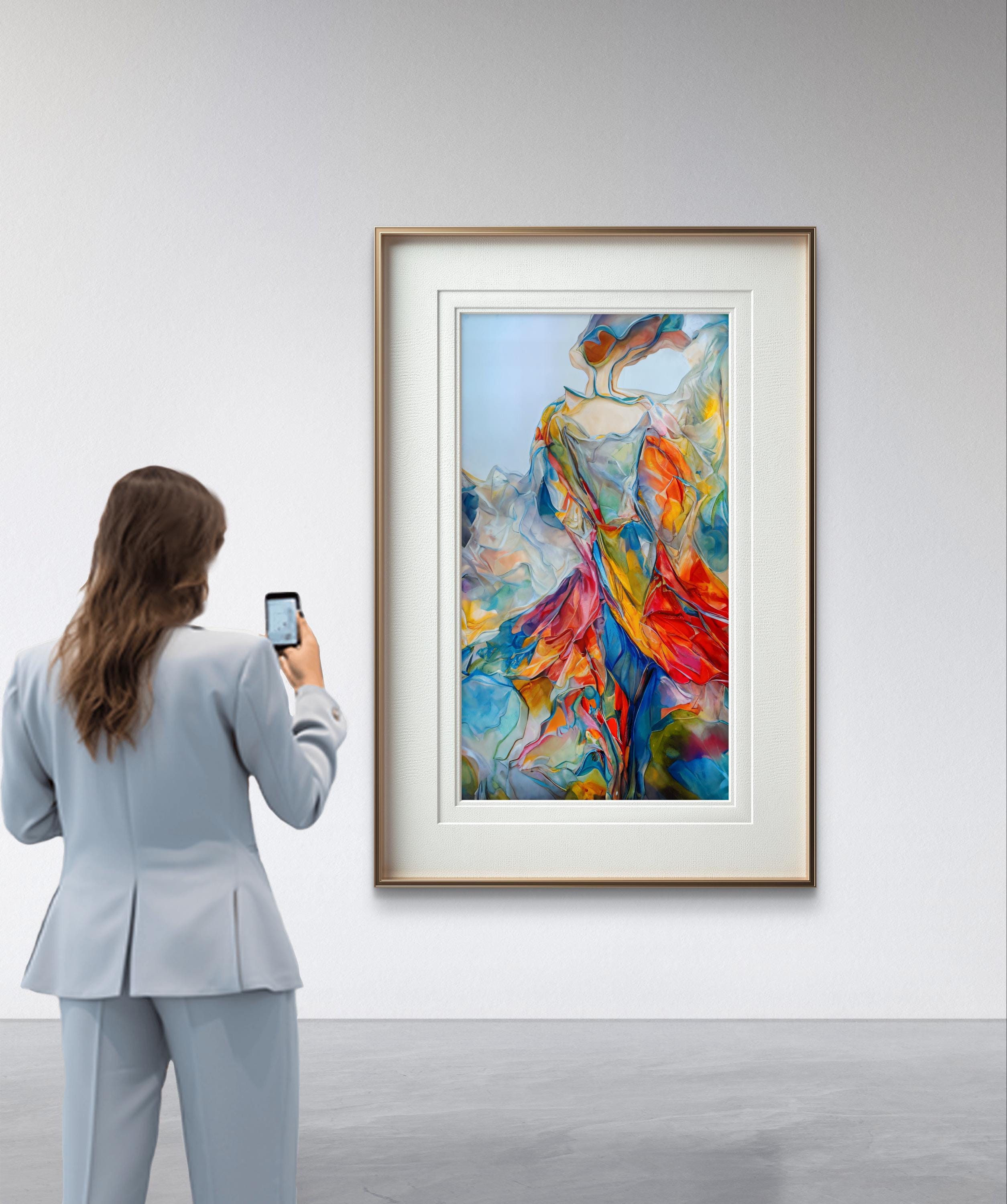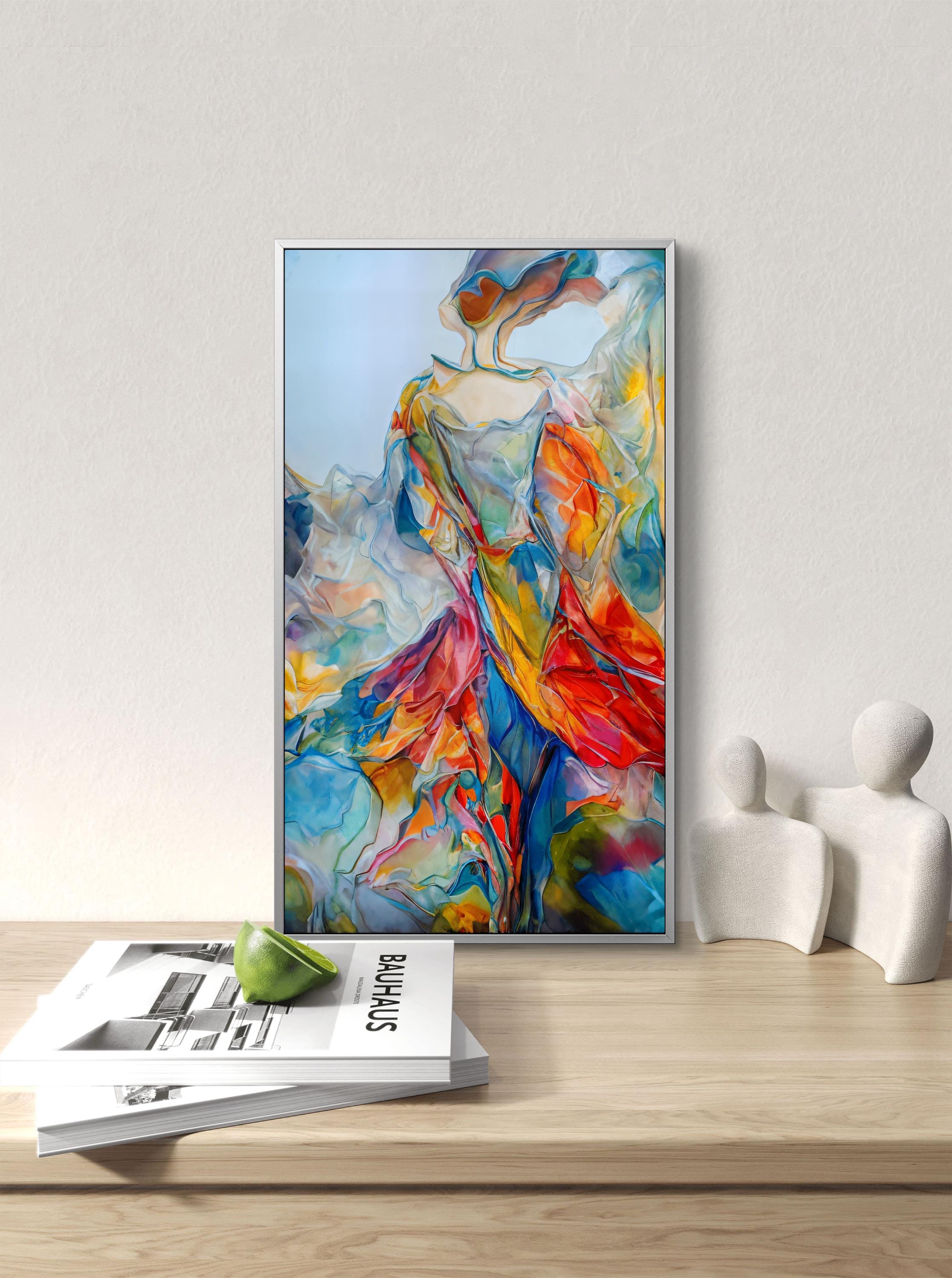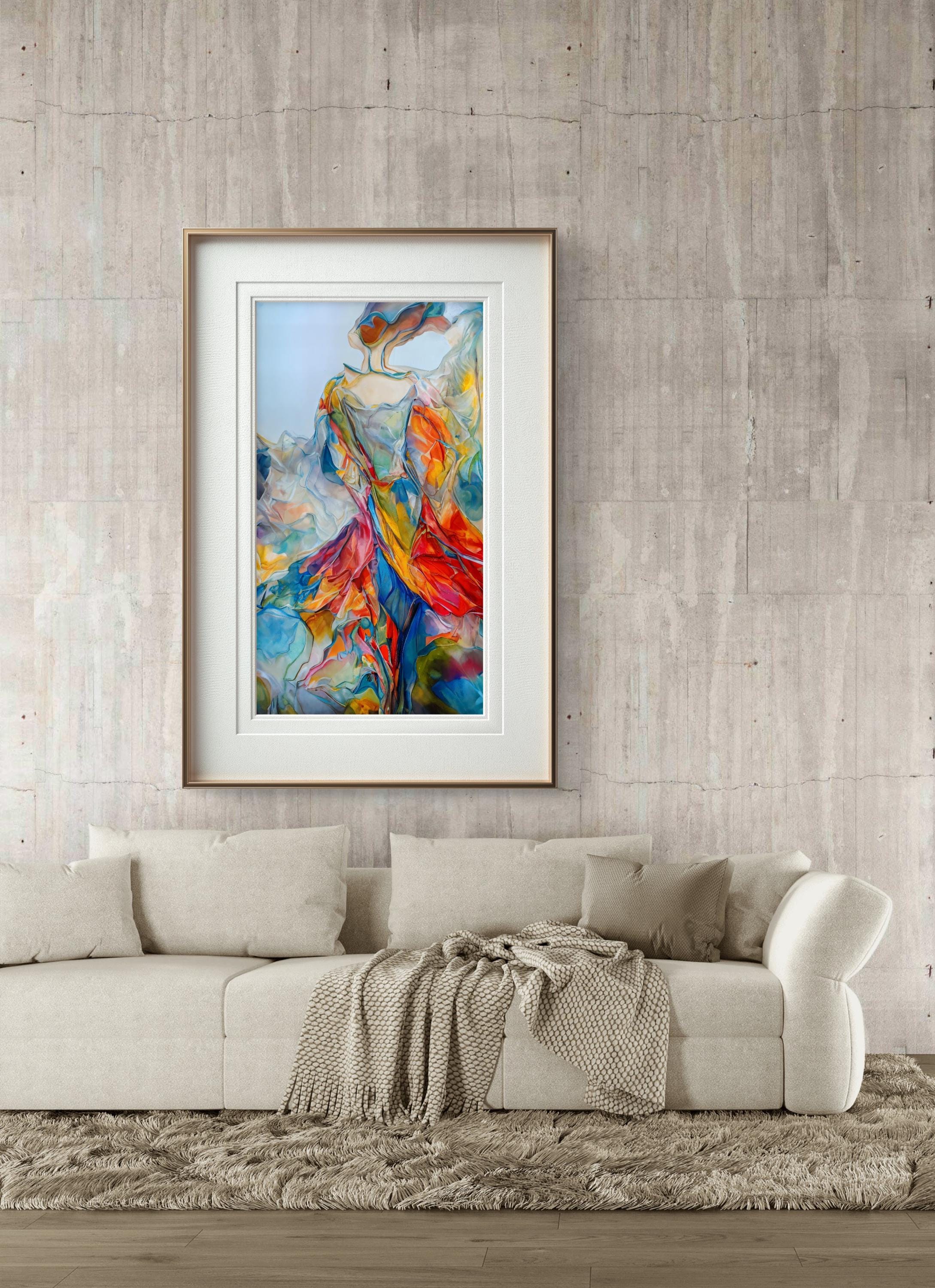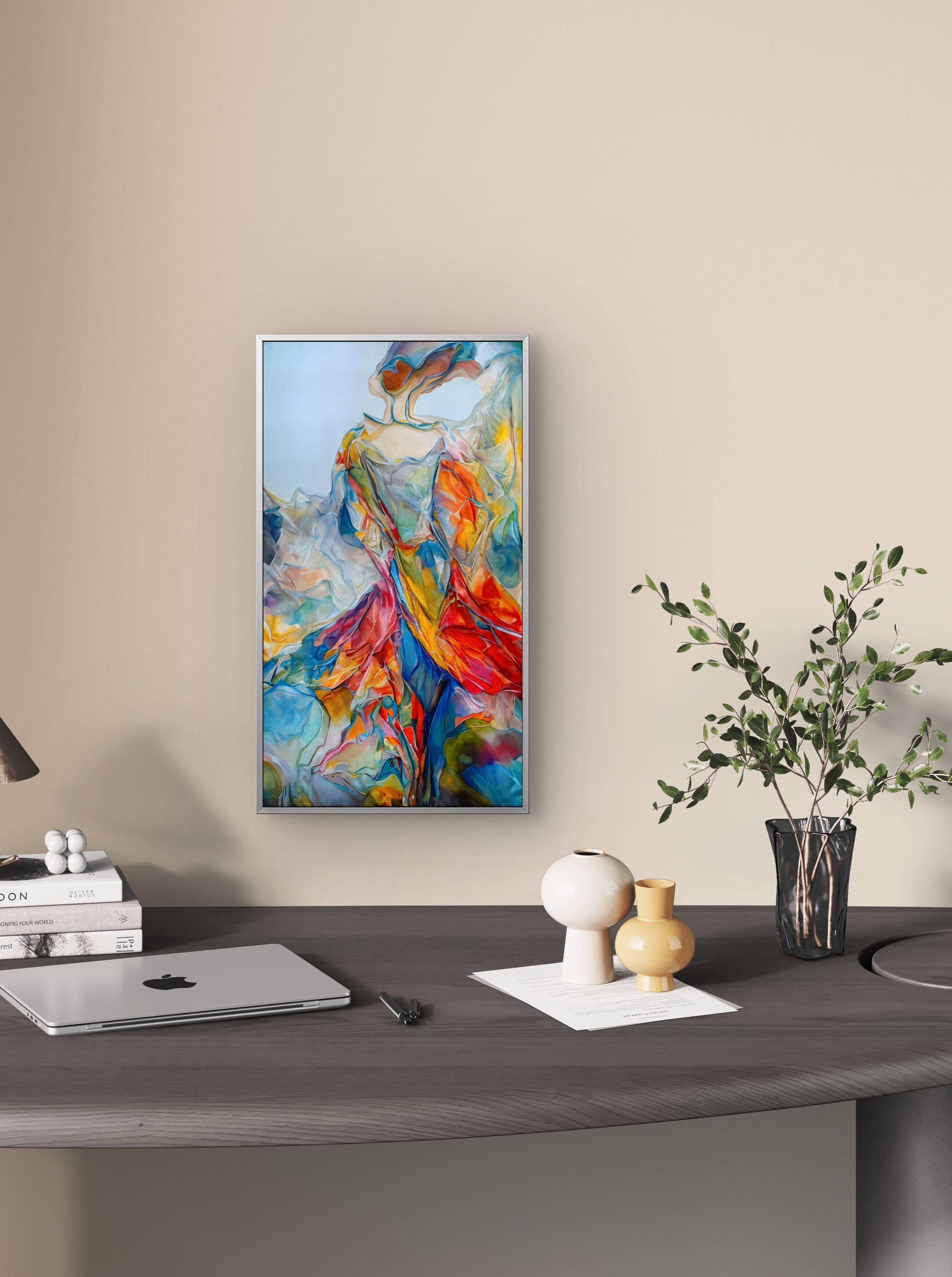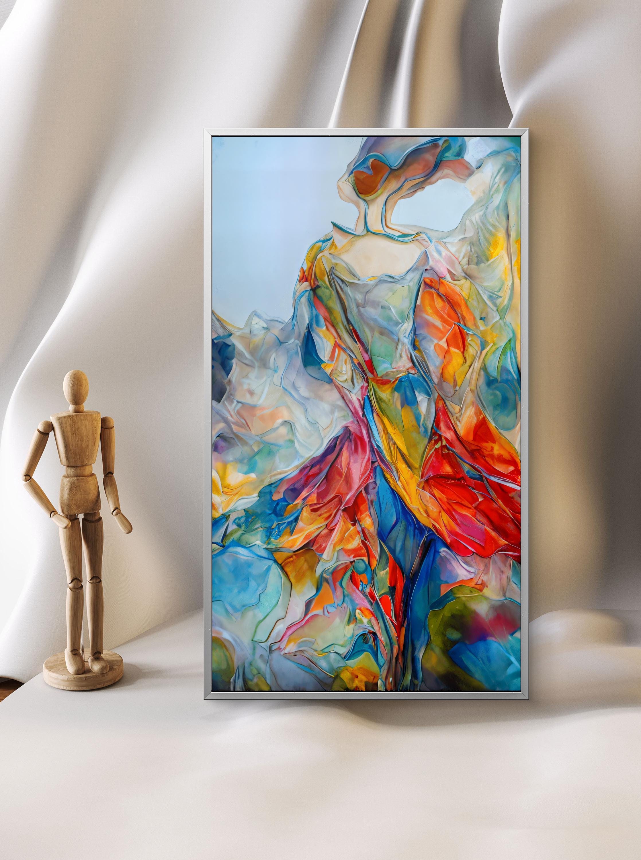 This stunning digital artwork features a graceful, abstract female figure that seems to dissolve into a whirlwind of vibrant colors. Combining the elegance of contemporary figurative art with the energy of abstract expressionism, this piece is designed to be a bold focal point in any modern home or office.