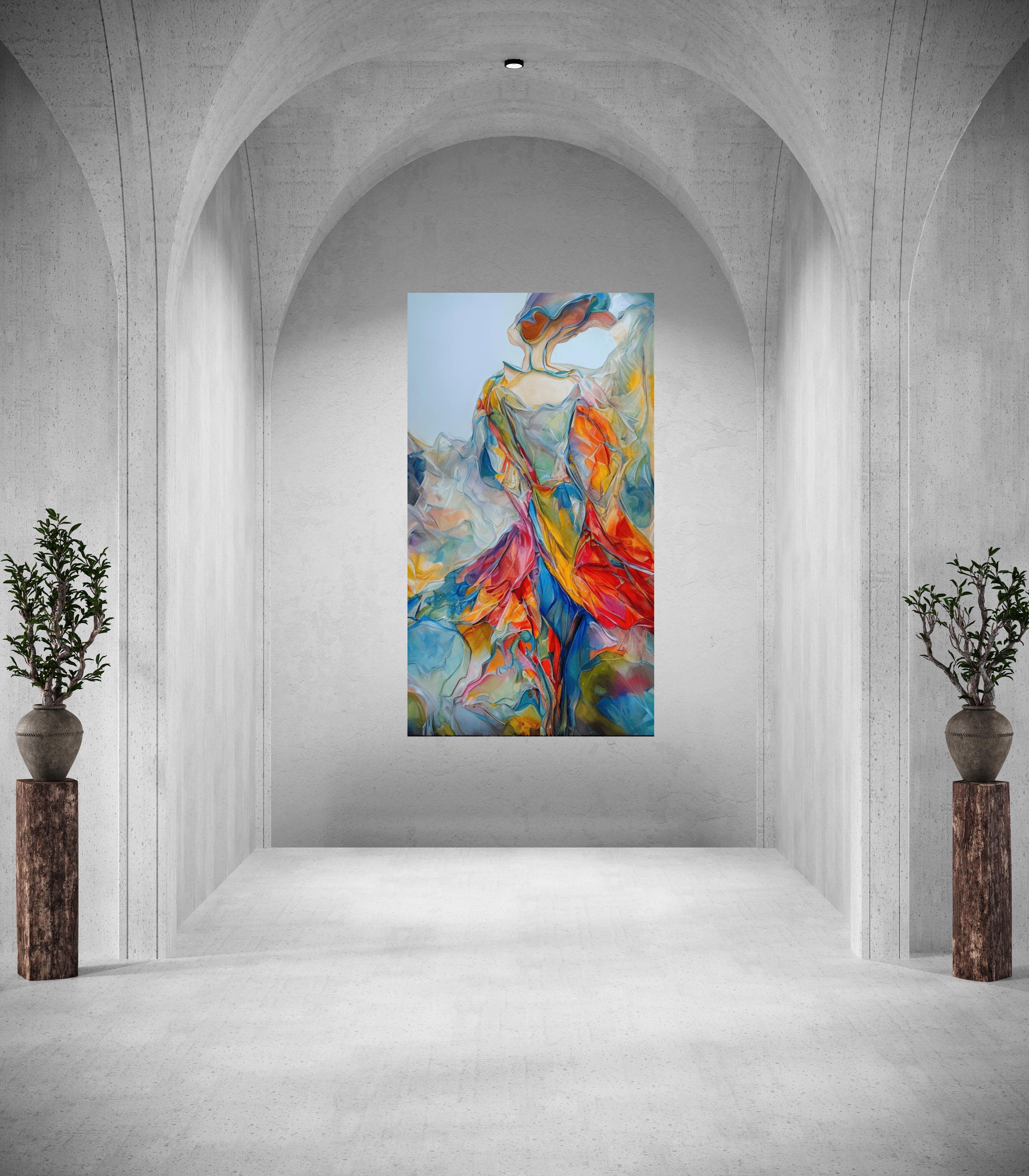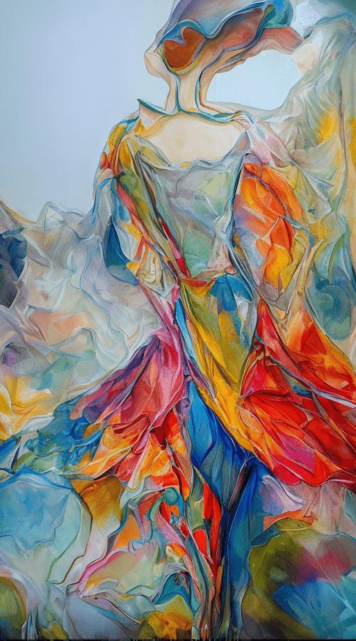 The image you provided portrays an abstract depiction of a woman in a flowing, colorful dress.