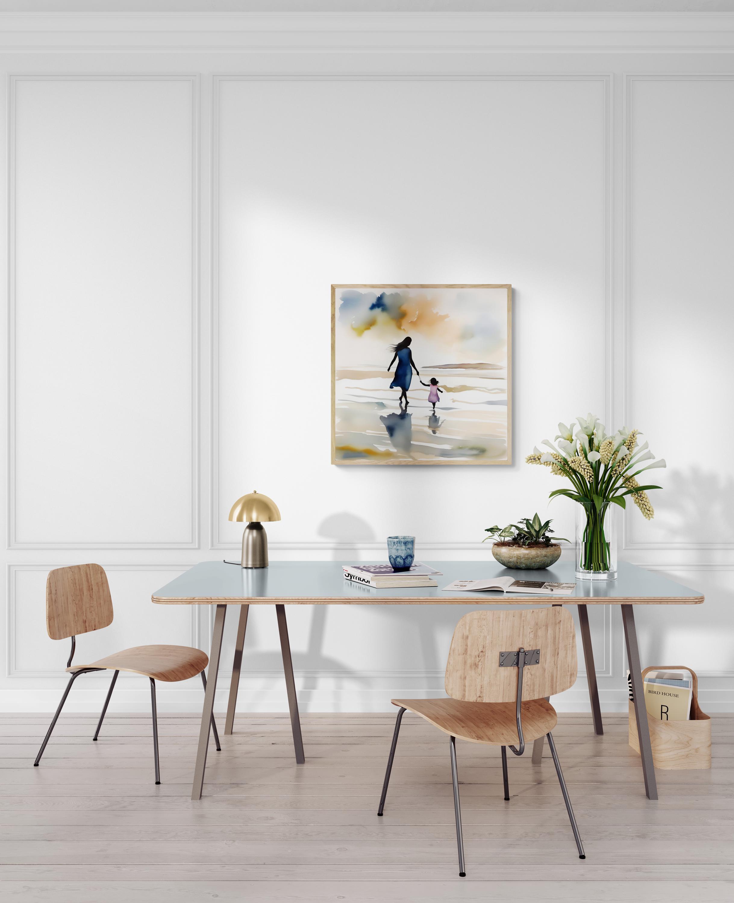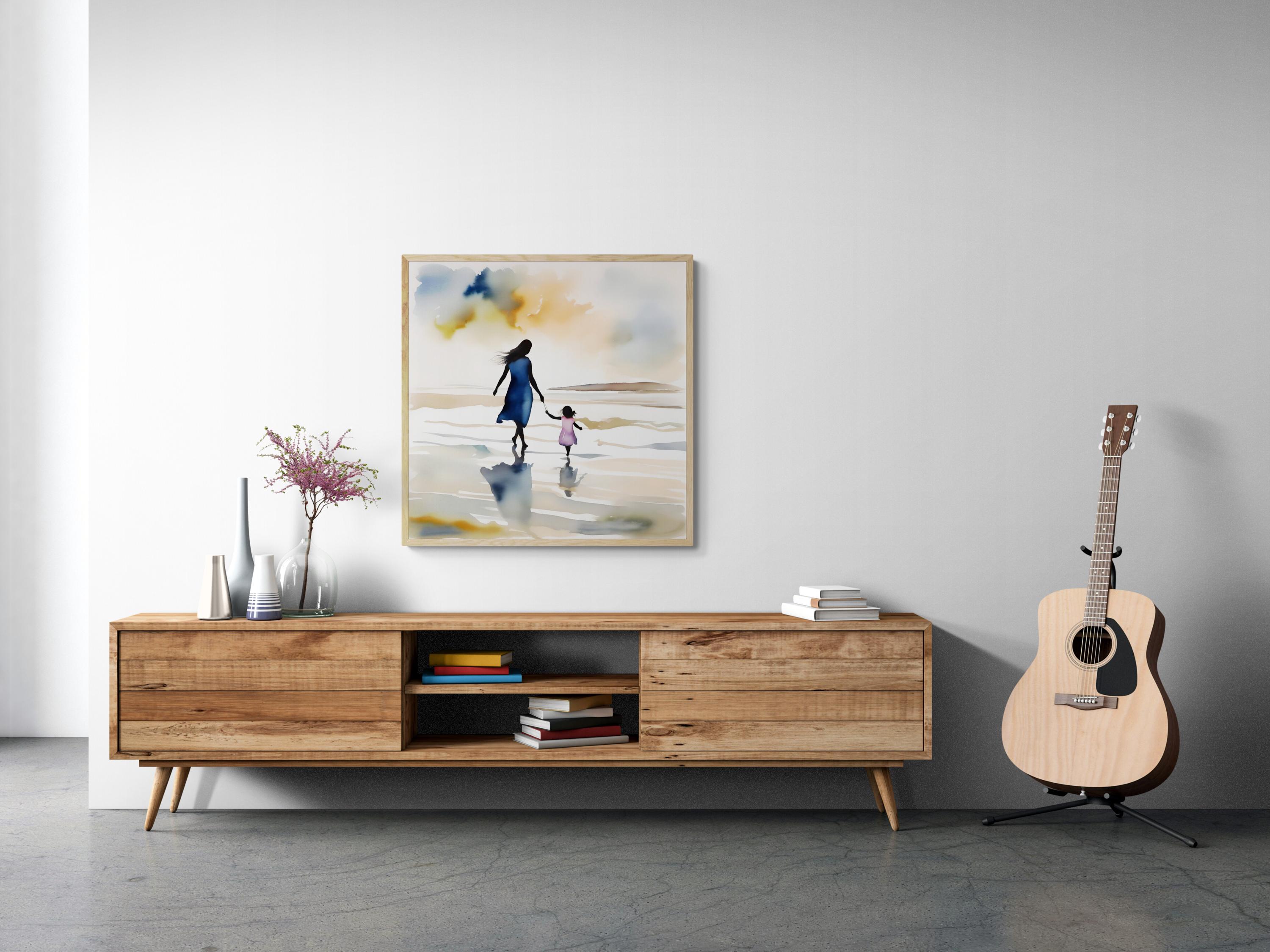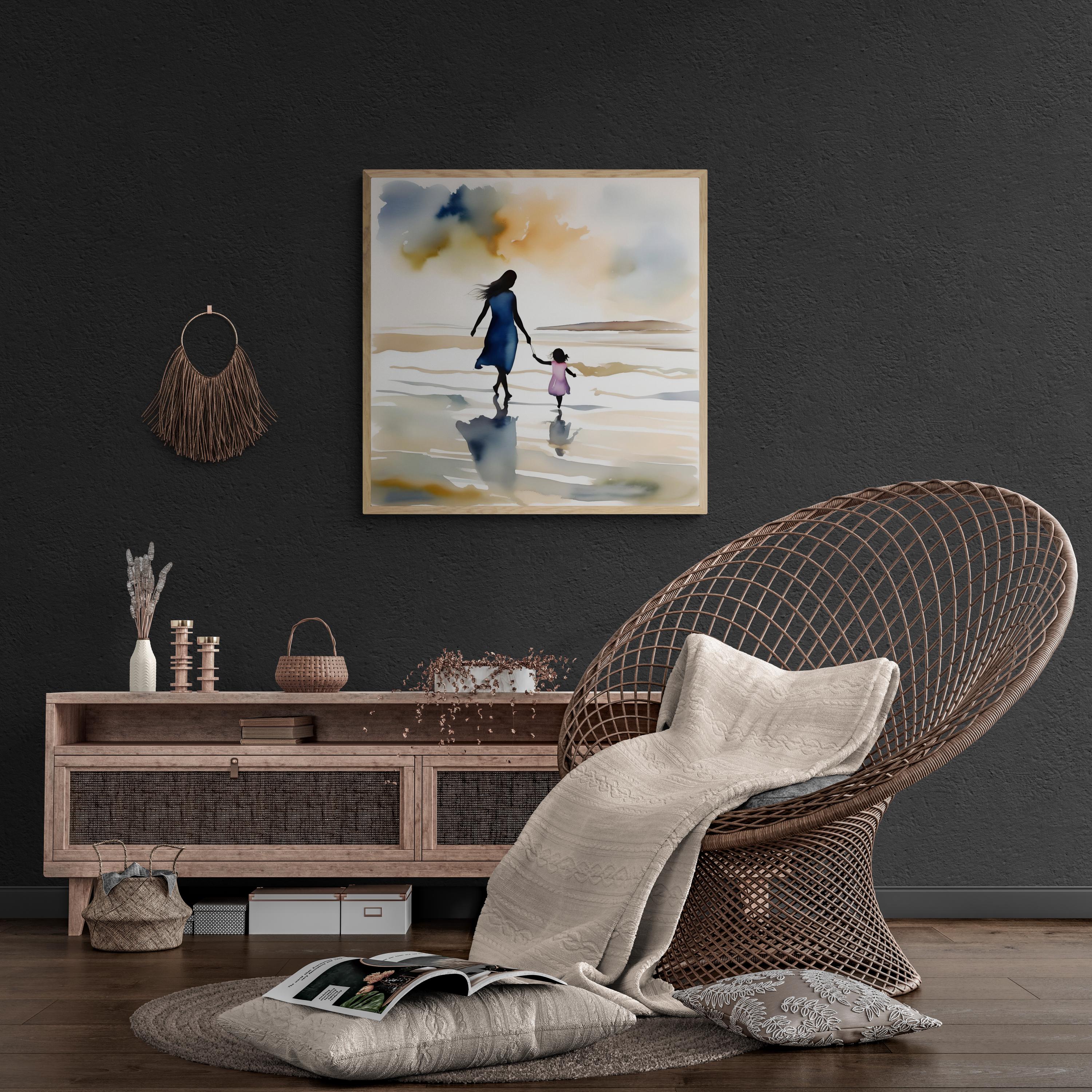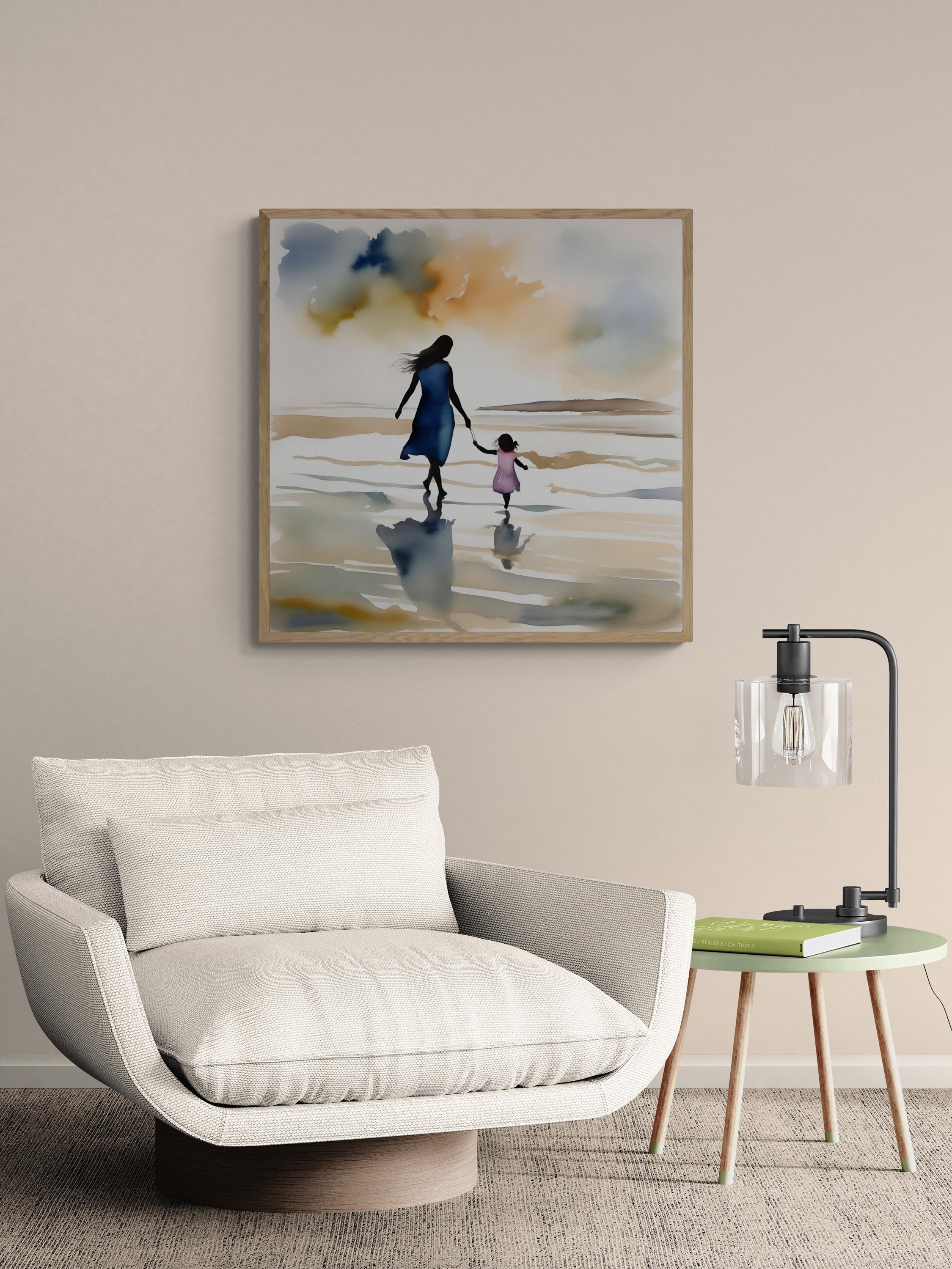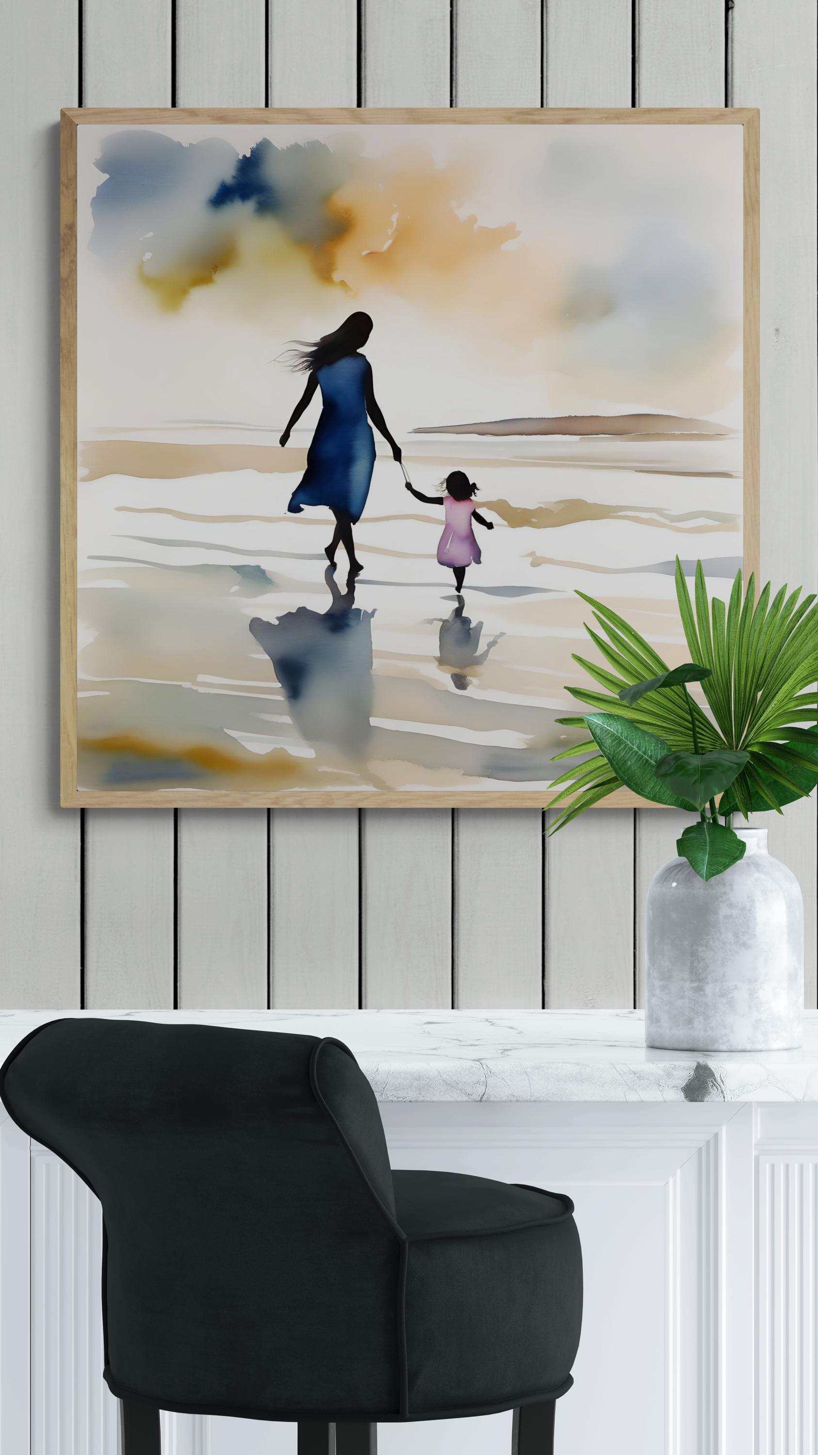 Blue Beach art print Mother and Child Watercolor Art Family room Home Decor poster