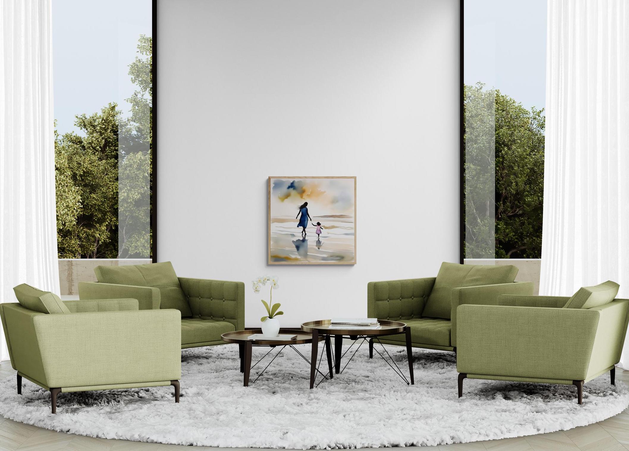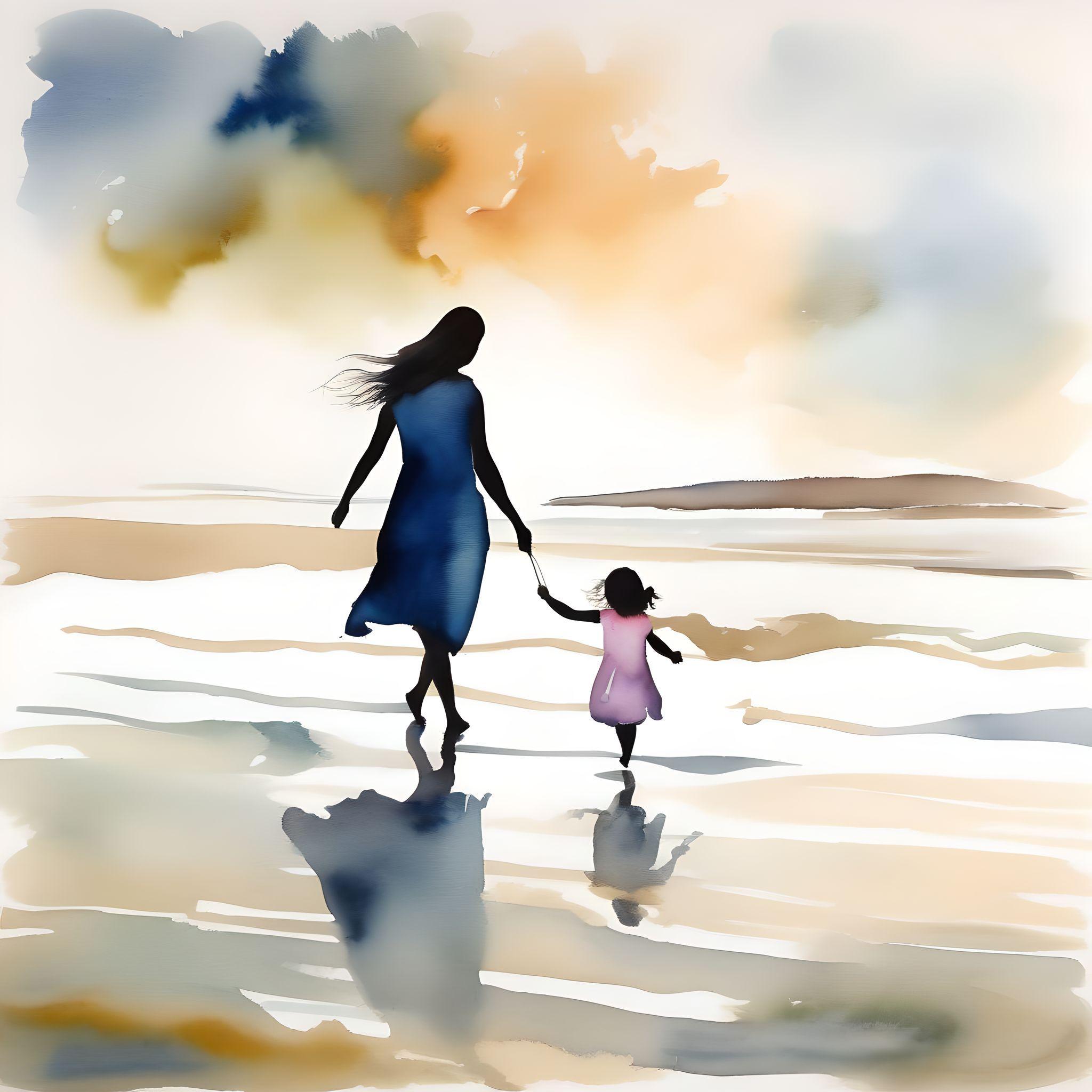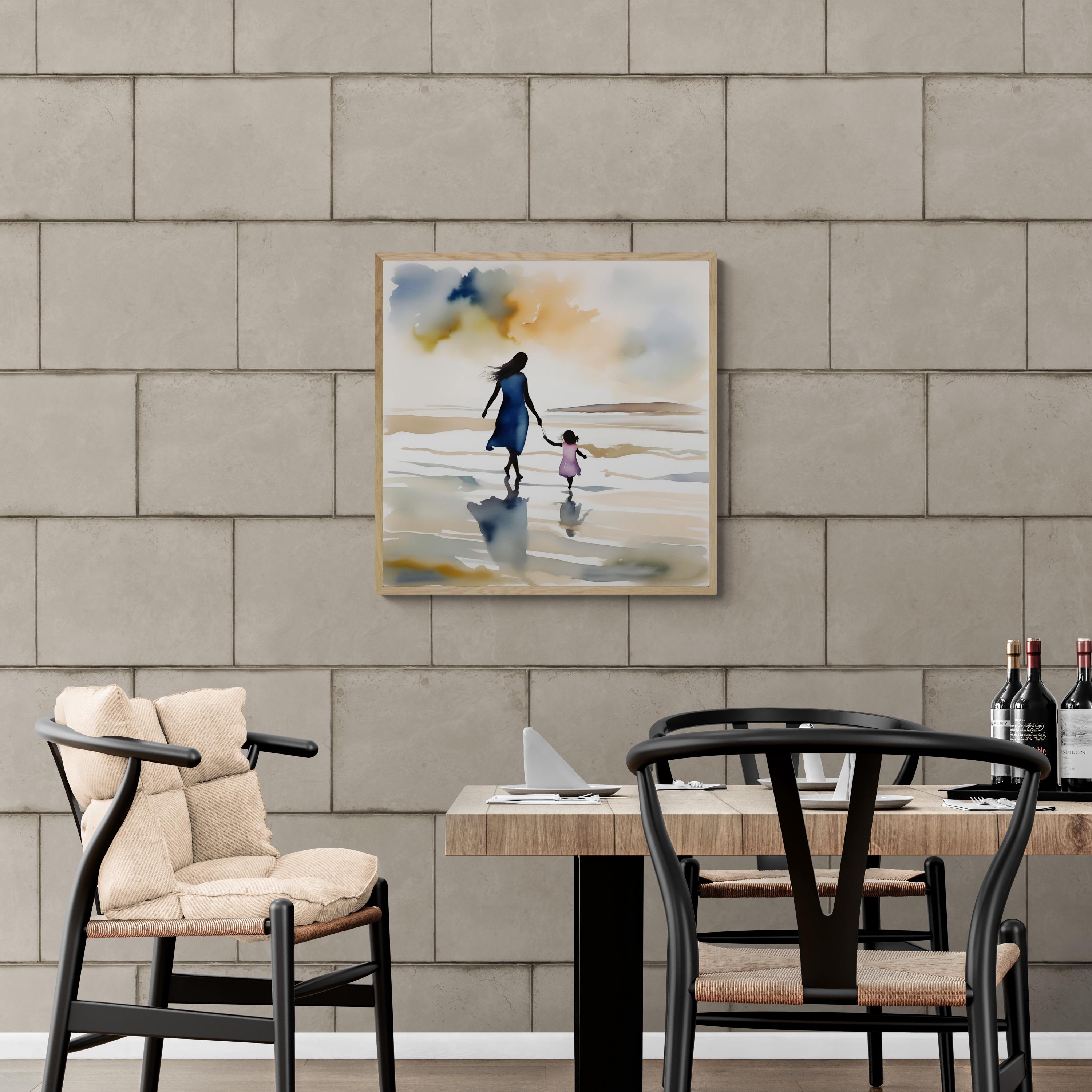 Abstract wall art of a woman holding her daughter hand walking forward to the colorful sea view,