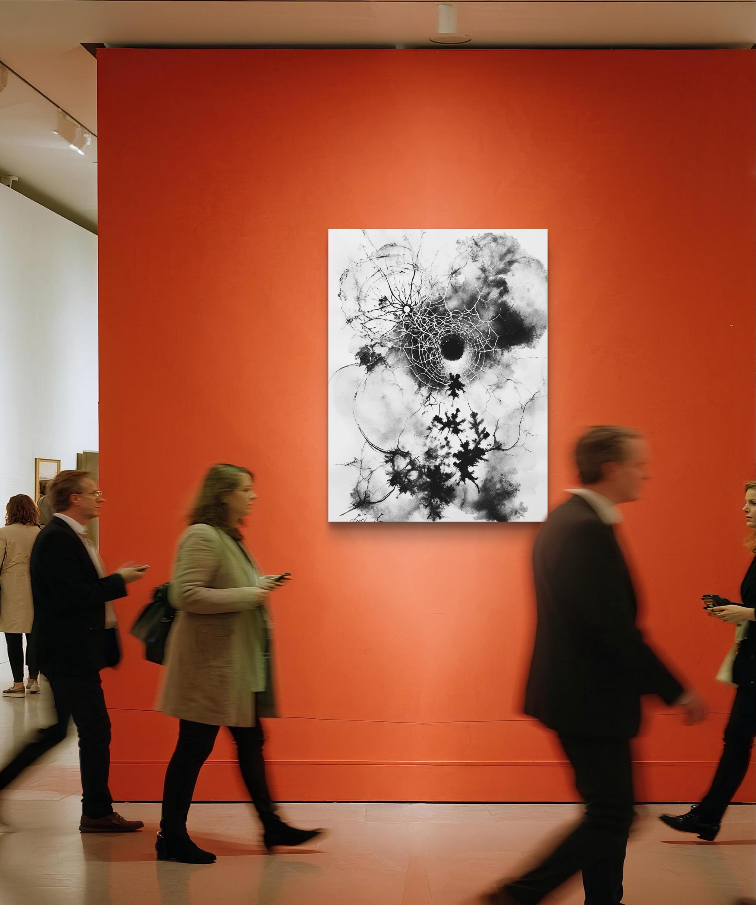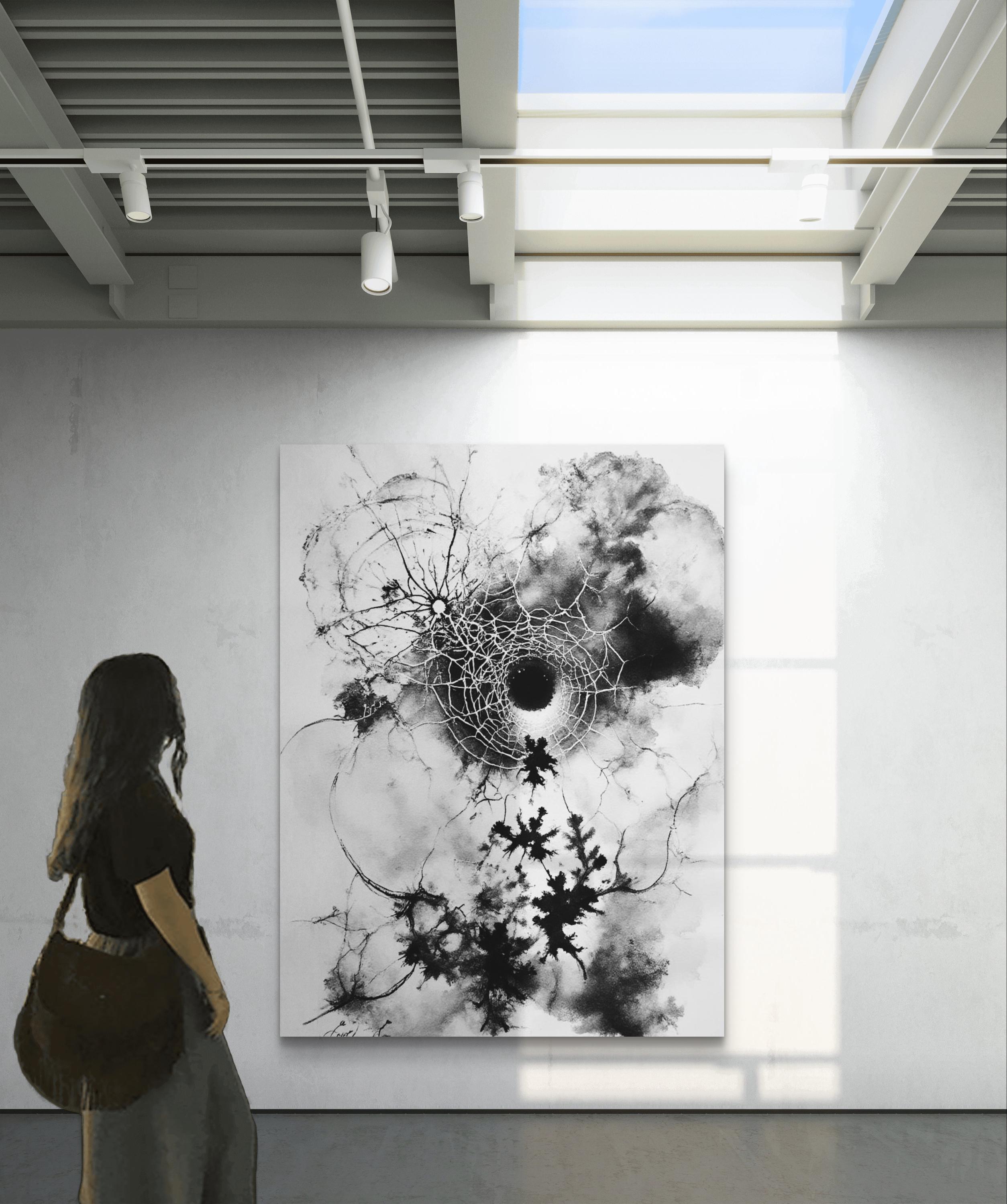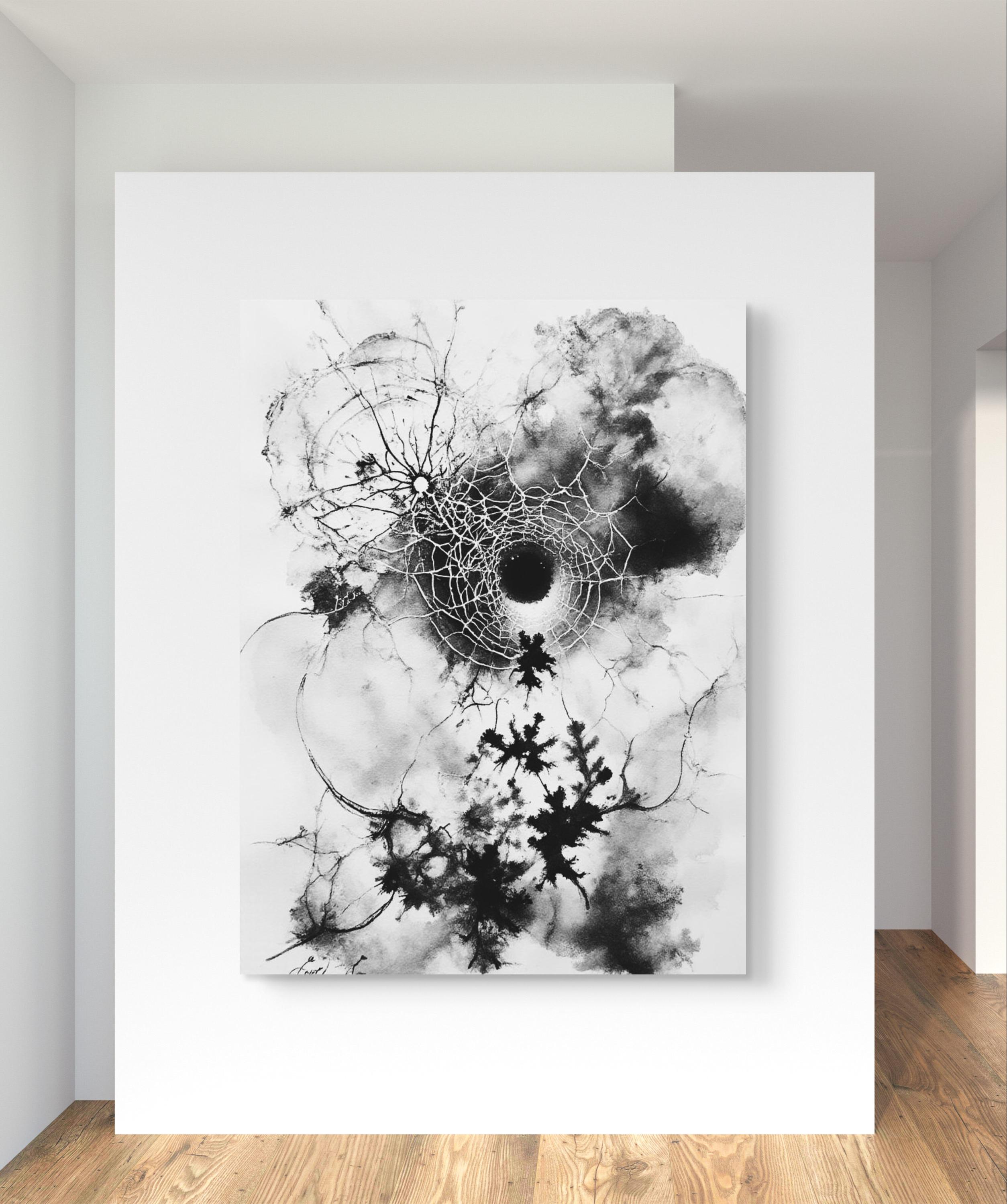 This striking black-and-white artwork captures the delicate tension between chaos and structure. At its center lies a fragmented circular form resembling both a cosmic black hole and a spider’s web, radiating intricate lines outward in organic, lightning-like patterns. The ink spreads fluidly across the canvas, creating dynamic contrasts between light and shadow, order and disorder. The piece evokes themes of fragility, interconnectedness, and the invisible forces that shape nature and existence. Its large scale enhances its immersive quality, inviting viewers to step closer and lose themselves in its depth and movement.