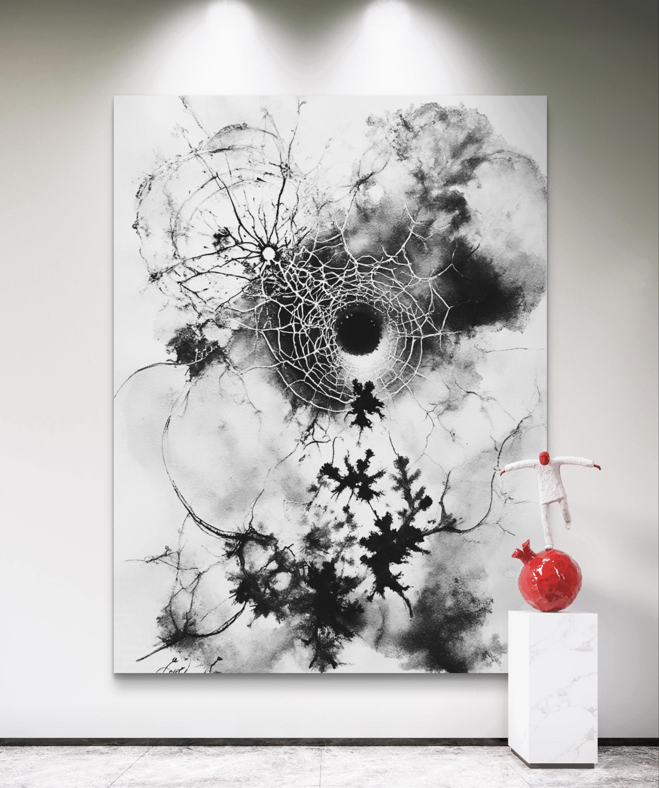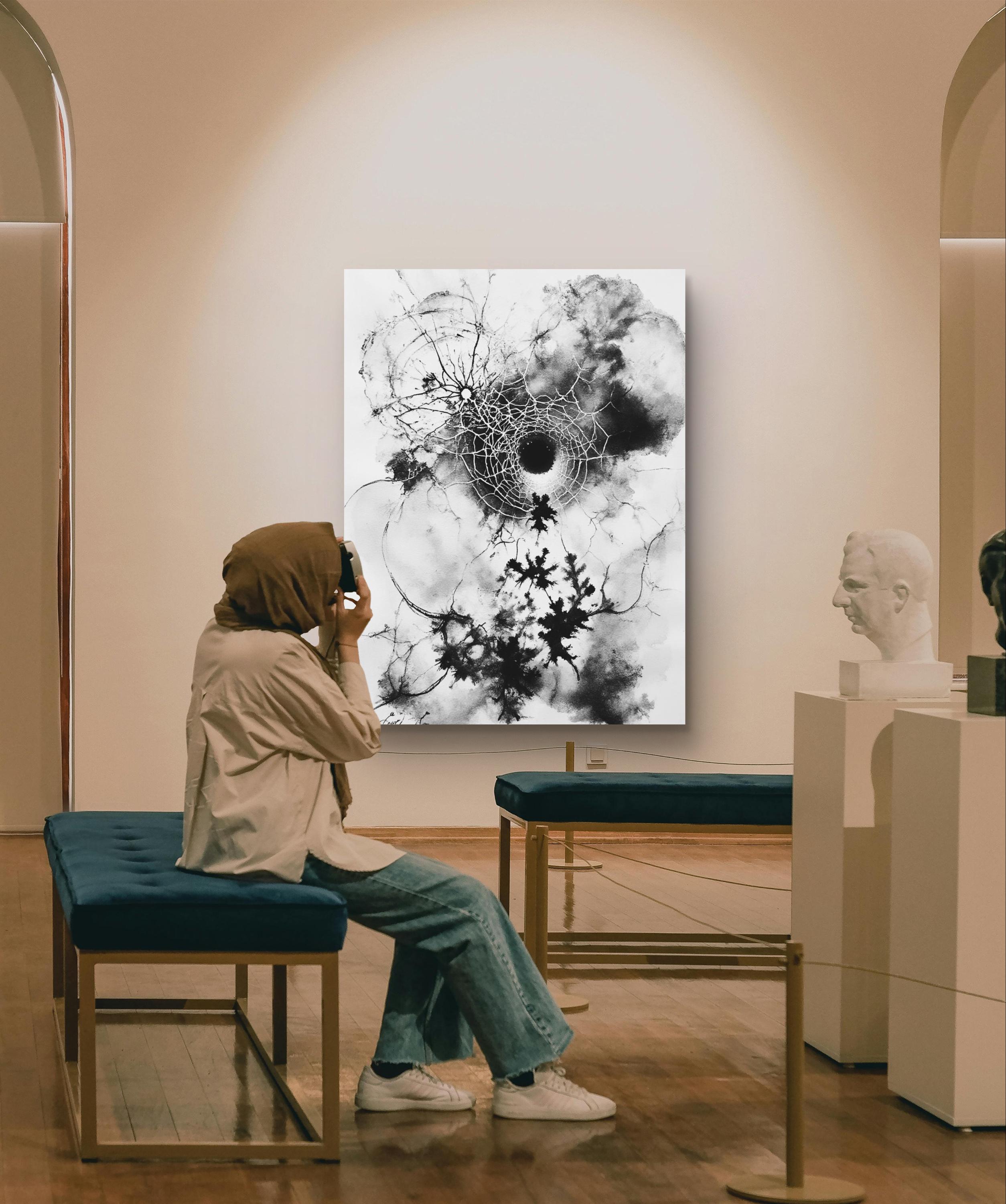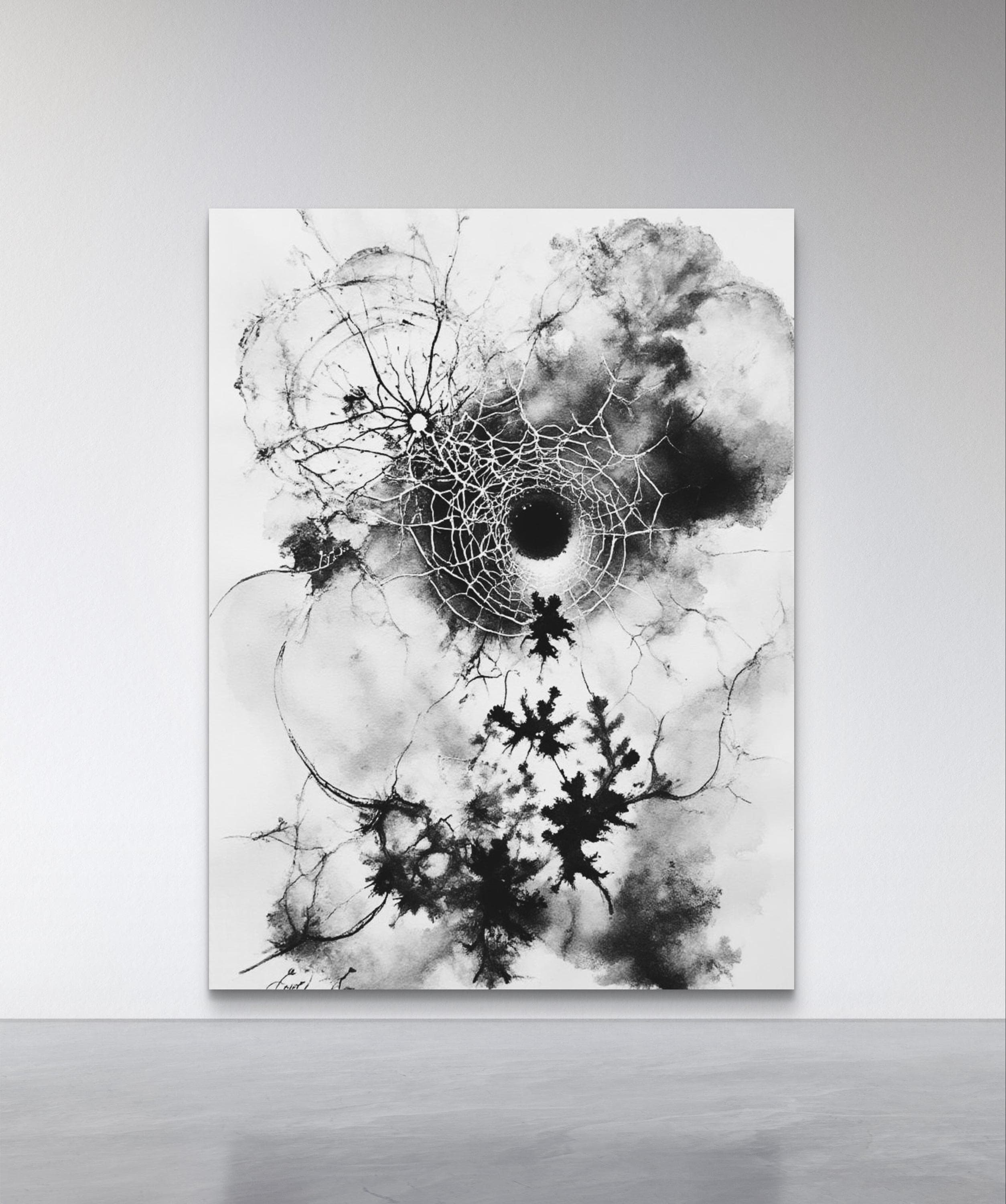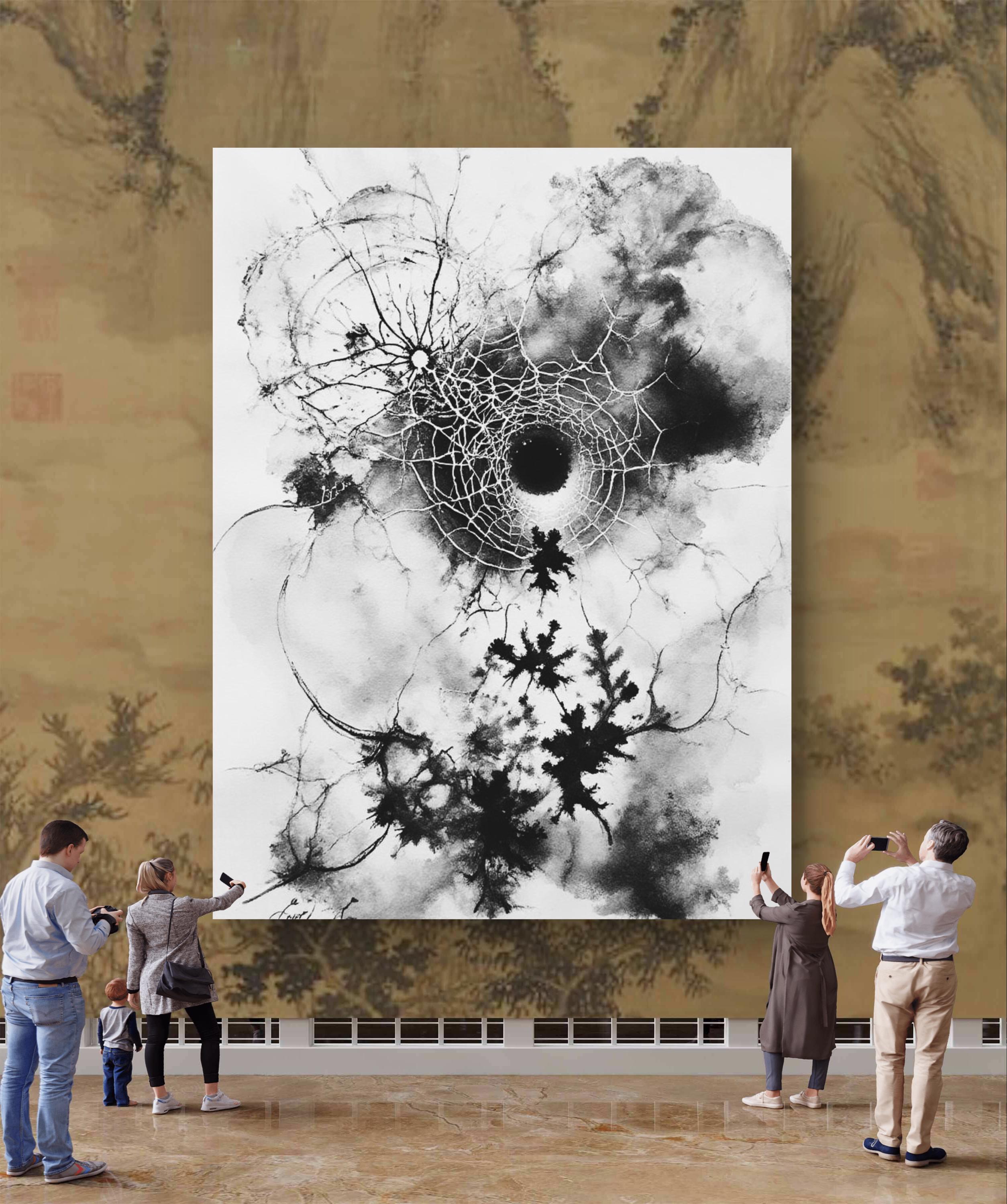 This striking black-and-white artwork captures the delicate tension between chaos and structure. At its center lies a fragmented circular form resembling both a cosmic black hole and a spider’s web, radiating intricate lines outward in organic, lightning-like patterns. The ink spreads fluidly across the canvas, creating dynamic contrasts between light and shadow, order and disorder. The piece evokes themes of fragility, interconnectedness, and the invisible forces that shape nature and existence. Its large scale enhances its immersive quality, inviting viewers to step closer and lose themselves in its depth and movement.