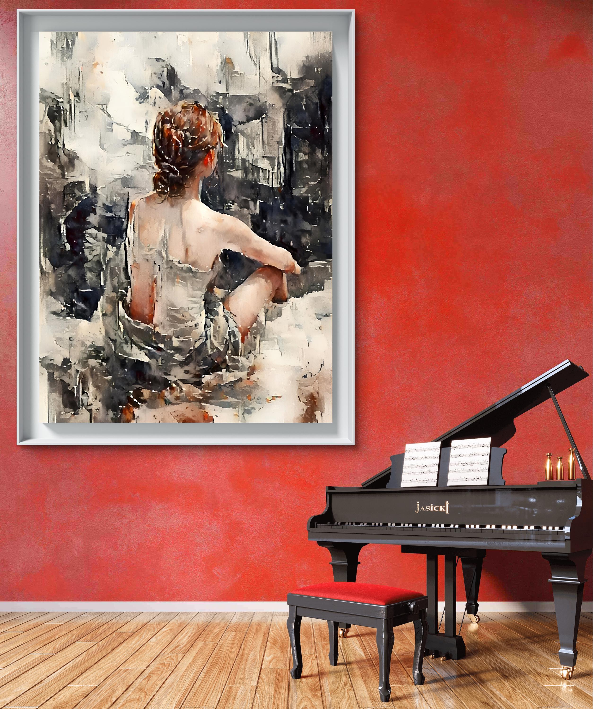 This evocative piece captures a quiet moment of reflection, blending the elegance of classical music with an expressive, modern art style. Perfectly suited for a music room, study, or any space that needs a touch of sophisticated emotion, this artwork is a tribute to passion and creativity.