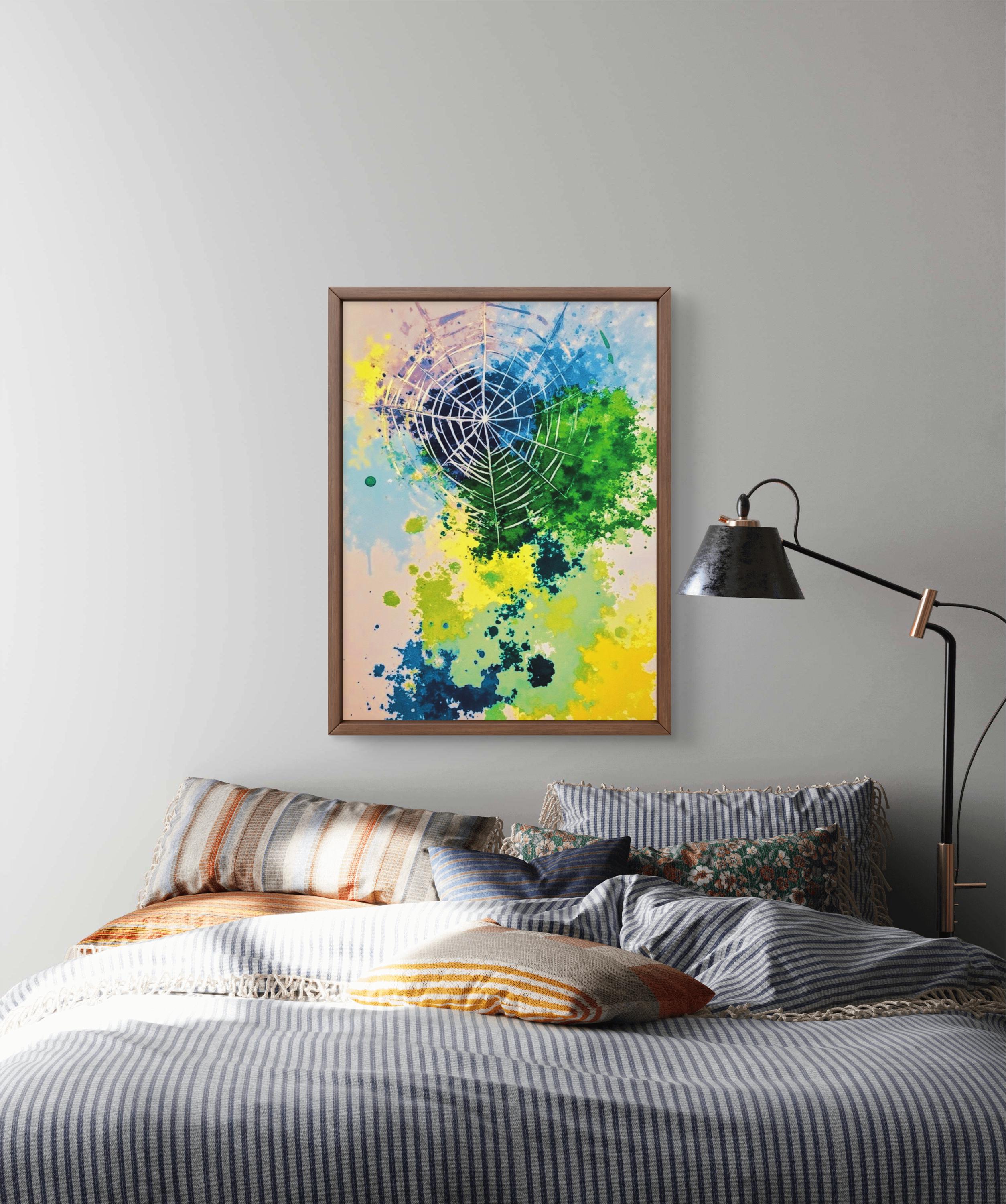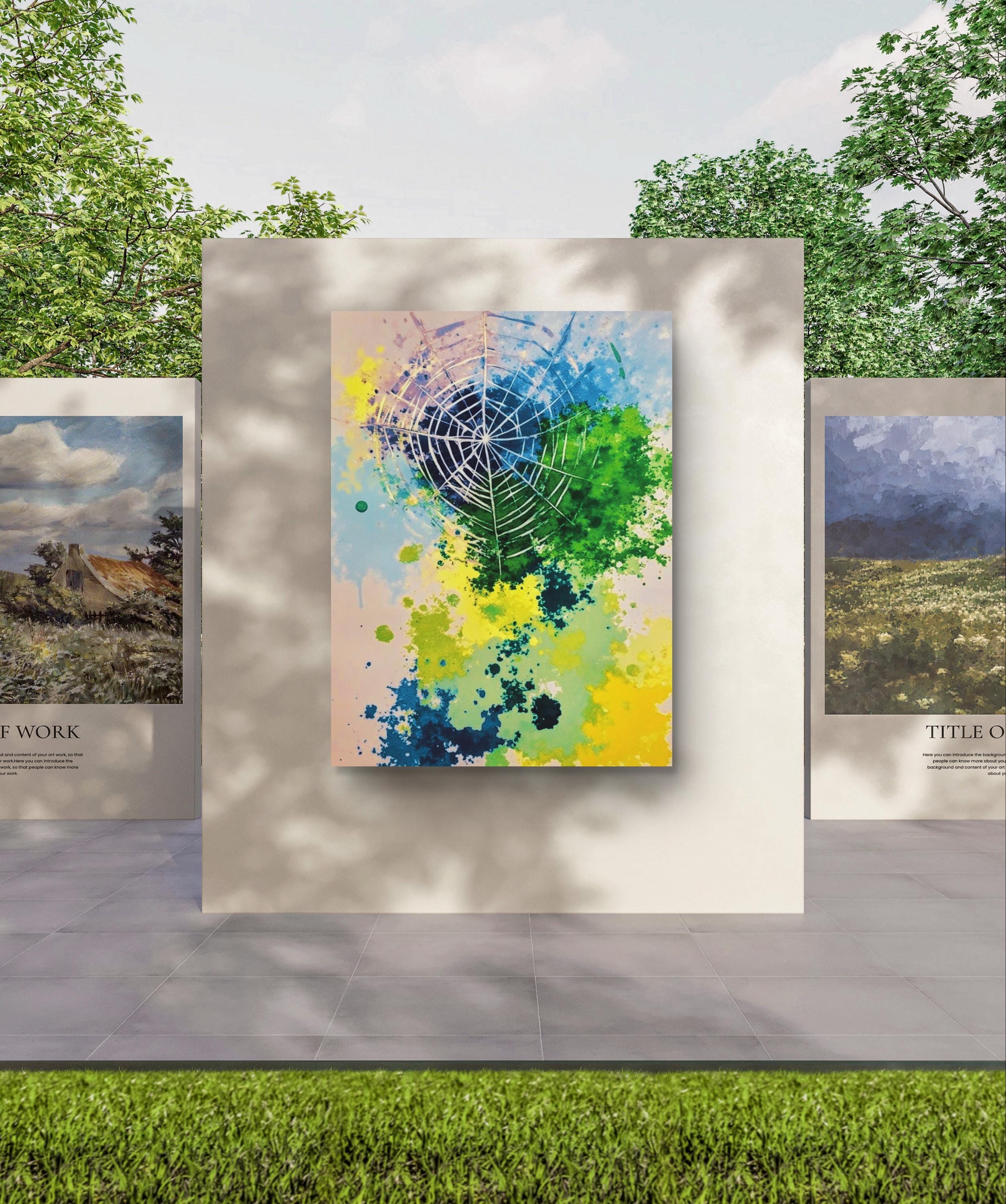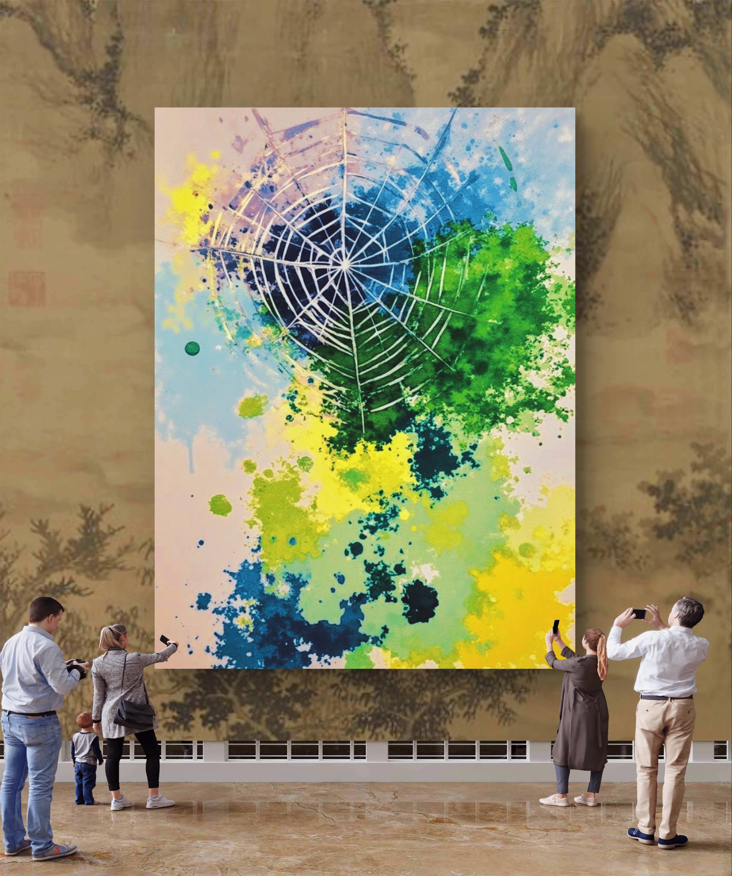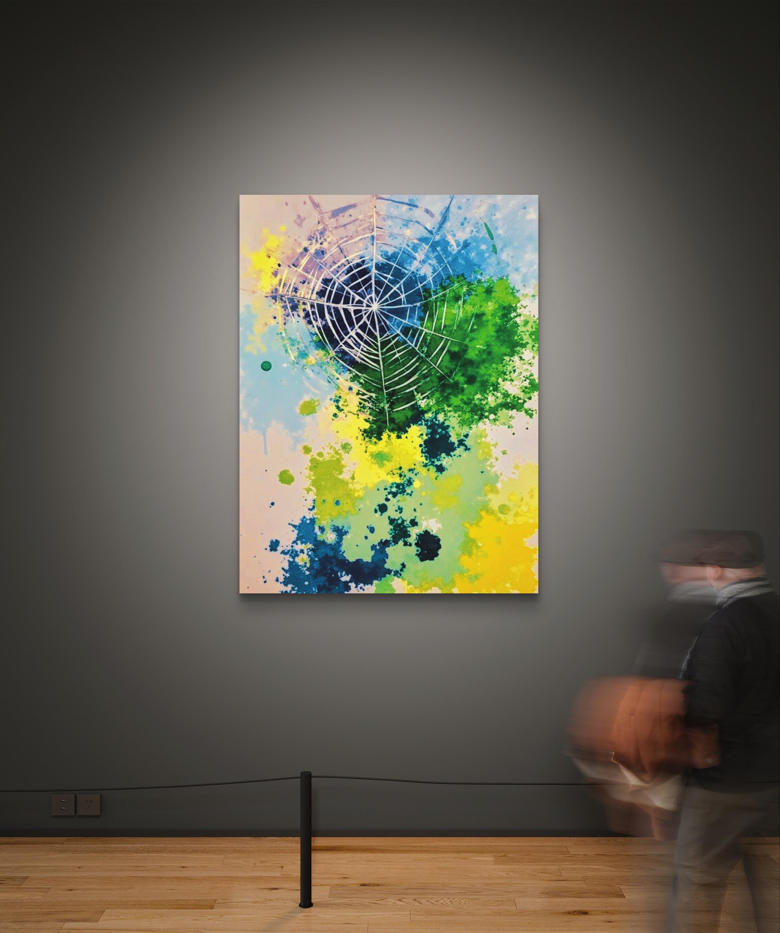 Immerse yourself in “Web of Creation”, an abstract acrylic painting that captures the intricate balance between chaos and order. The artwork radiates from a central web-like structure — a symbol of interconnectedness and life’s invisible threads. Vibrant splashes of blue, green, and yellow explode outward, suggesting energy, growth, and the boundless movement of nature.