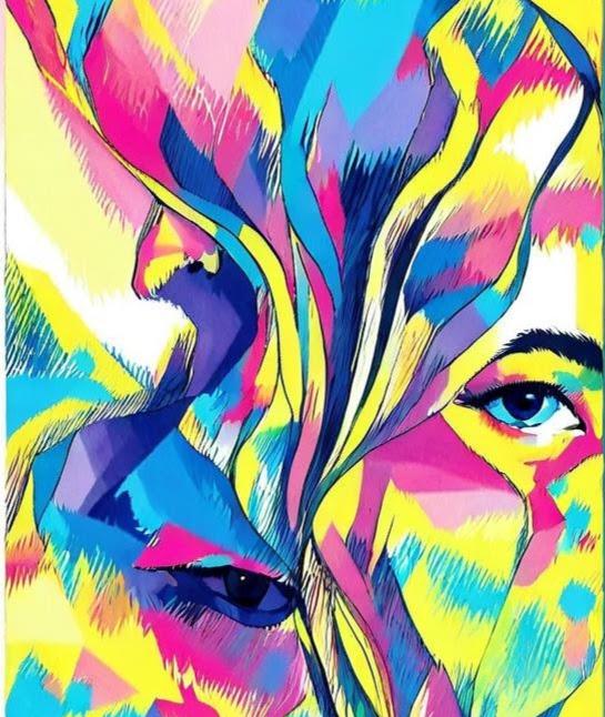 This artwork is a vibrant, abstract–figurative portrait that blends bold color fields with flowing, organic shapes. The composition features two expressive human eyes, partially concealed within dynamic layers of color. These layers resemble ribbons, fabric, or waves, creating a sense of movement, transformation, and emotional depth.