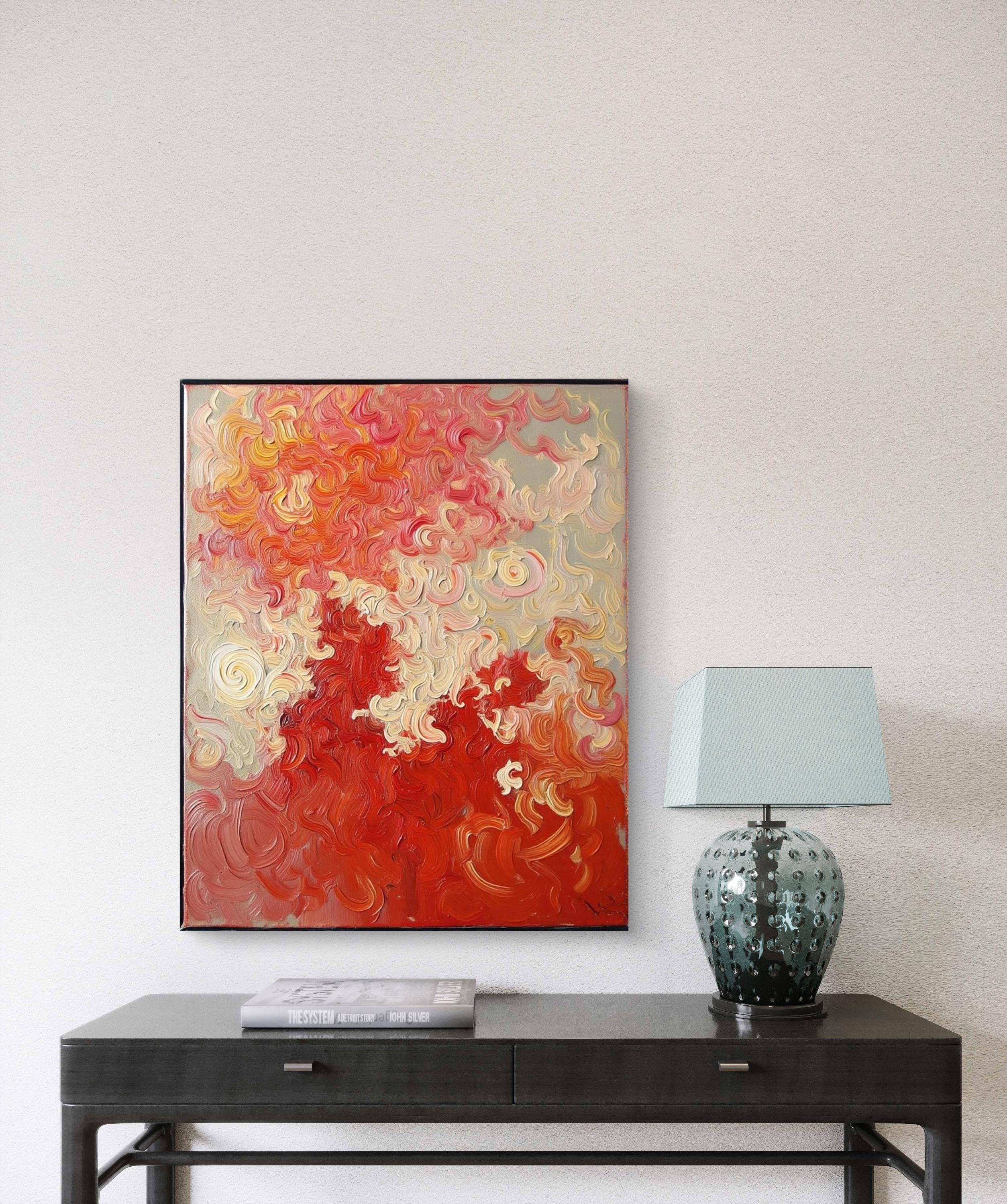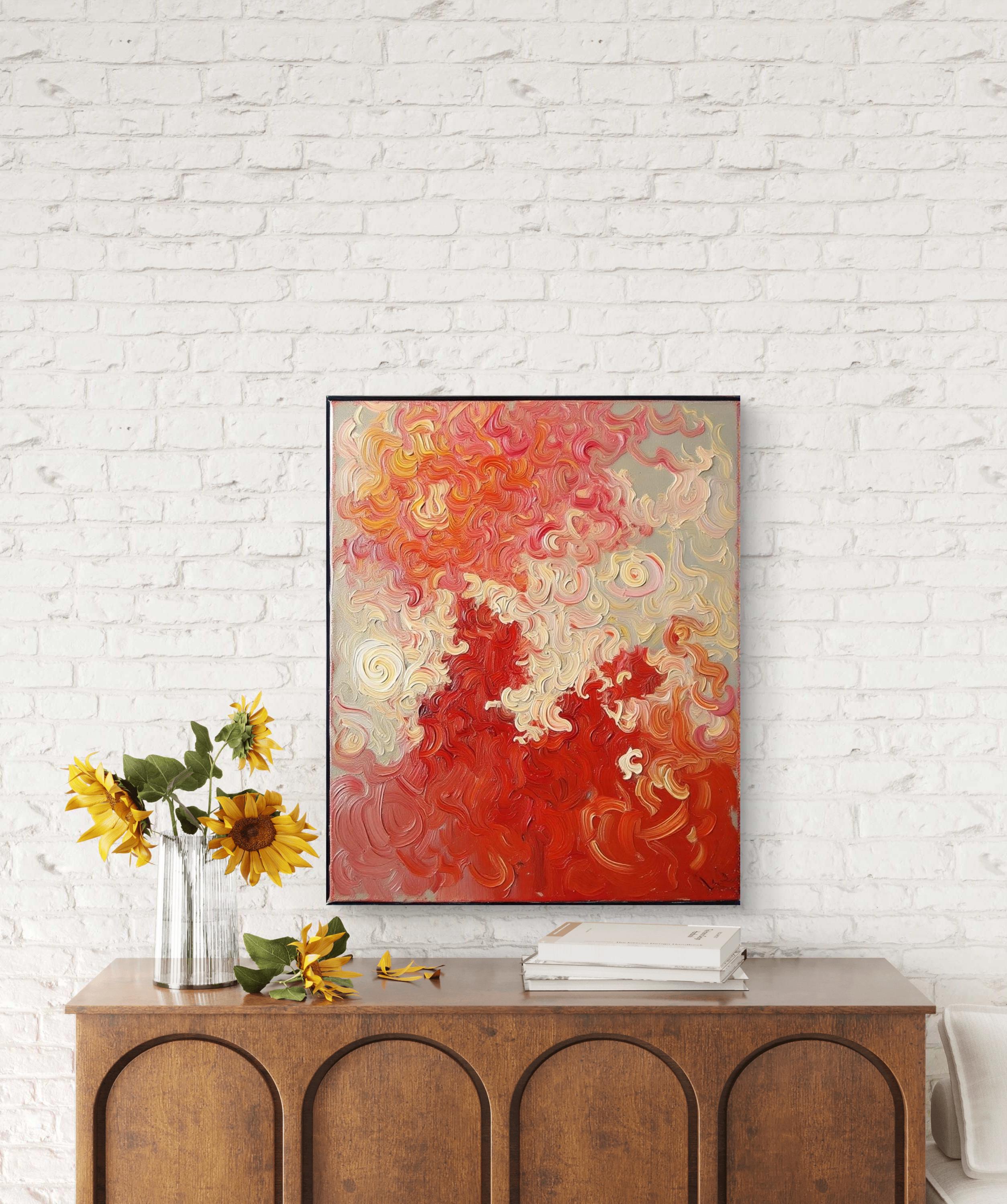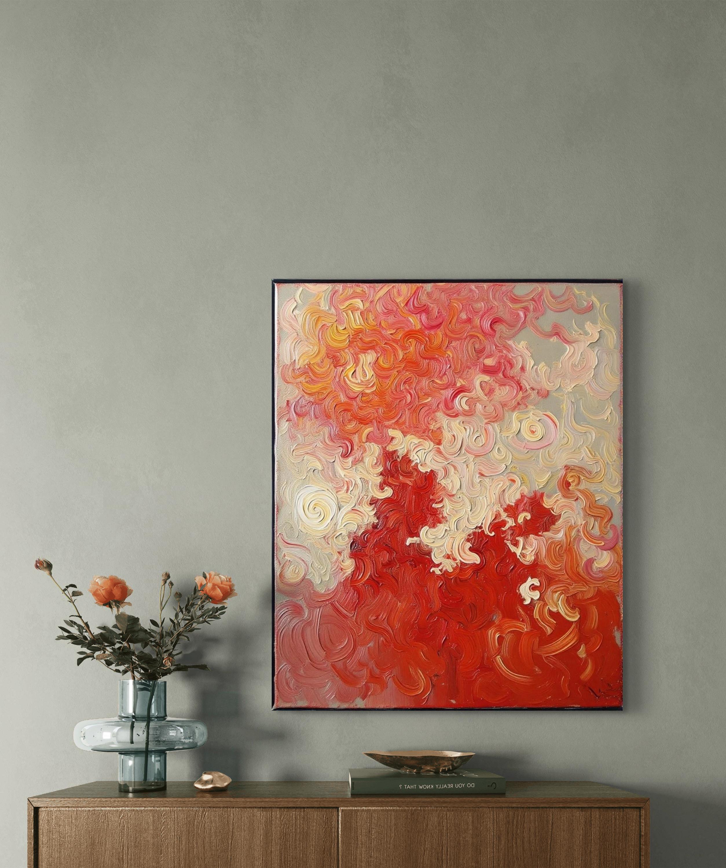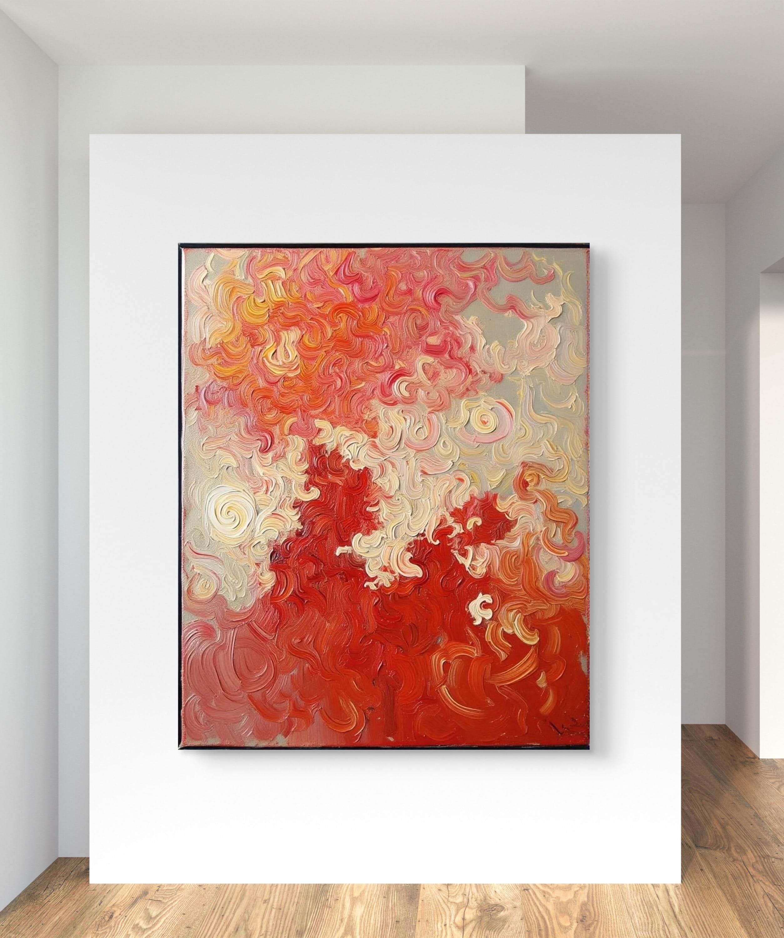 This Abstract Canvas Print Add a burst of vibrant energy to your space with this bold and elegant abstract canvas print, titled Flame Whispers. This piece is a high-quality print of my original hand-painted artwork, featuring vivid swirling patterns in rich reds, soft creams, and fiery oranges. The textured brushstroke effect creates a dynamic movement that draws the eye and transforms any room.