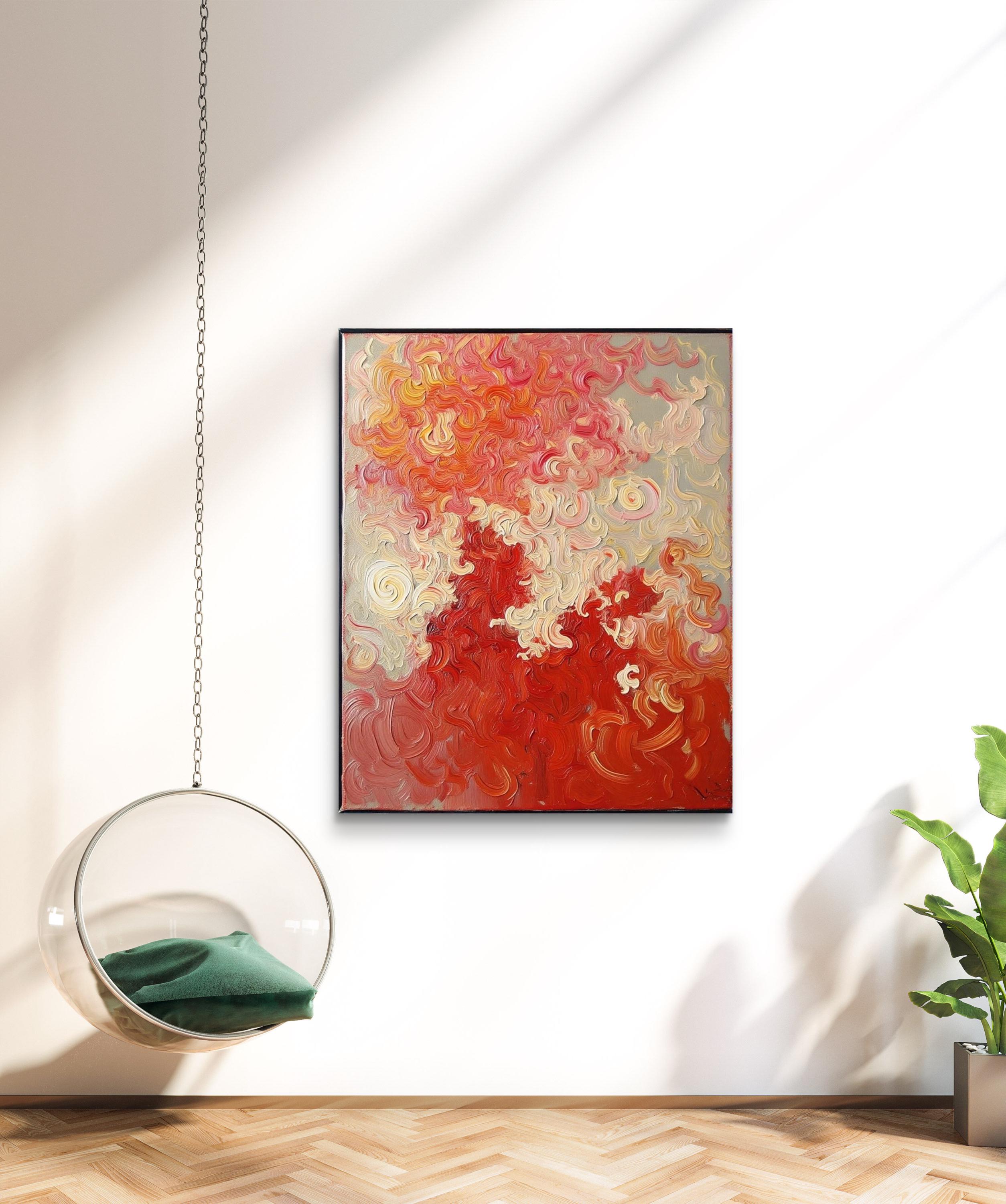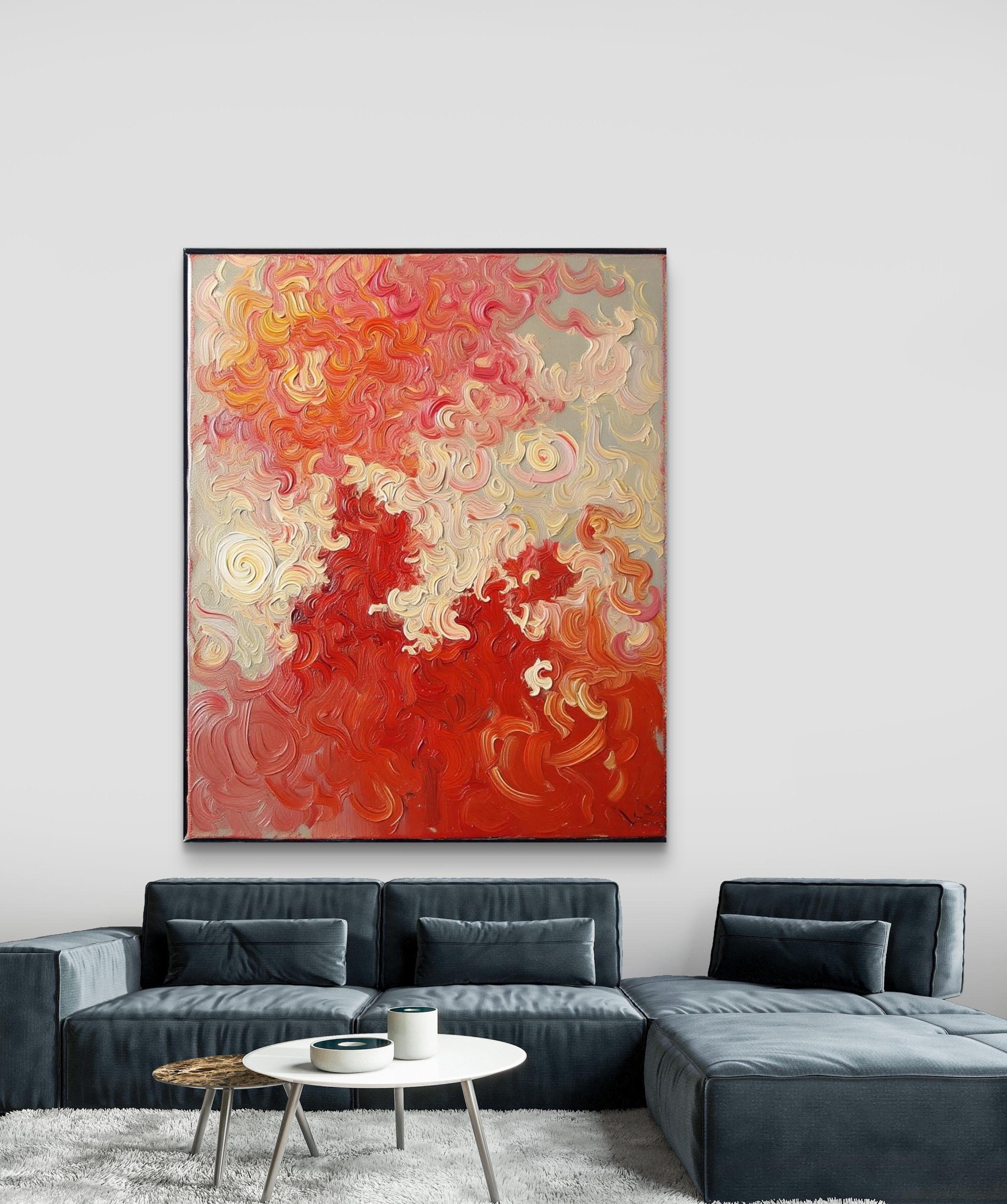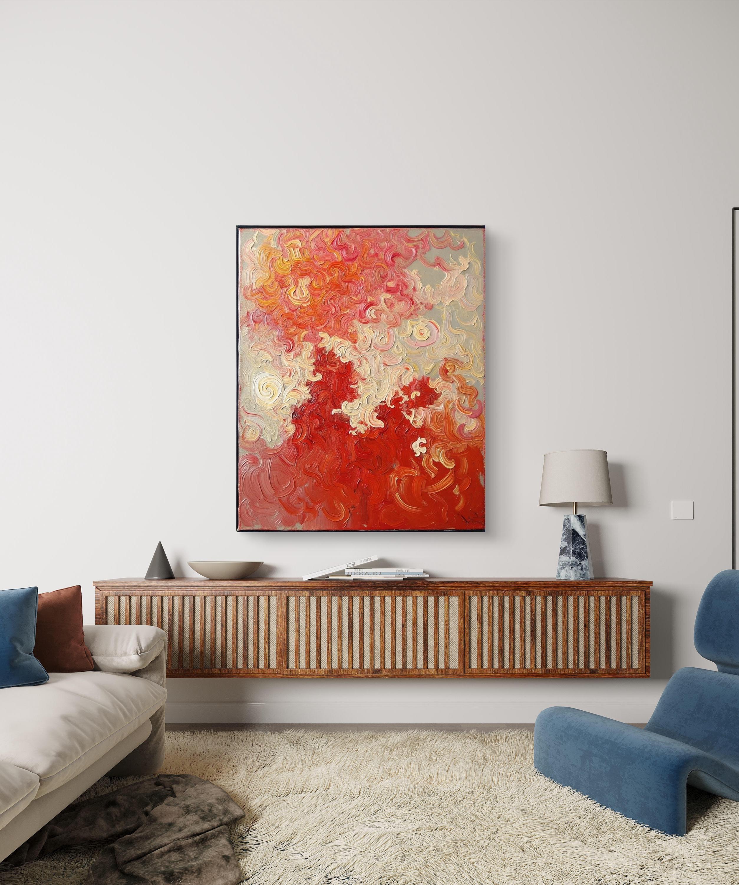 This Abstract Canvas Print Add a burst of vibrant energy to your space with this bold and elegant abstract canvas print, titled Flame Whispers. This piece is a high-quality print of my original hand-painted artwork, featuring vivid swirling patterns in rich reds, soft creams, and fiery oranges. The textured brushstroke effect creates a dynamic movement that draws the eye and transforms any room.