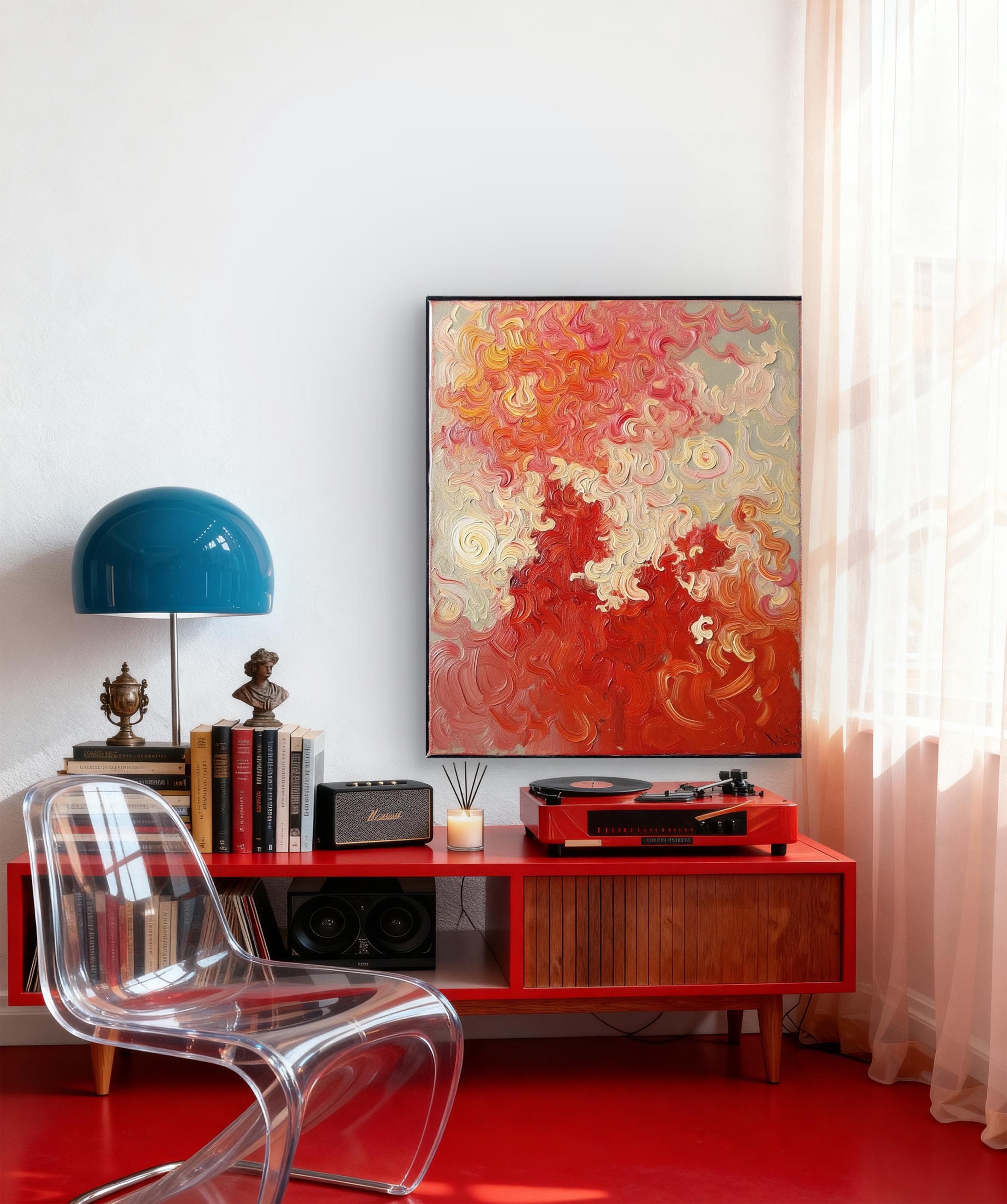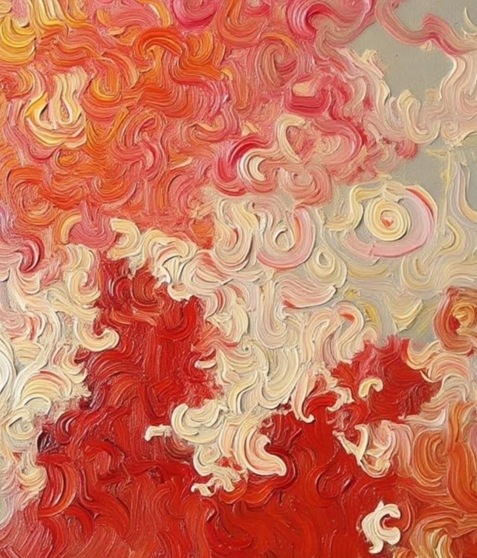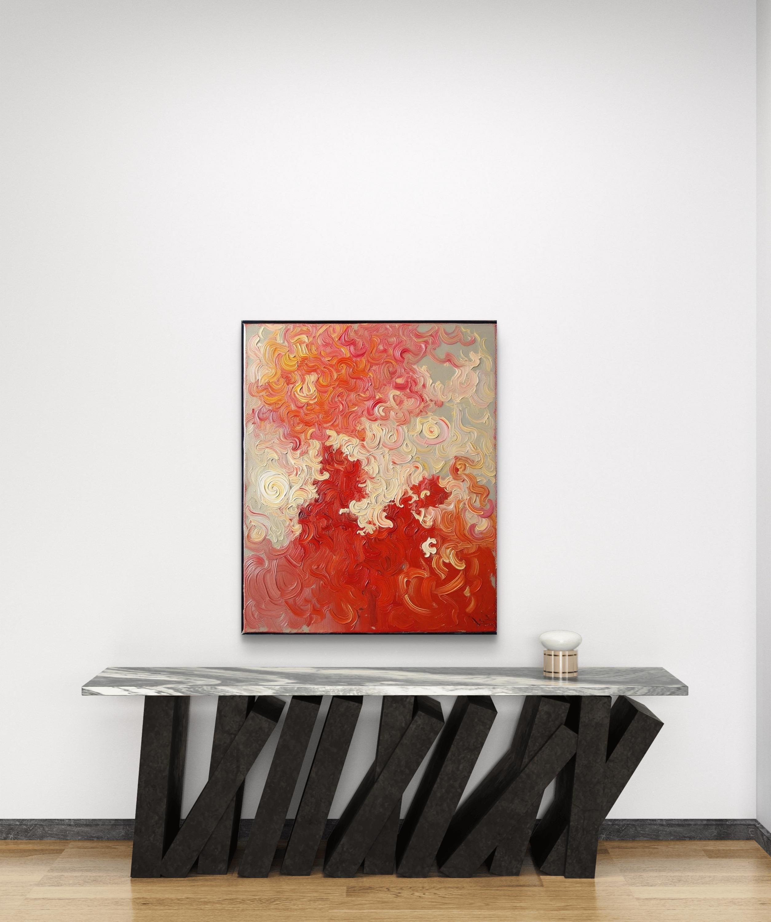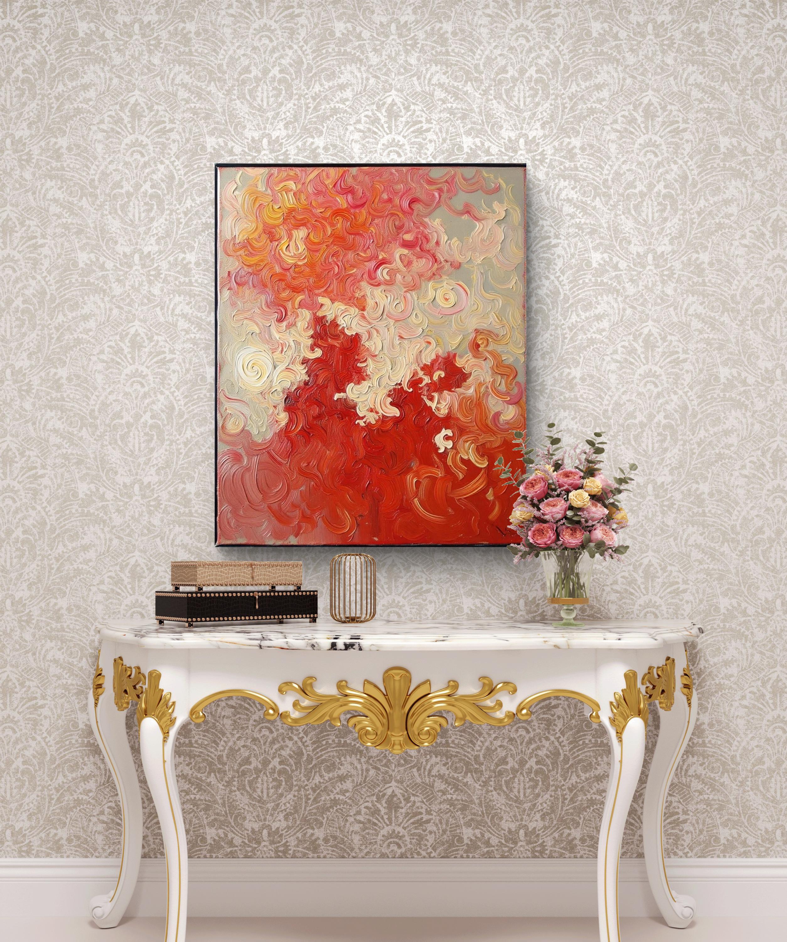 This Abstract Canvas Print Add a burst of vibrant energy to your space with this bold and elegant abstract canvas print, titled Flame Whispers. This piece is a high-quality print of my original hand-painted artwork, featuring vivid swirling patterns in rich reds, soft creams, and fiery oranges. The textured brushstroke effect creates a dynamic movement that draws the eye and transforms any room.
