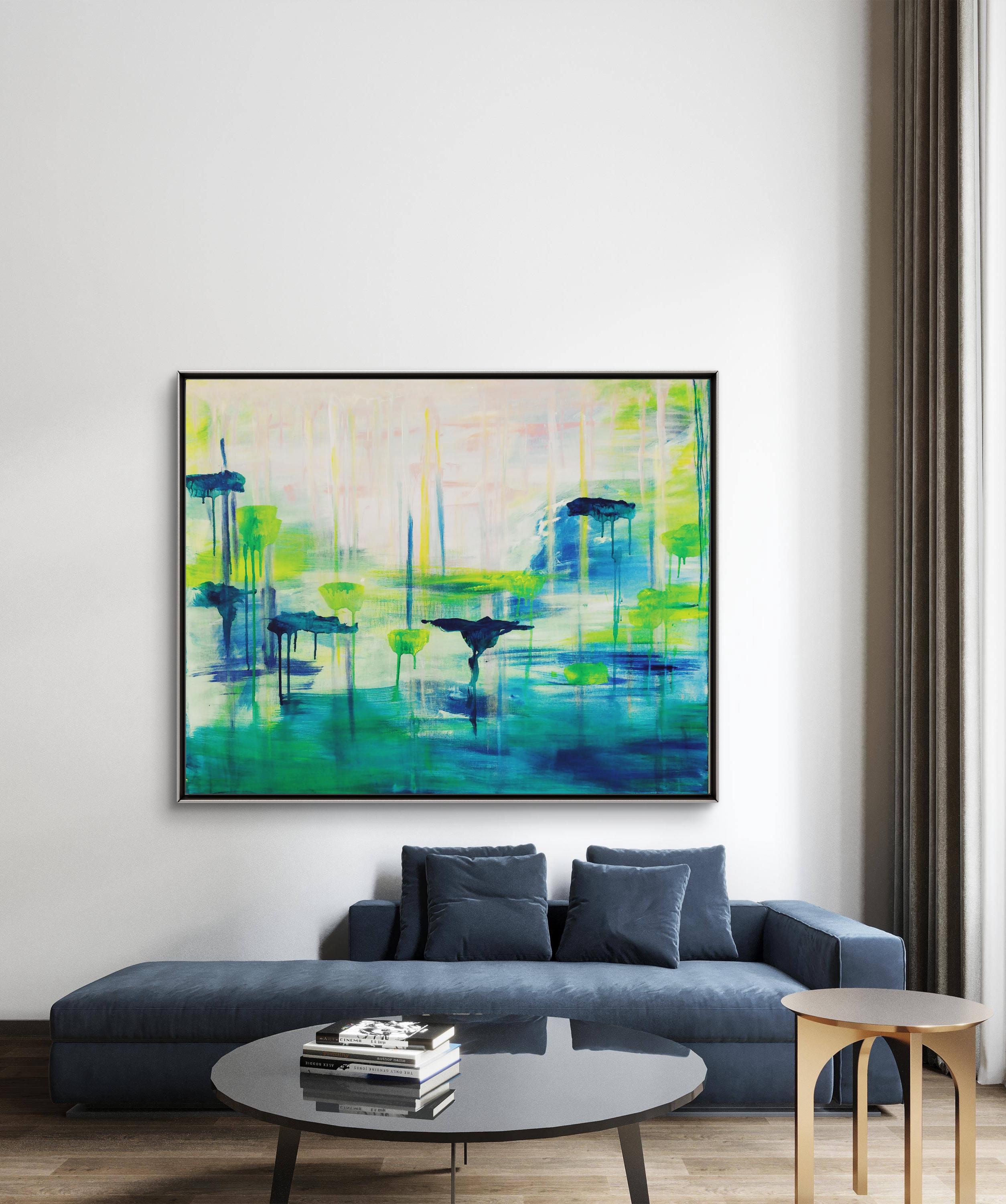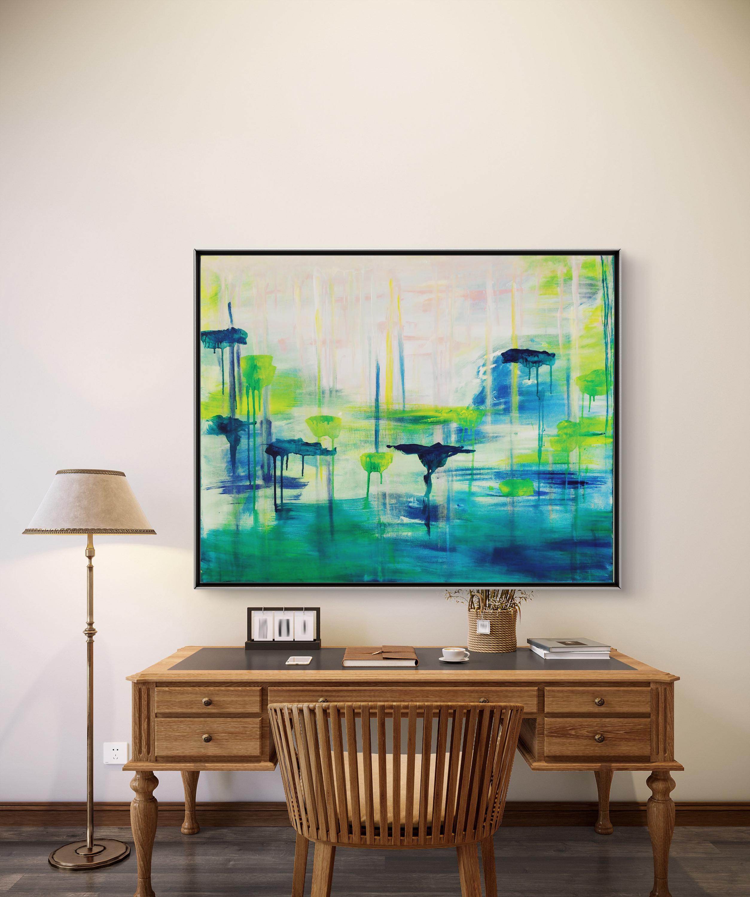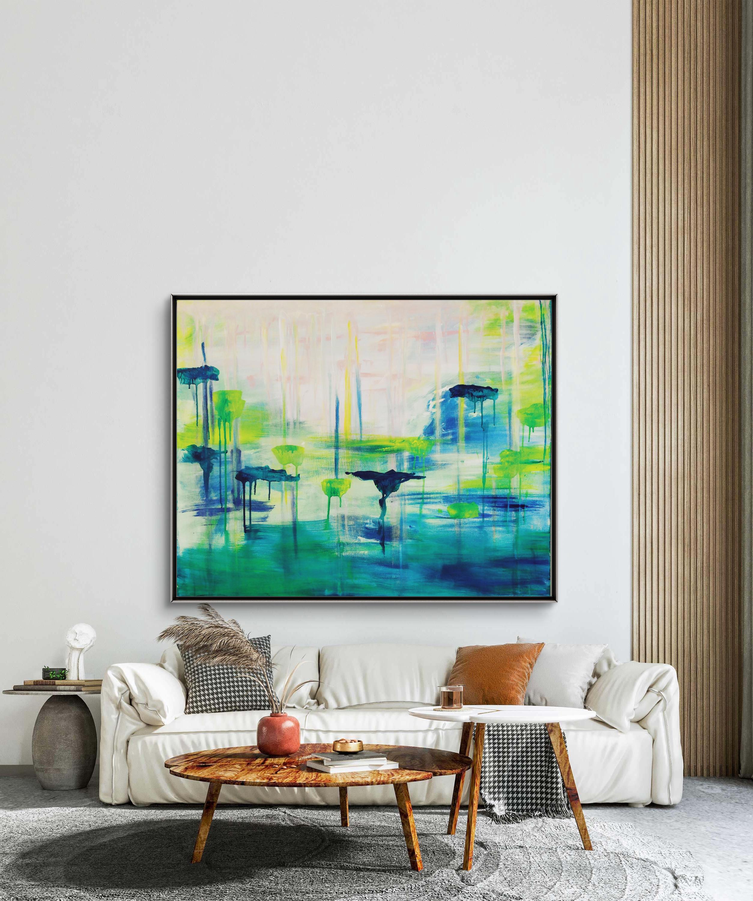 Large Watercolor Style Canvas Painting, Bring the calming essence of nature into your home with this large abstract forest landscape wall art. Featuring a dreamy composition of lush greenery, shimmering water reflections, and soft sunlight, this watercolor-style painting evokes the beauty and serenity of a forested marsh. The fluid brushstrokes and dripping textures blend shades of green, yellow, and blue to create a tranquil atmosphere perfect for any modern or contemporary space.