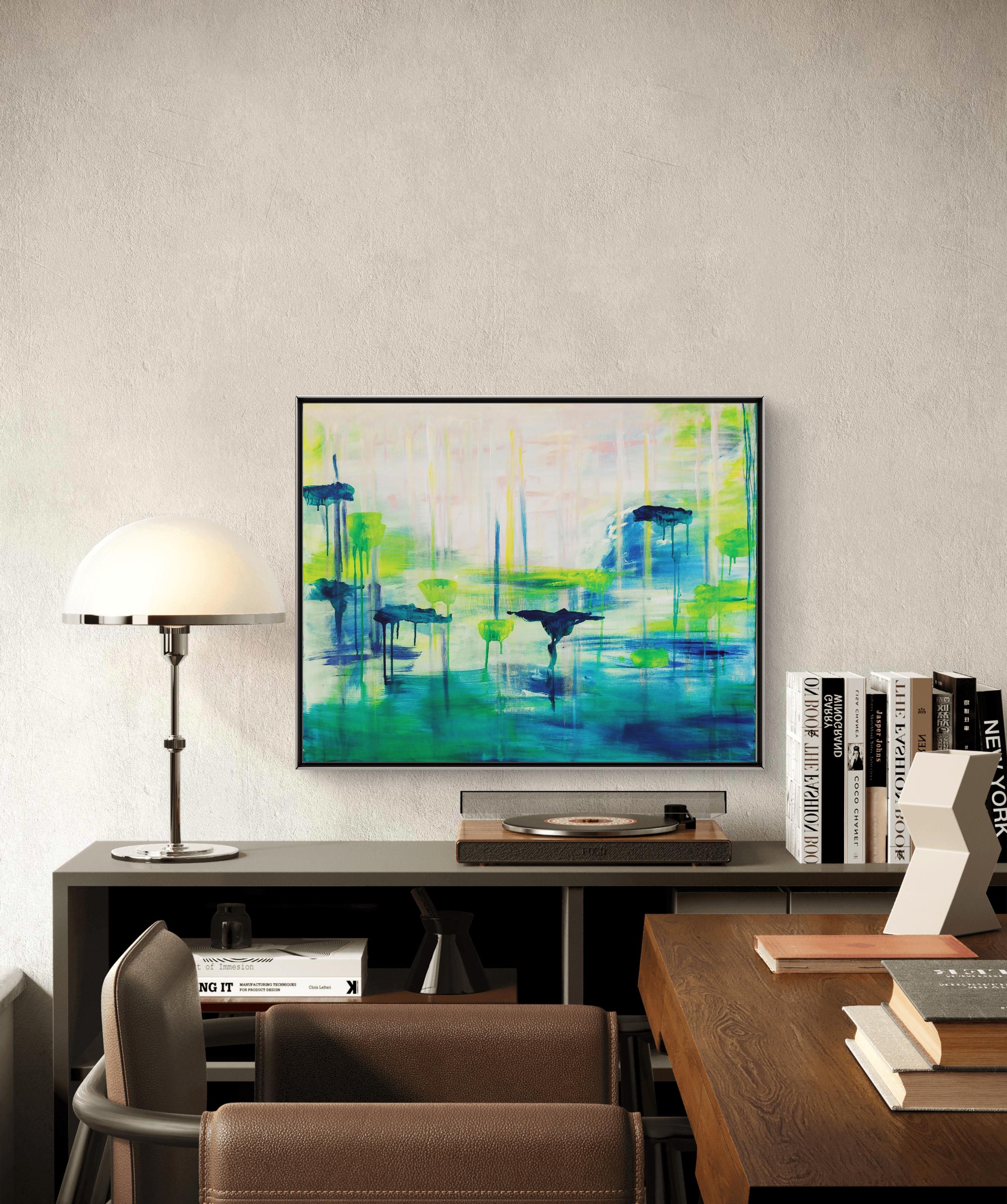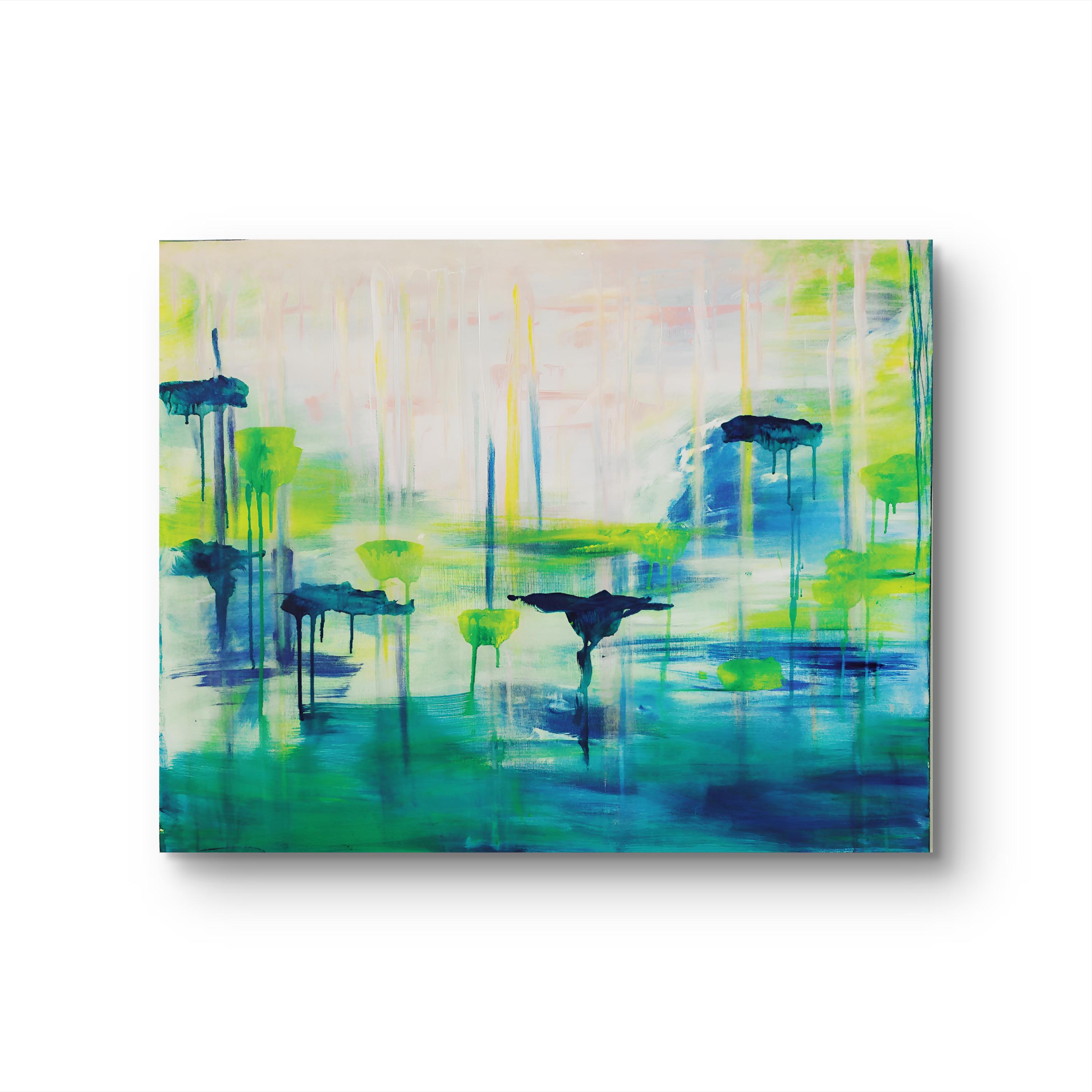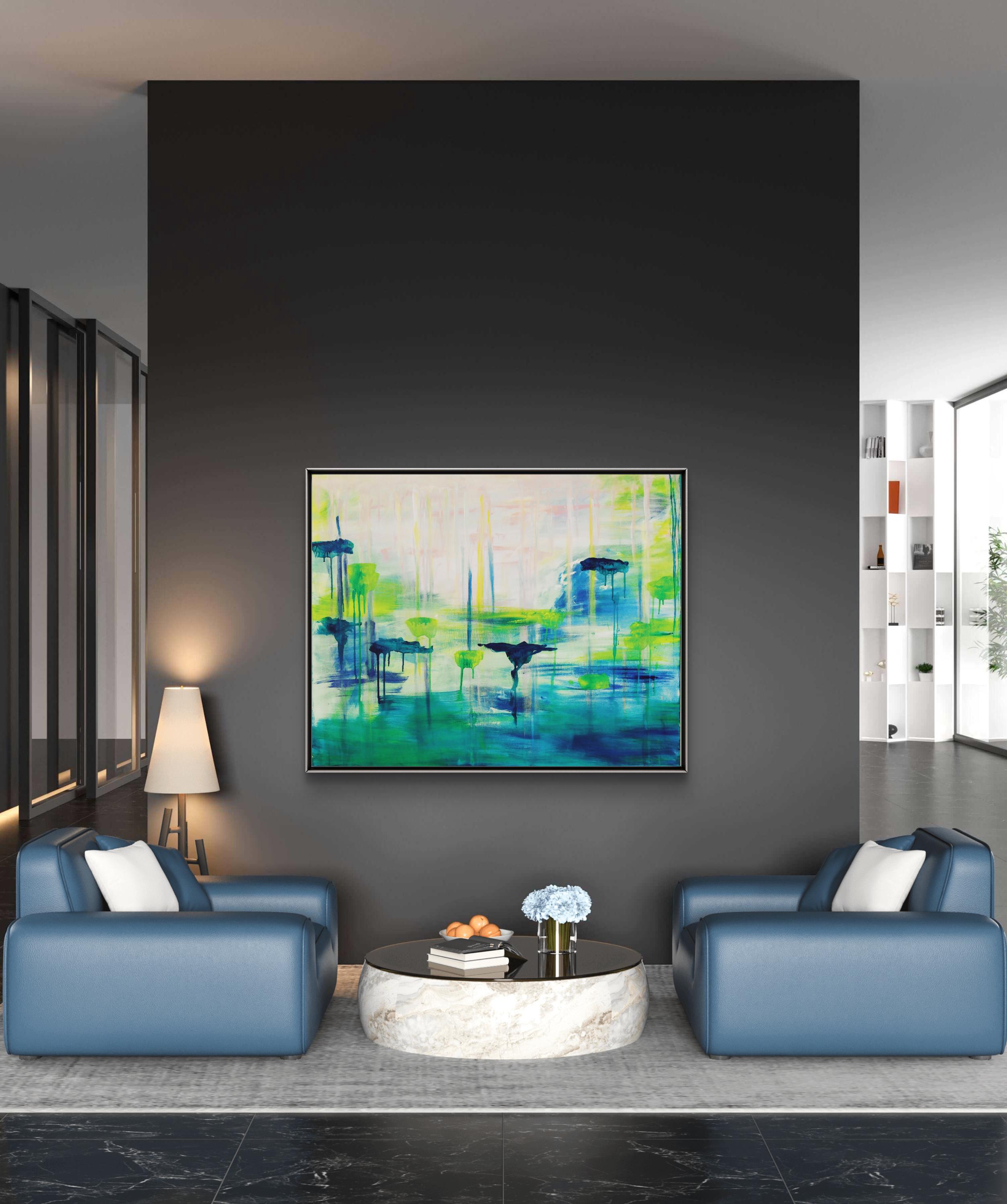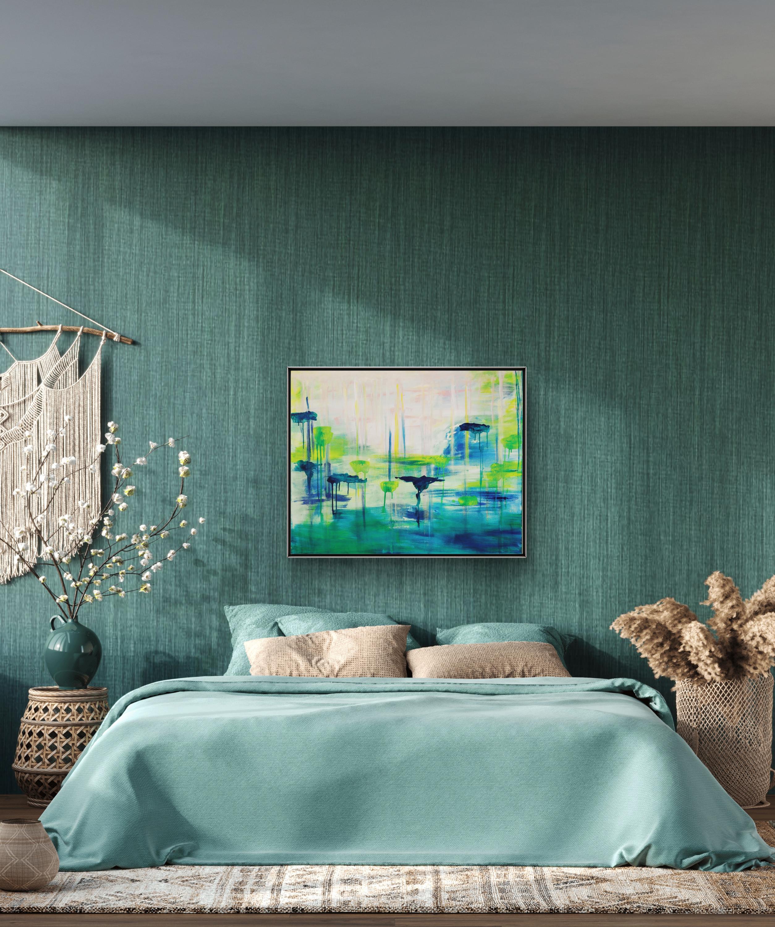Large Watercolor Style Canvas Painting, Bring the calming essence of nature into your home with this large abstract forest landscape wall art. Featuring a dreamy composition of lush greenery, shimmering water reflections, and soft sunlight, this watercolor-style painting evokes the beauty and serenity of a forested marsh. The fluid brushstrokes and dripping textures blend shades of green, yellow, and blue to create a tranquil atmosphere perfect for any modern or contemporary space.