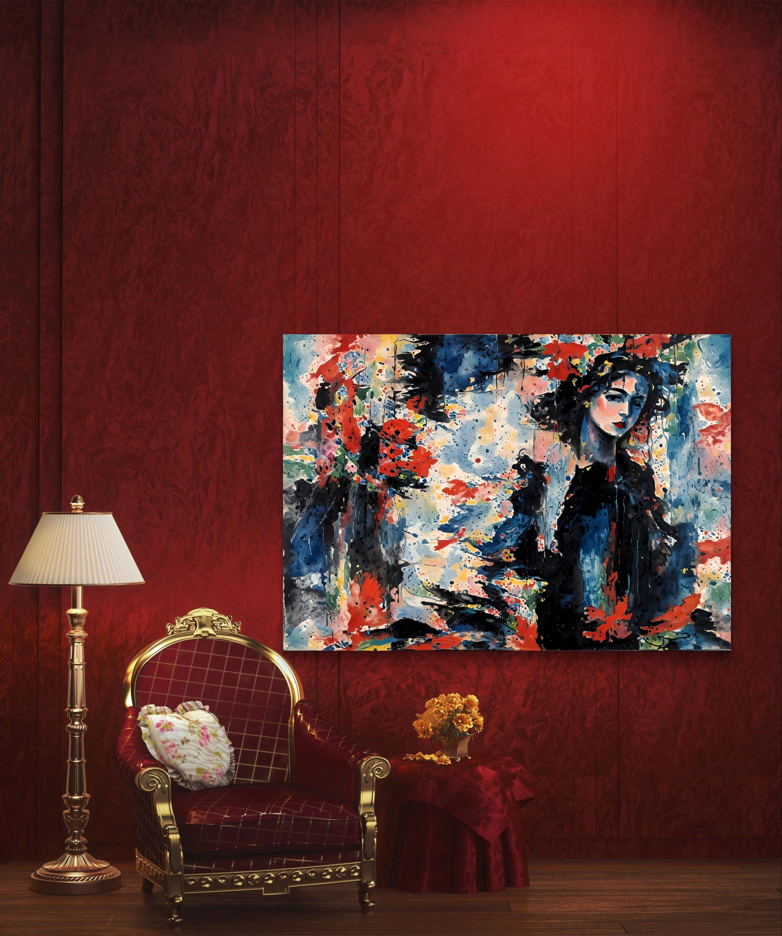 The painting presents a striking fusion of abstraction and figuration. At the center-right, a graceful female figure emerges from a storm of expressive color—her face serene yet enigmatic, framed by dark flowing hair adorned with vivid red and yellow accents. Her calm, almost melancholic expression contrasts with the energetic surroundings.
