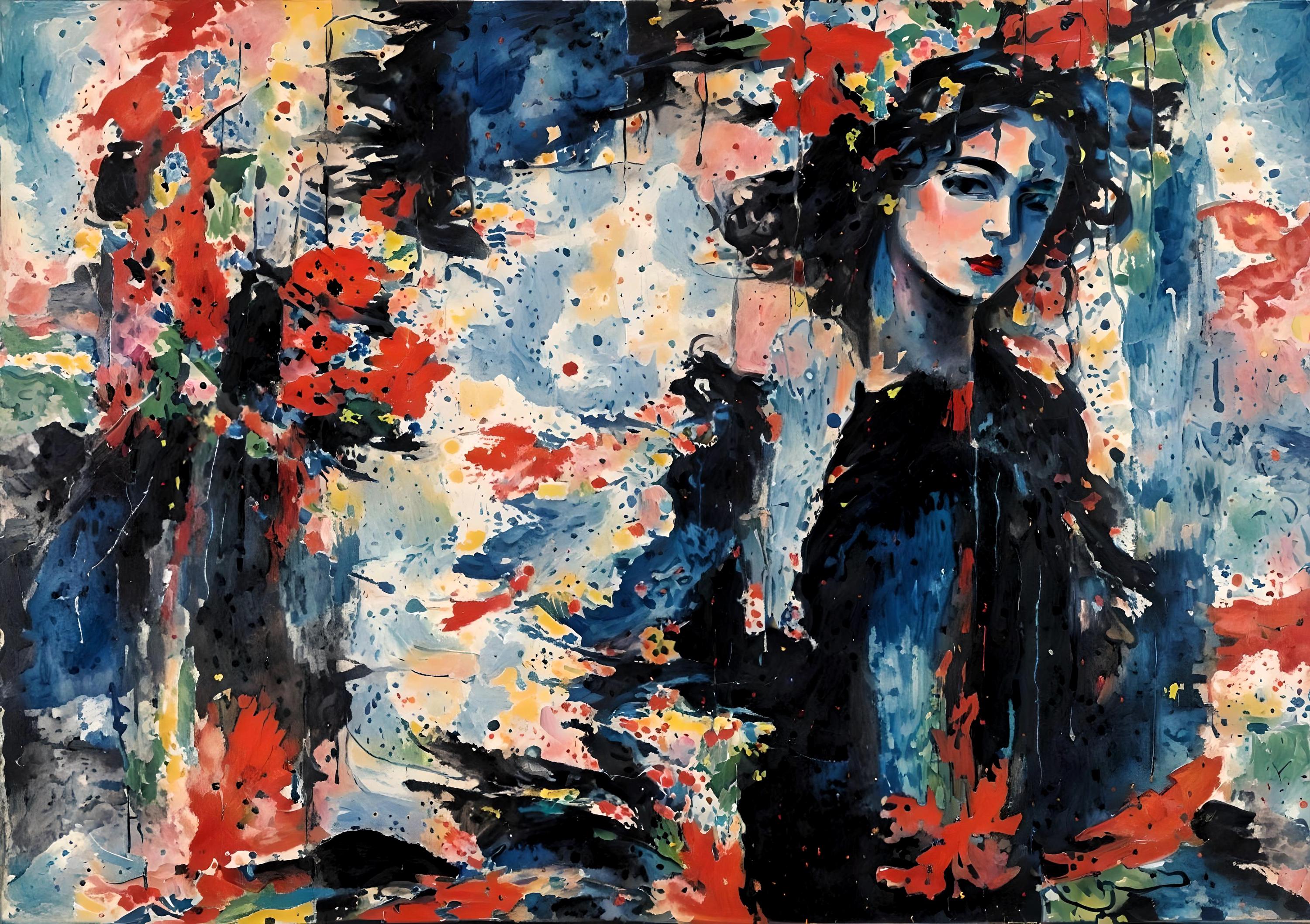 The rest of the composition is an explosion of motion: splashes of red, blue, black, and pastel tones swirl across the canvas in fluid, organic forms. The background feels like a dreamscape—part floral, part atmospheric—where shapes dissolve into color and color becomes emotion. The interplay between soft washes and bold splatters creates a sense of movement and emotional depth.