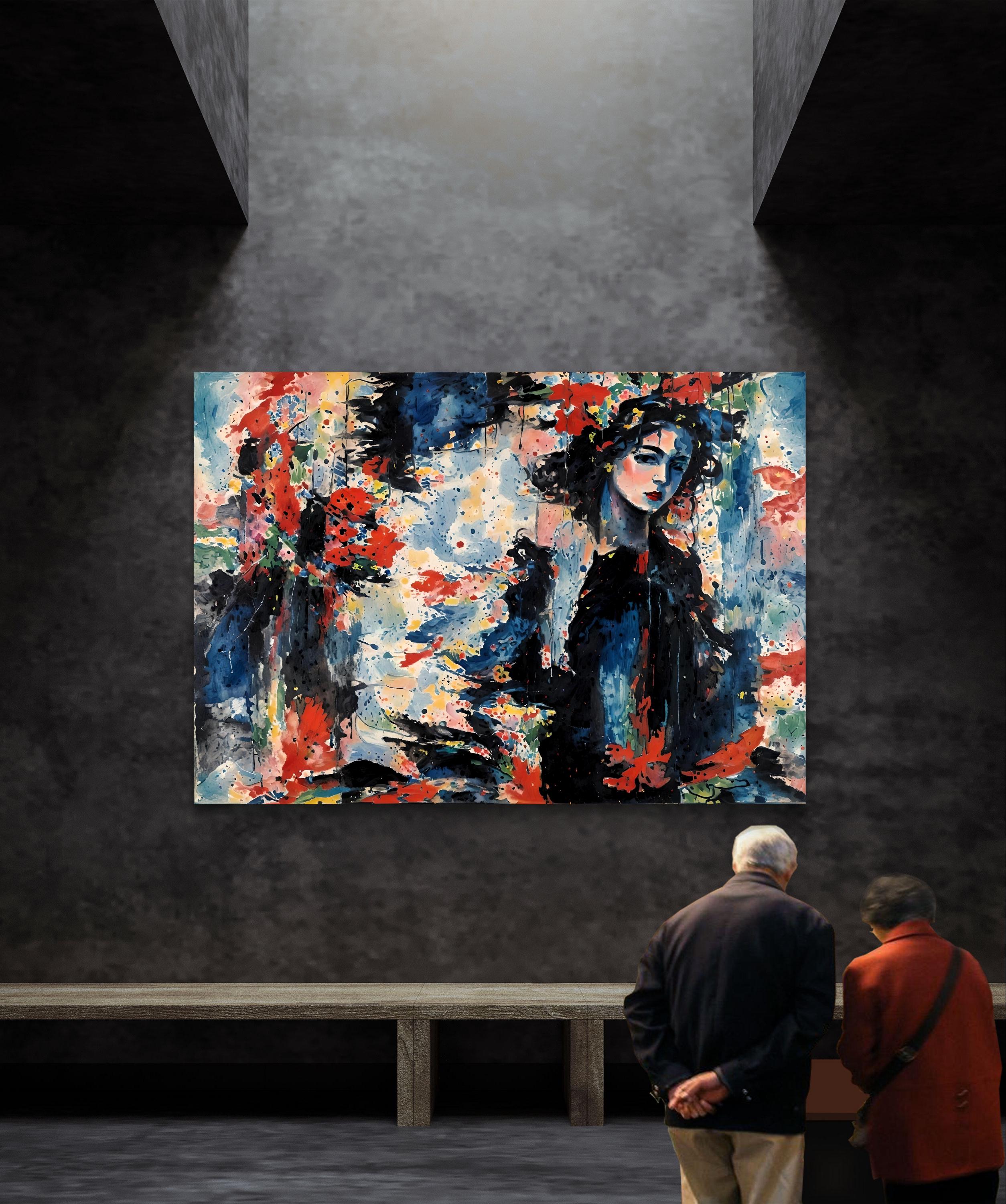 Figurative–Abstract Fusion: The woman’s face is rendered with sensitivity and softness, which contrasts beautifully with the energetic, almost wild abstraction around her. This contrast suggests themes such as: