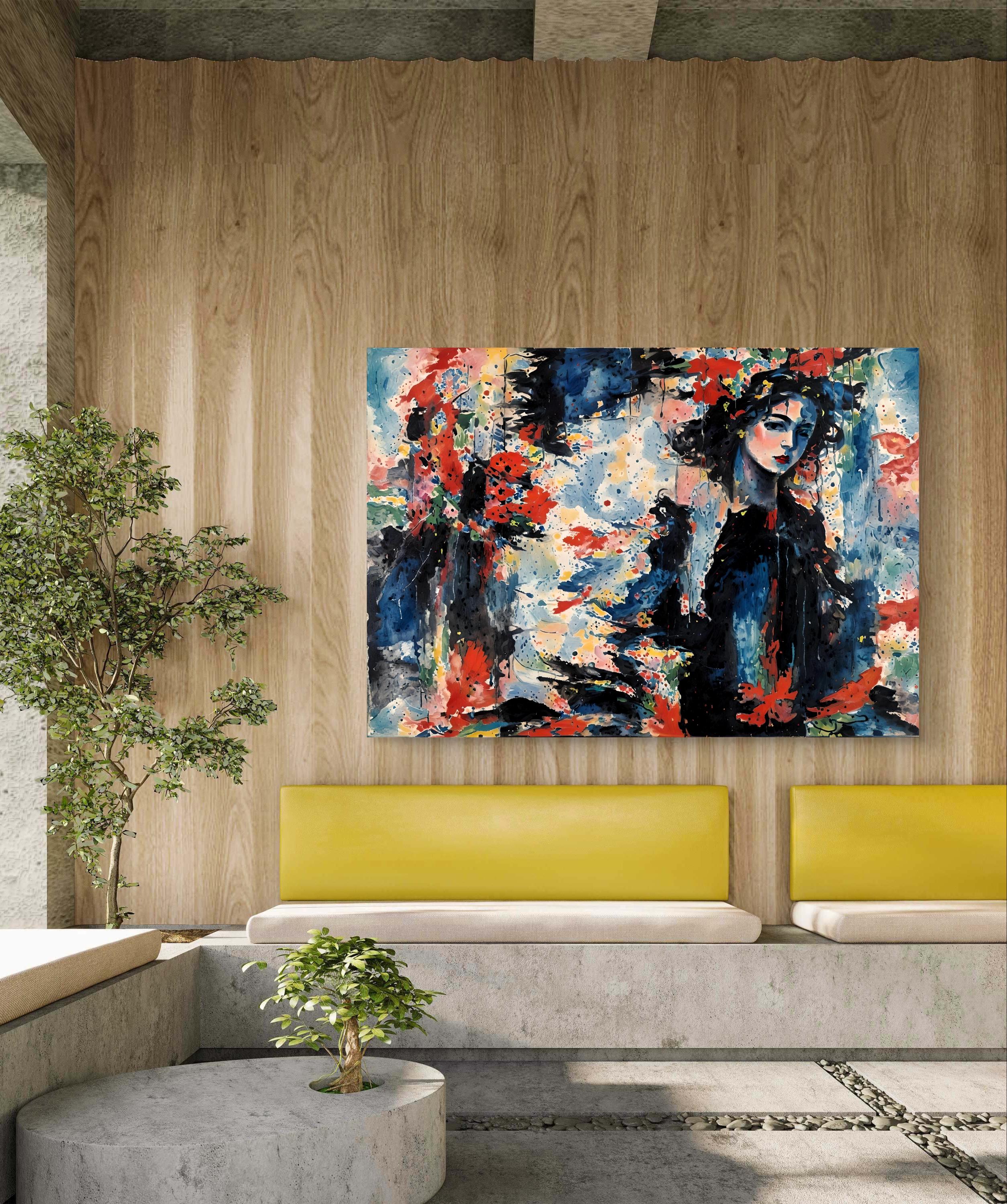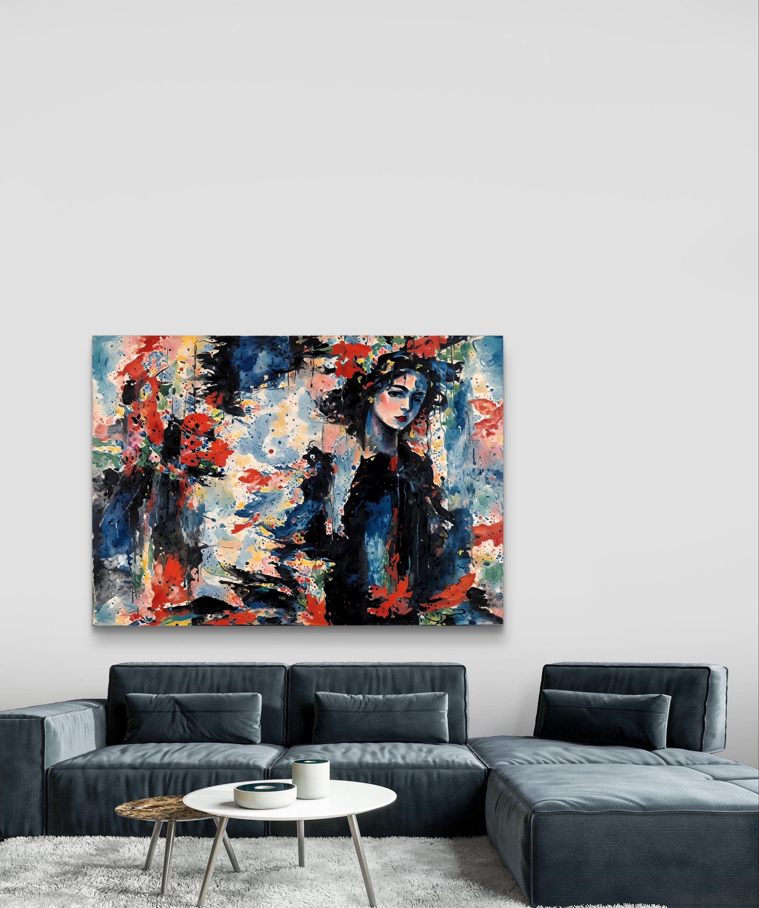 Composition : The composition skillfully balances chaos and control. The right side anchors the painting with the woman's figure—realistic, calm, and detailed. The left side is more abstract and expressive, filled with color bursts and layered textures.