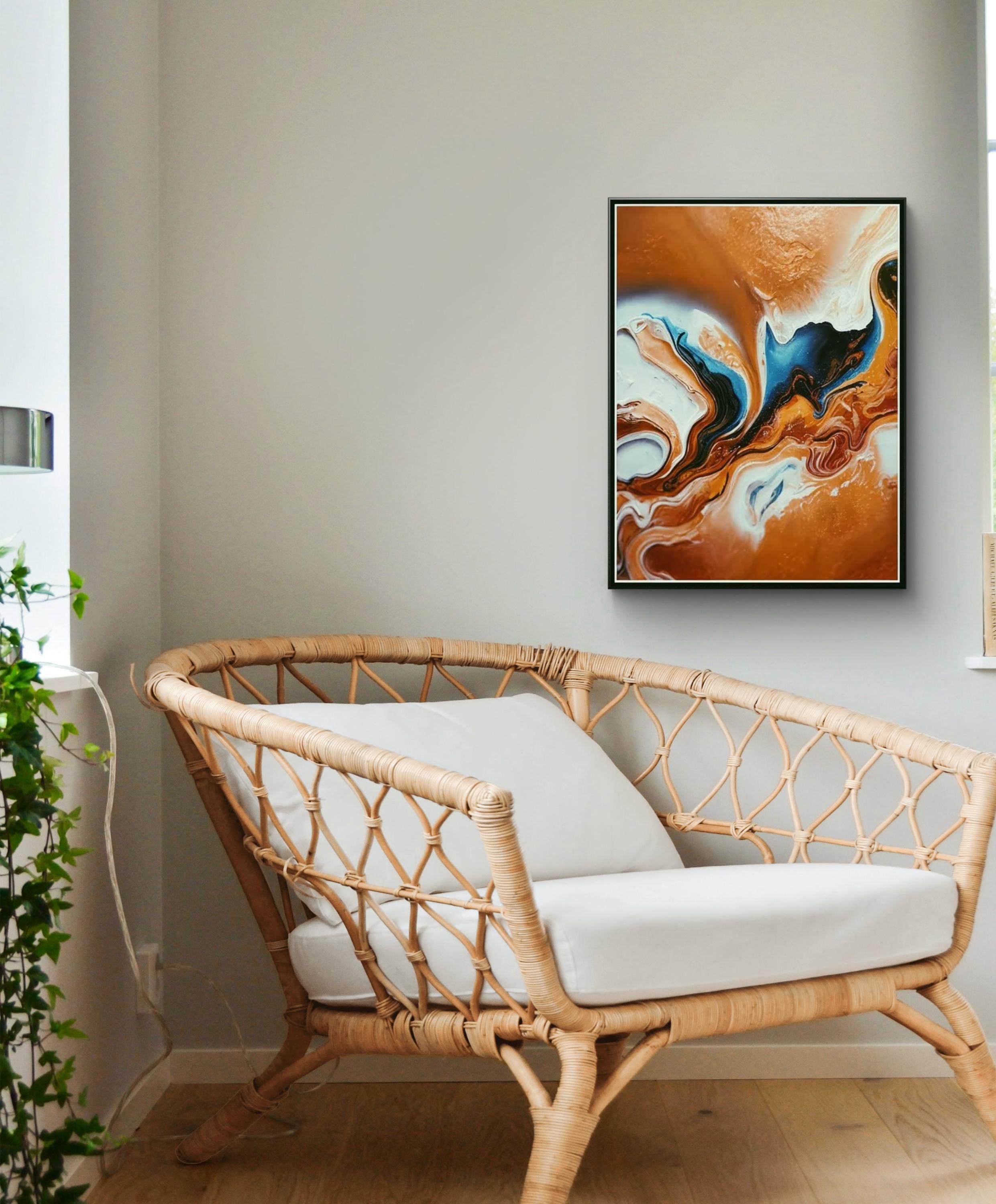 This abstract painting presents a captivating flow of warm and cool tones blending together in a dynamic, fluid motion. Rich shades of burnt ge and terracotta dominate the composition, swirling gracefully with creamy white and hints of deep navy and turquoise. The colors meet in sweeping curves and wave-like forms, creating the impression of natural forces in motion—such as molten earth, ocean tides, or flowing energy. The central blue shape appears almost like a rising wave or a wing emerging from the warm surroundings, adding contrast and dramatic visual tension.