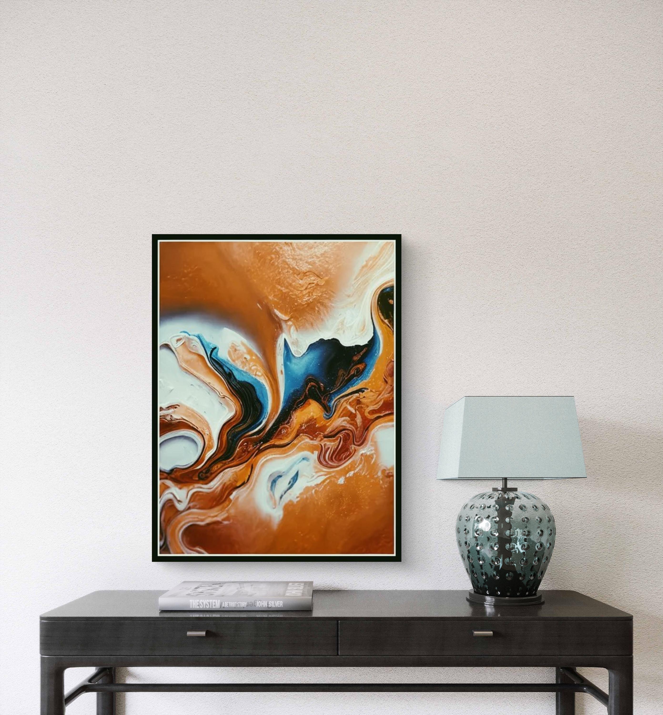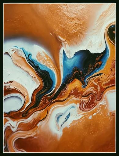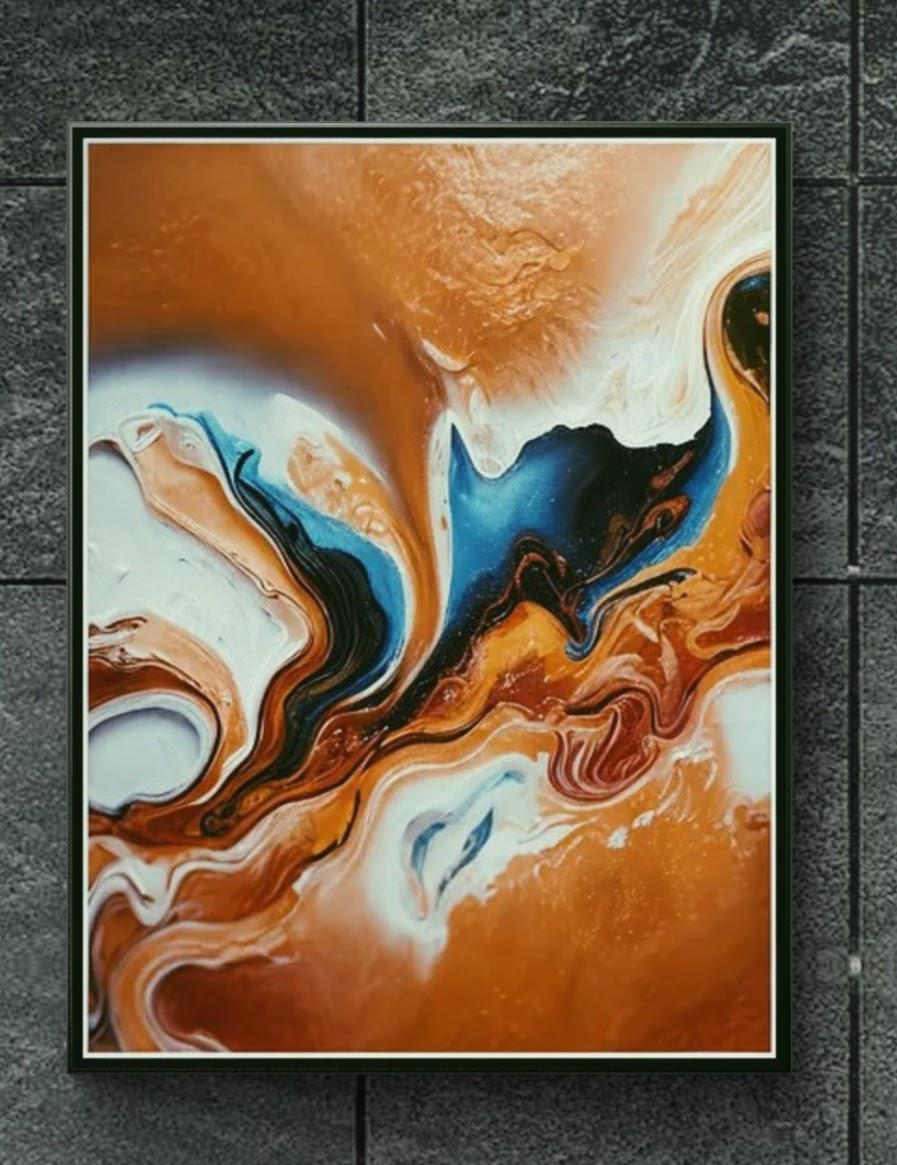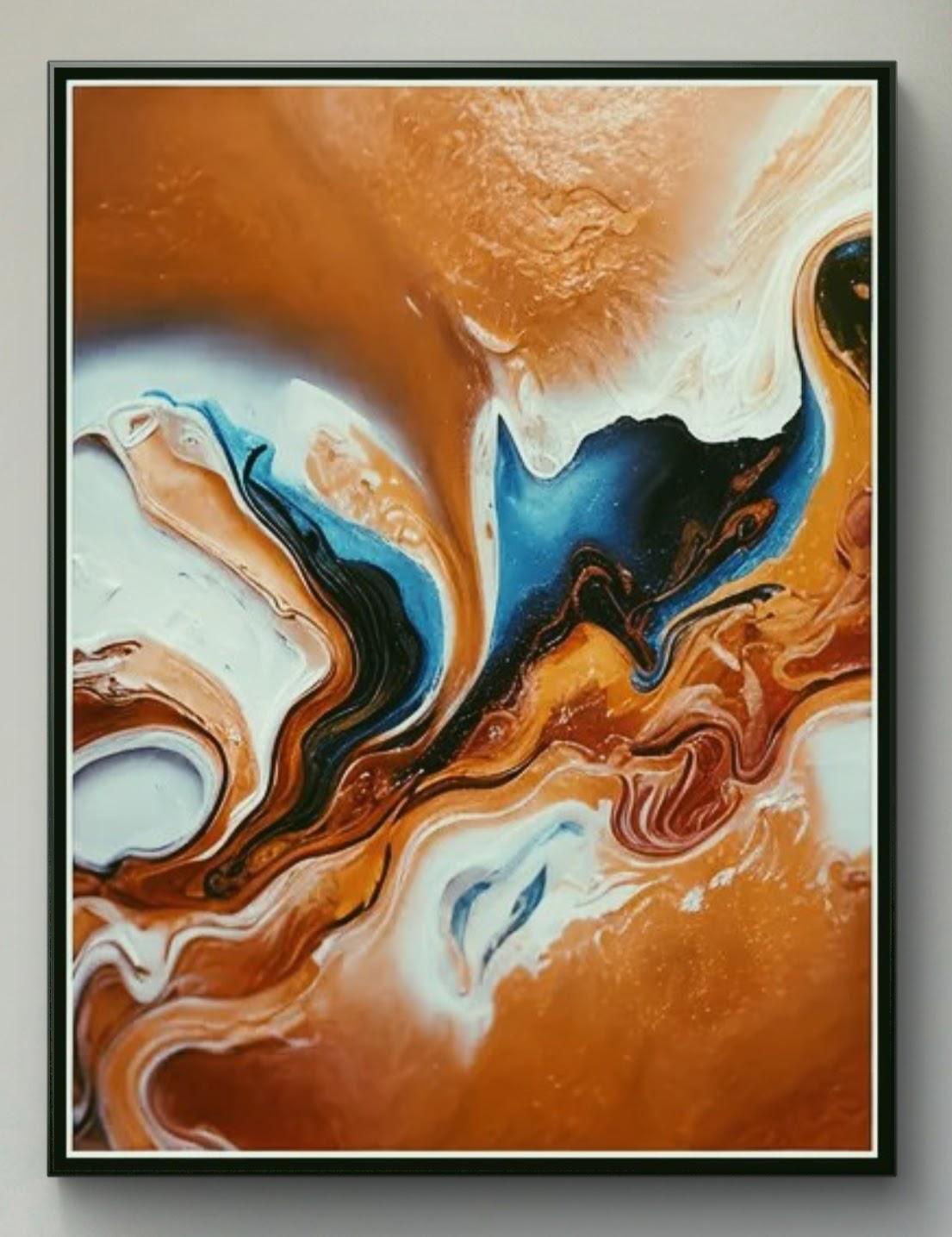 Fluid Movement and Flow -The painting uses fluid, swirling lines that mimic the natural movement of liquids. The blending and marbling of colors suggest motion and transformation, inviting the viewer to follow the curves throughout the canvas.