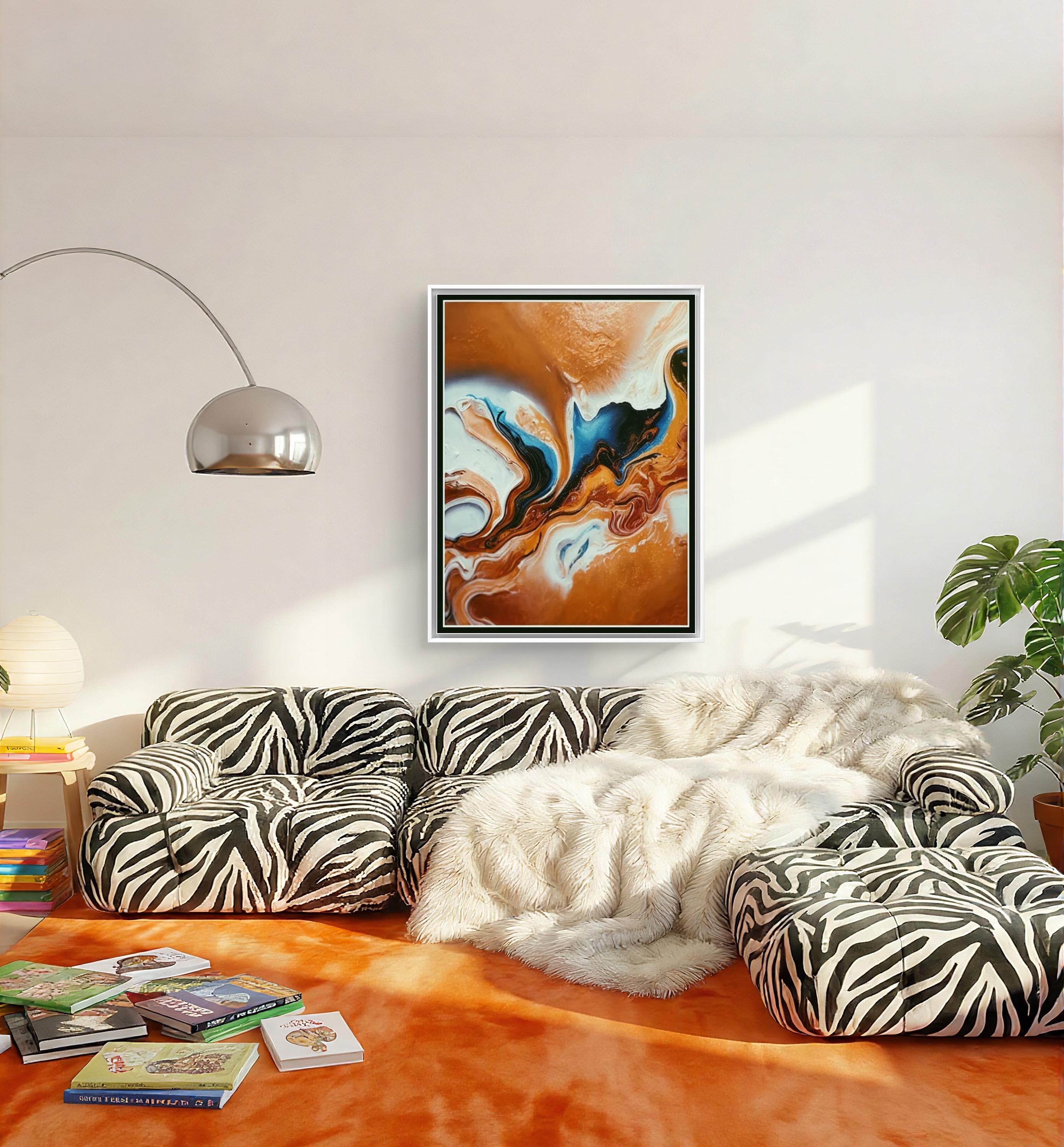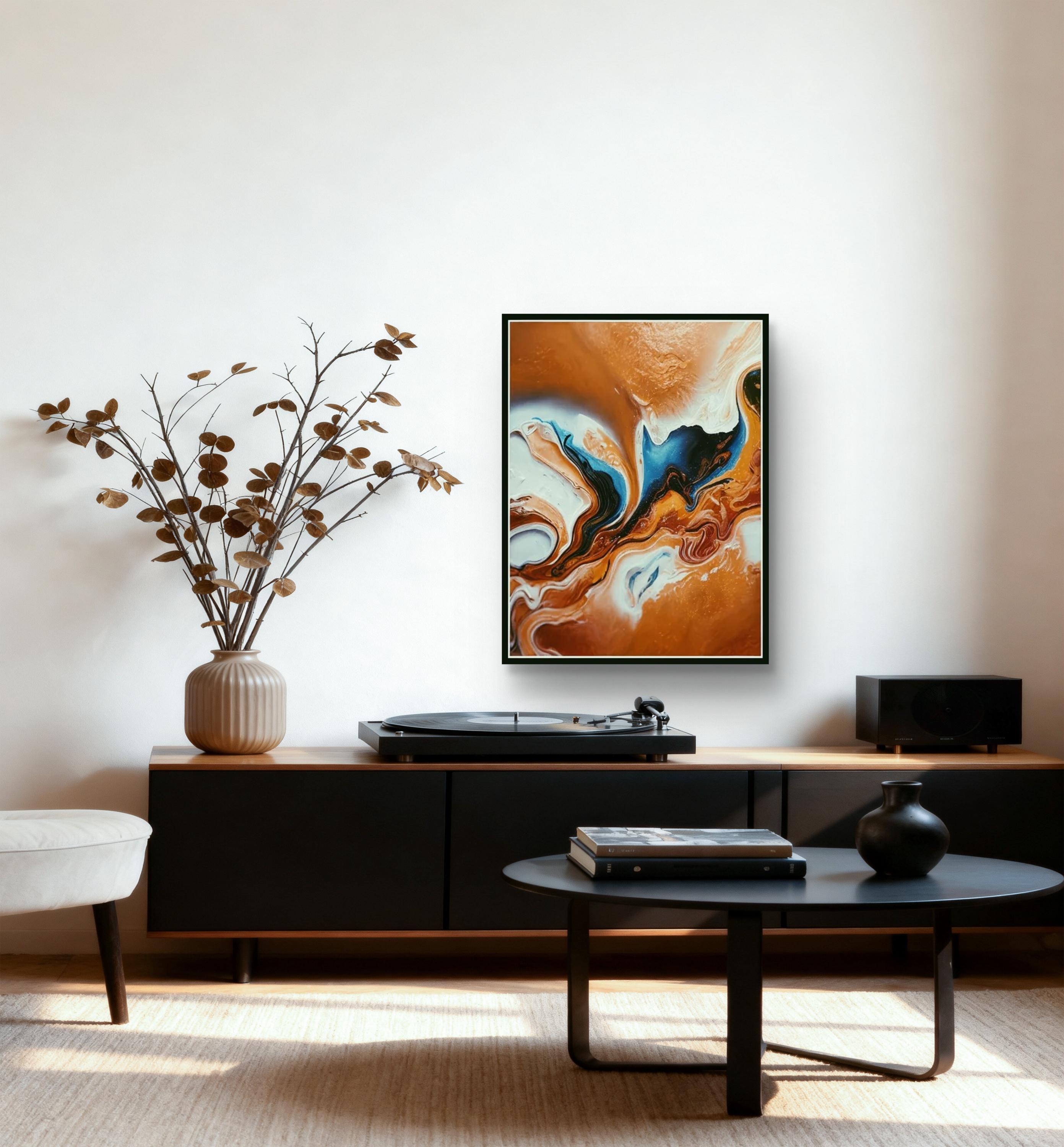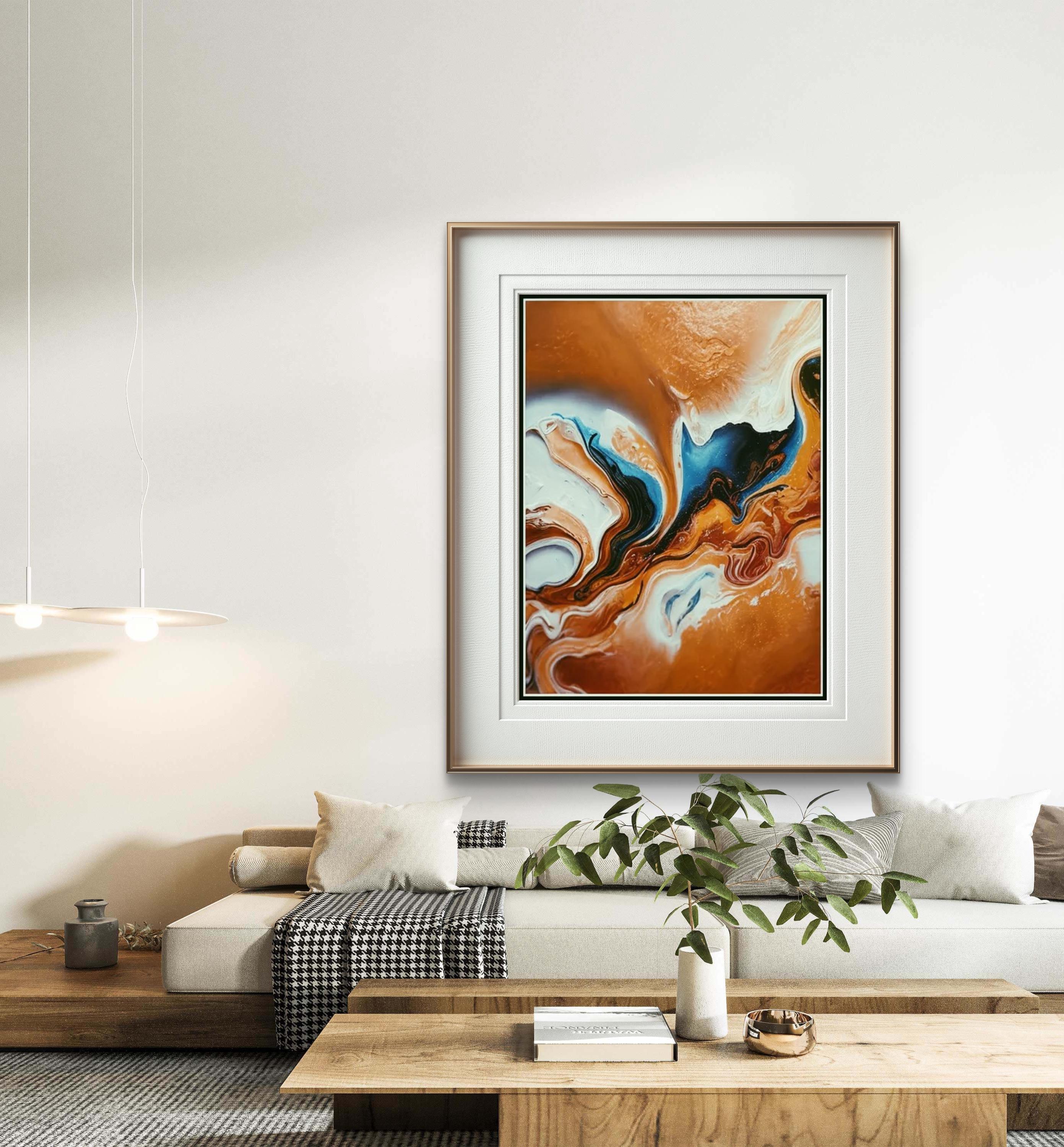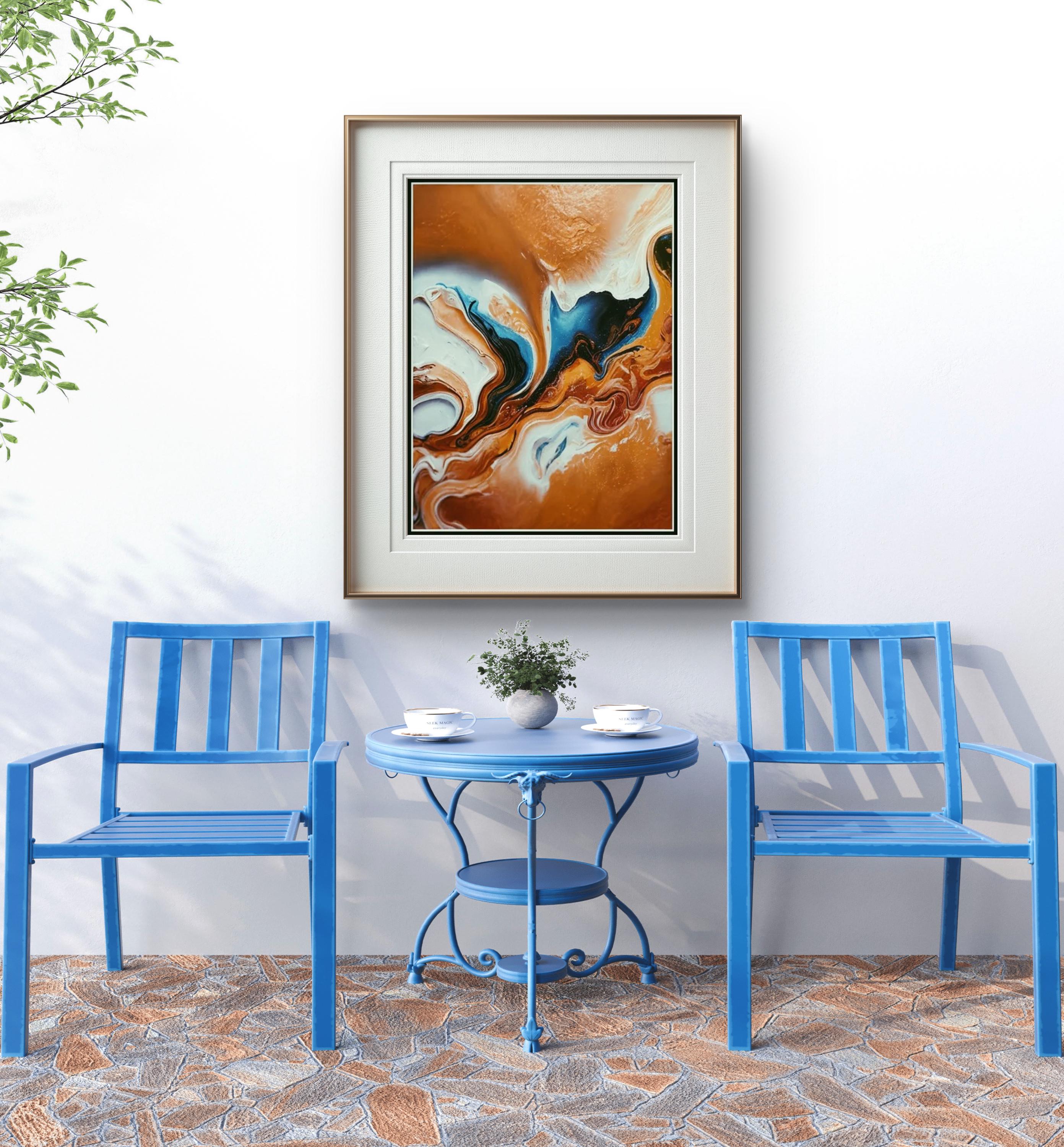 Fluid Movement and Flow -The painting uses fluid, swirling lines that mimic the natural movement of liquids. The blending and marbling of colors suggest motion and transformation, inviting the viewer to follow the curves throughout the canvas.