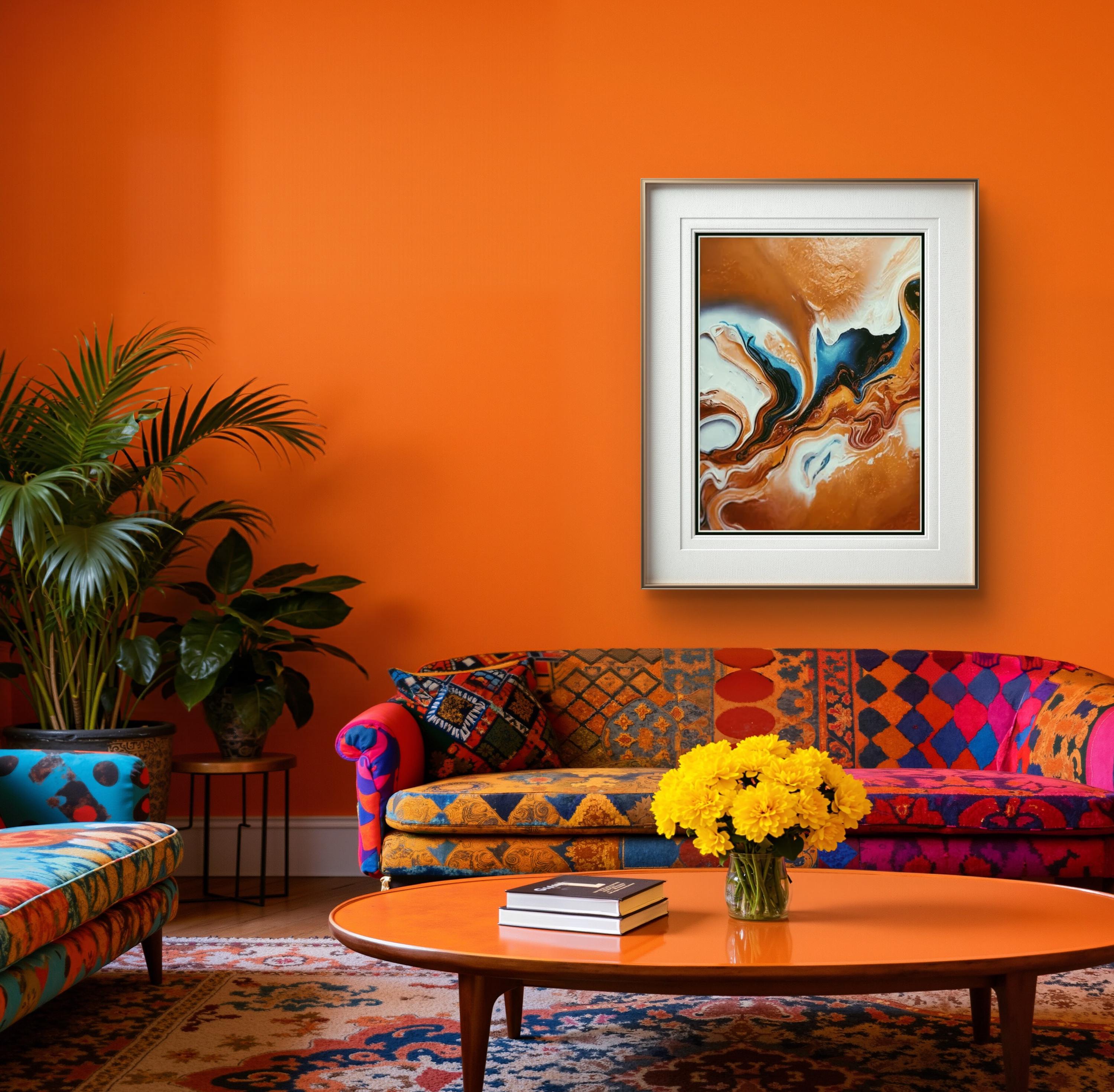 Color Palette and Contrast - The artwork combines warm earthy tones with cool blues, creating a powerful visual balance. The warm oranges evoke grounding and intensity, while the blues introduce calmness and depth. This contrast enhances the emotional impact of the piece.