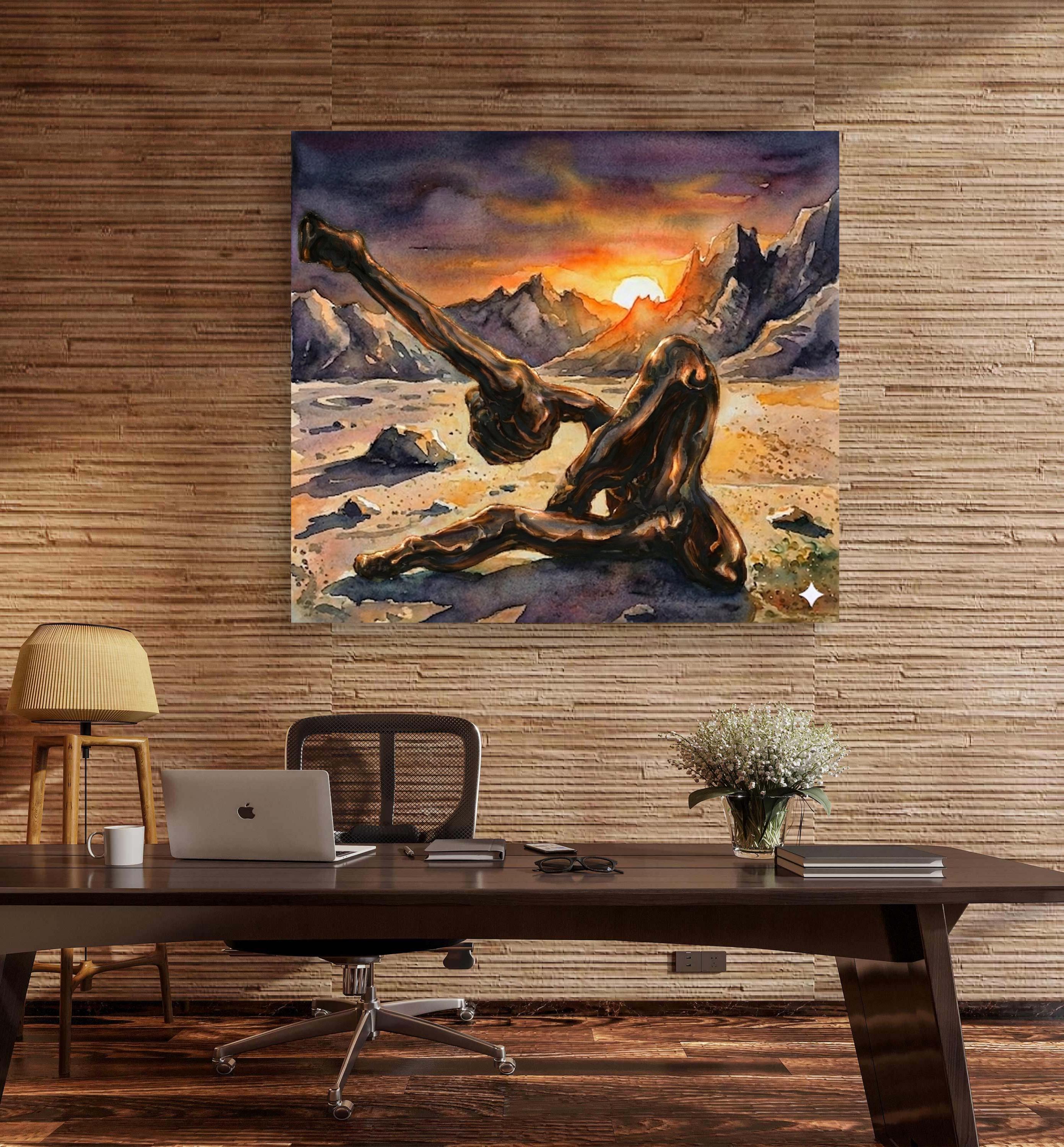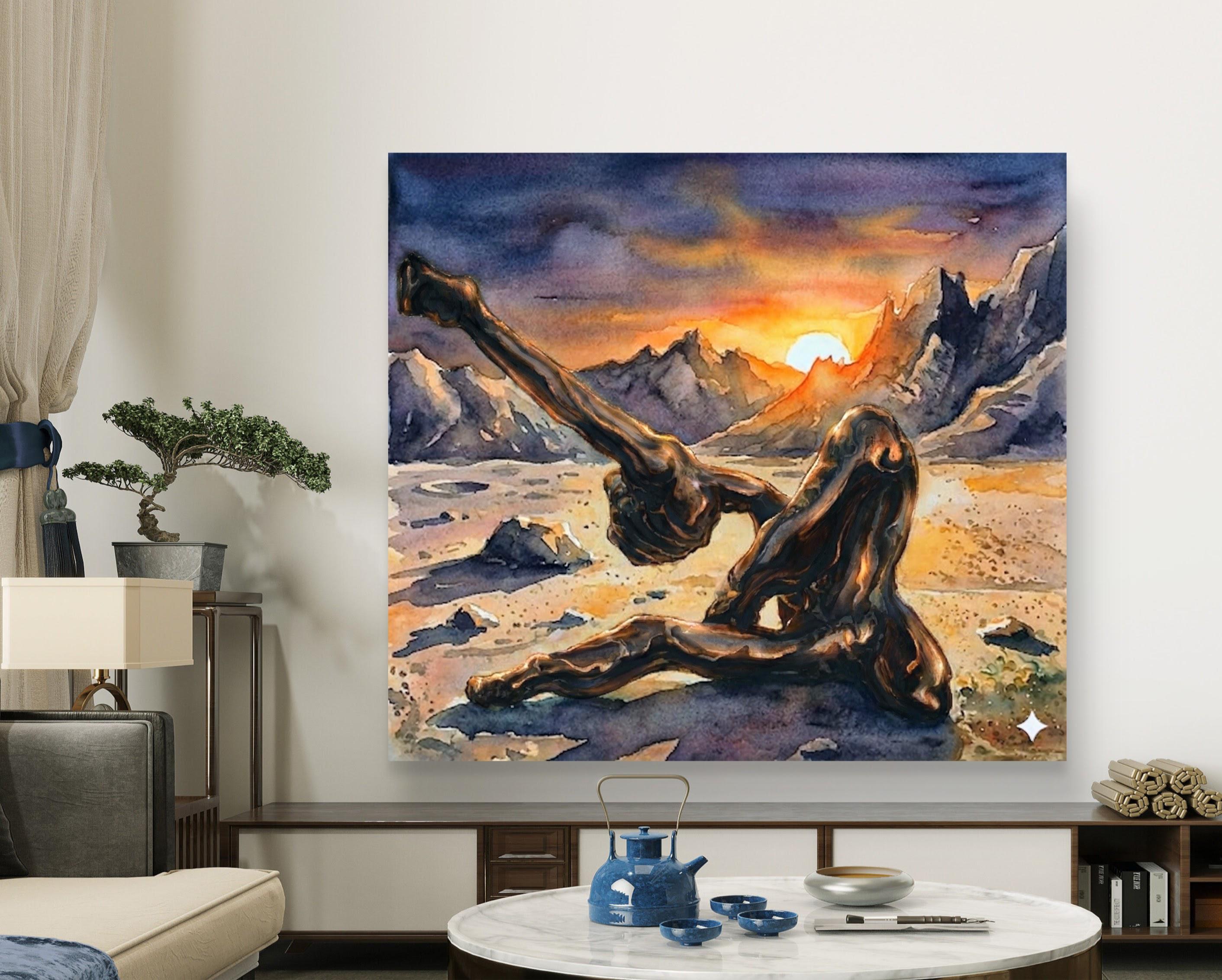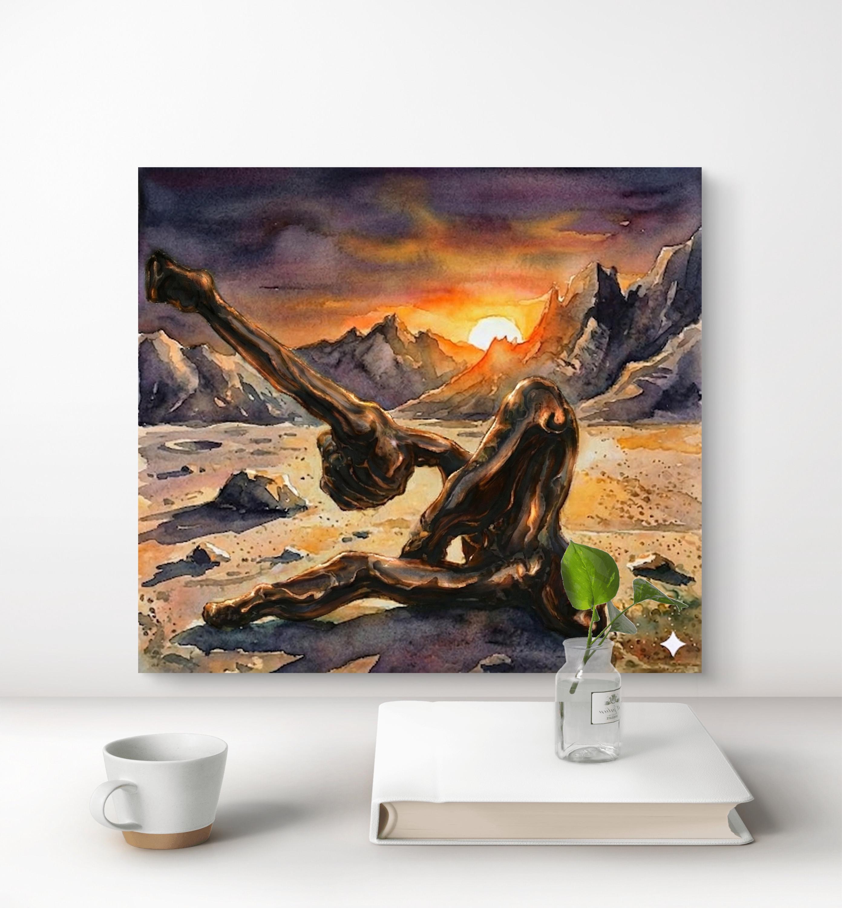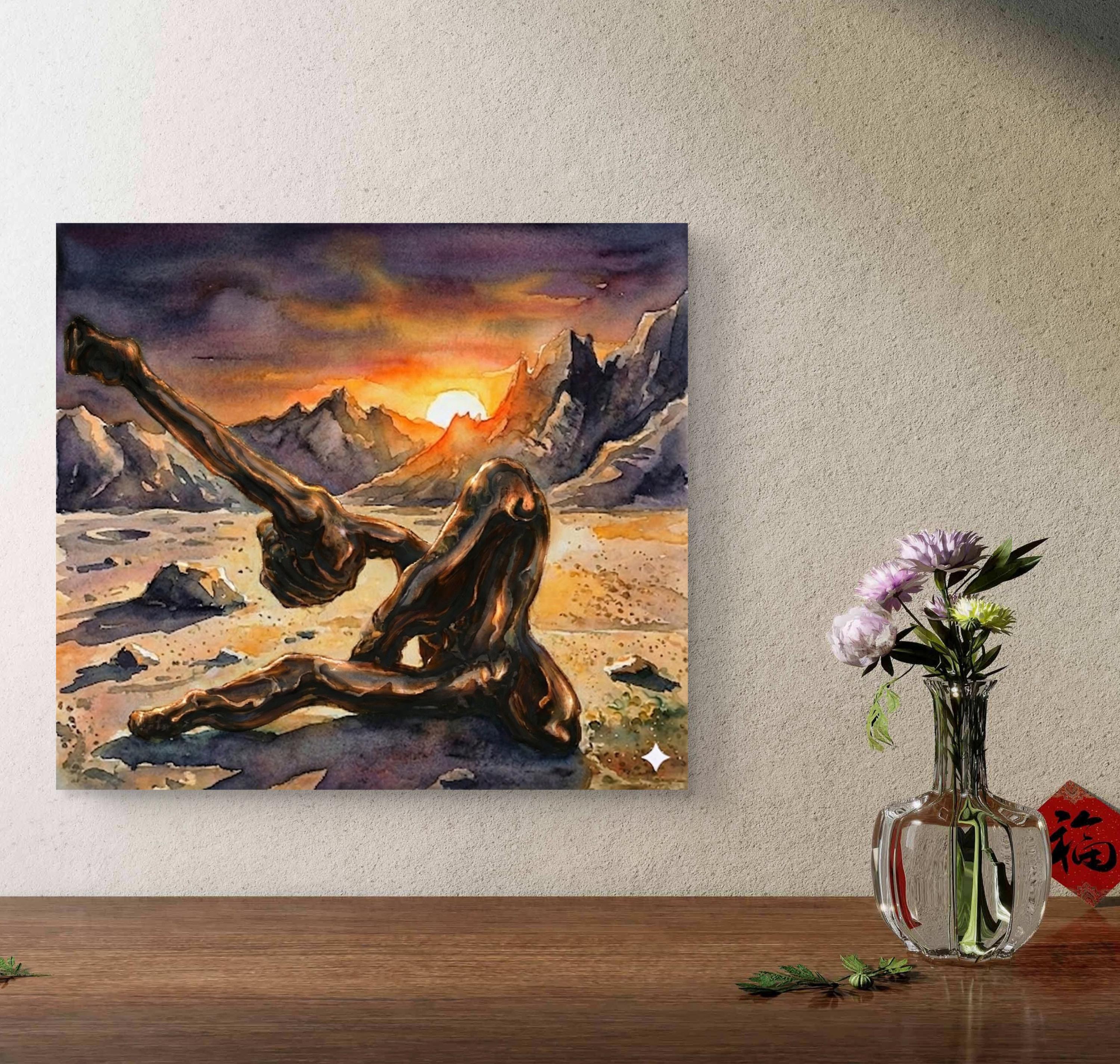"Echoes in Bronze" is a captivating fusion of traditional craftsmanship and modern digital artistry. This piece began as a hand-crafted, original bronze sculpture, which was then professionally photographed and reimagined within a breathtaking, surreal landscape using advanced artistic AI tools. The result is a powerful visual narrative where the heavy, grounded nature of bronze meets the ethereal, fluid beauty of a watercolor sunset.