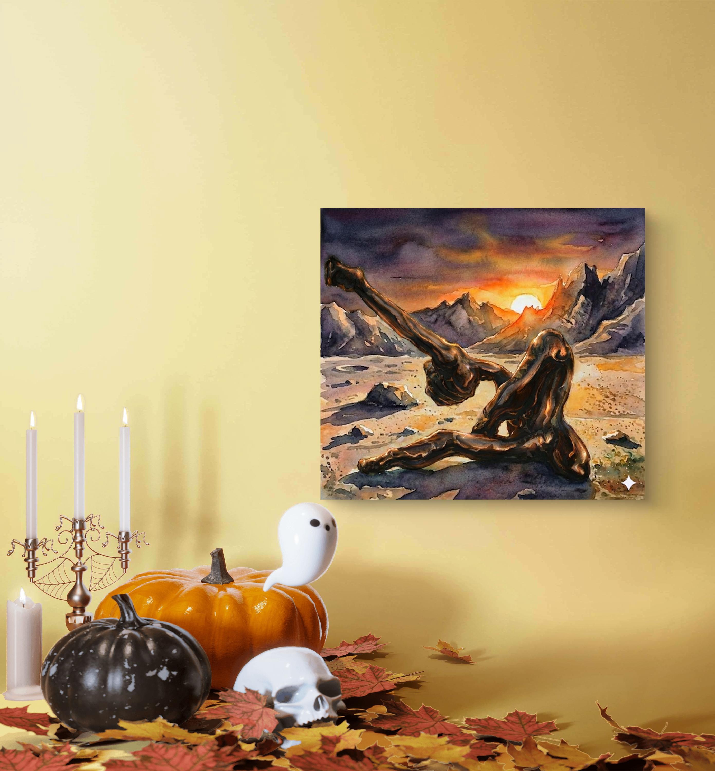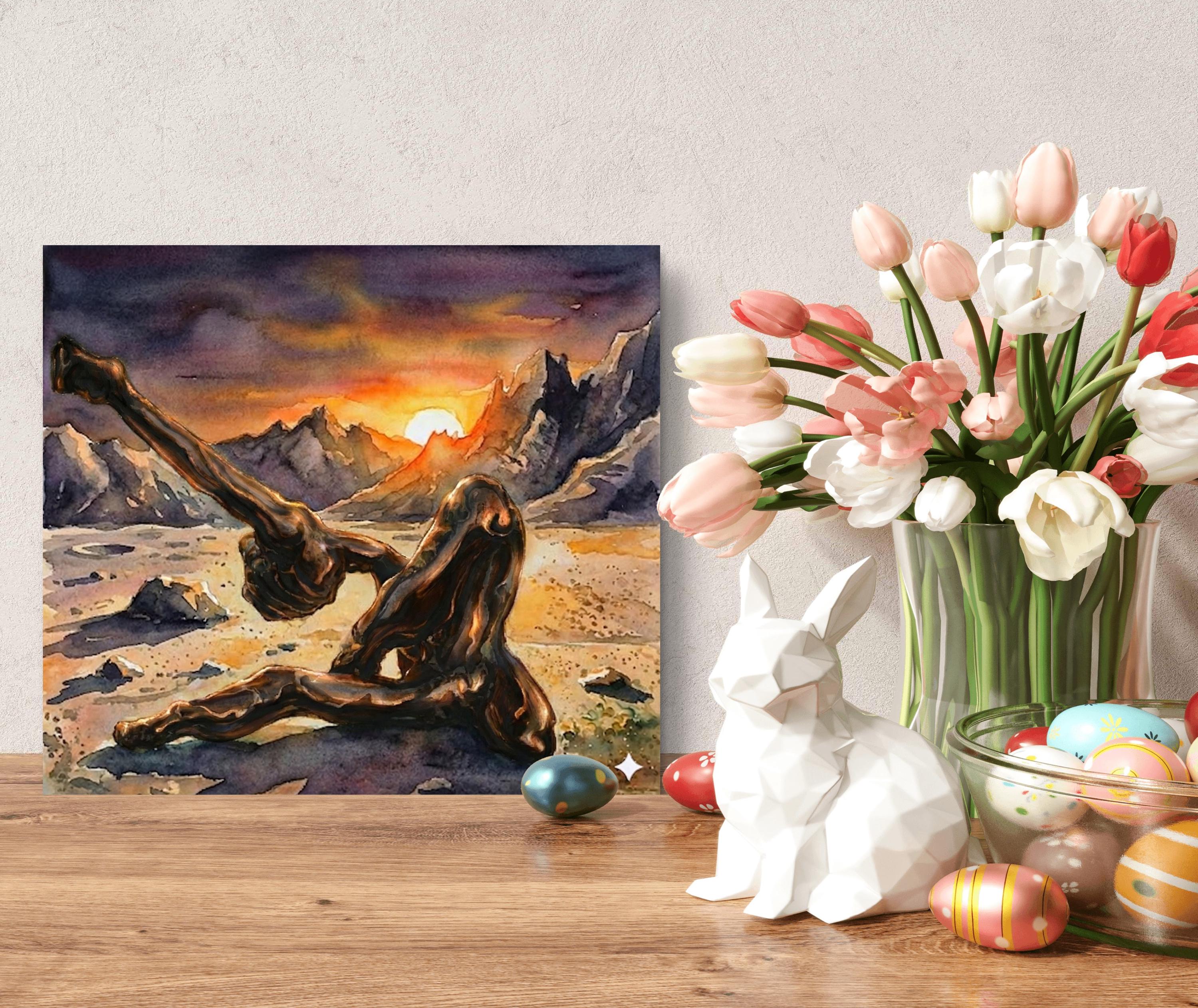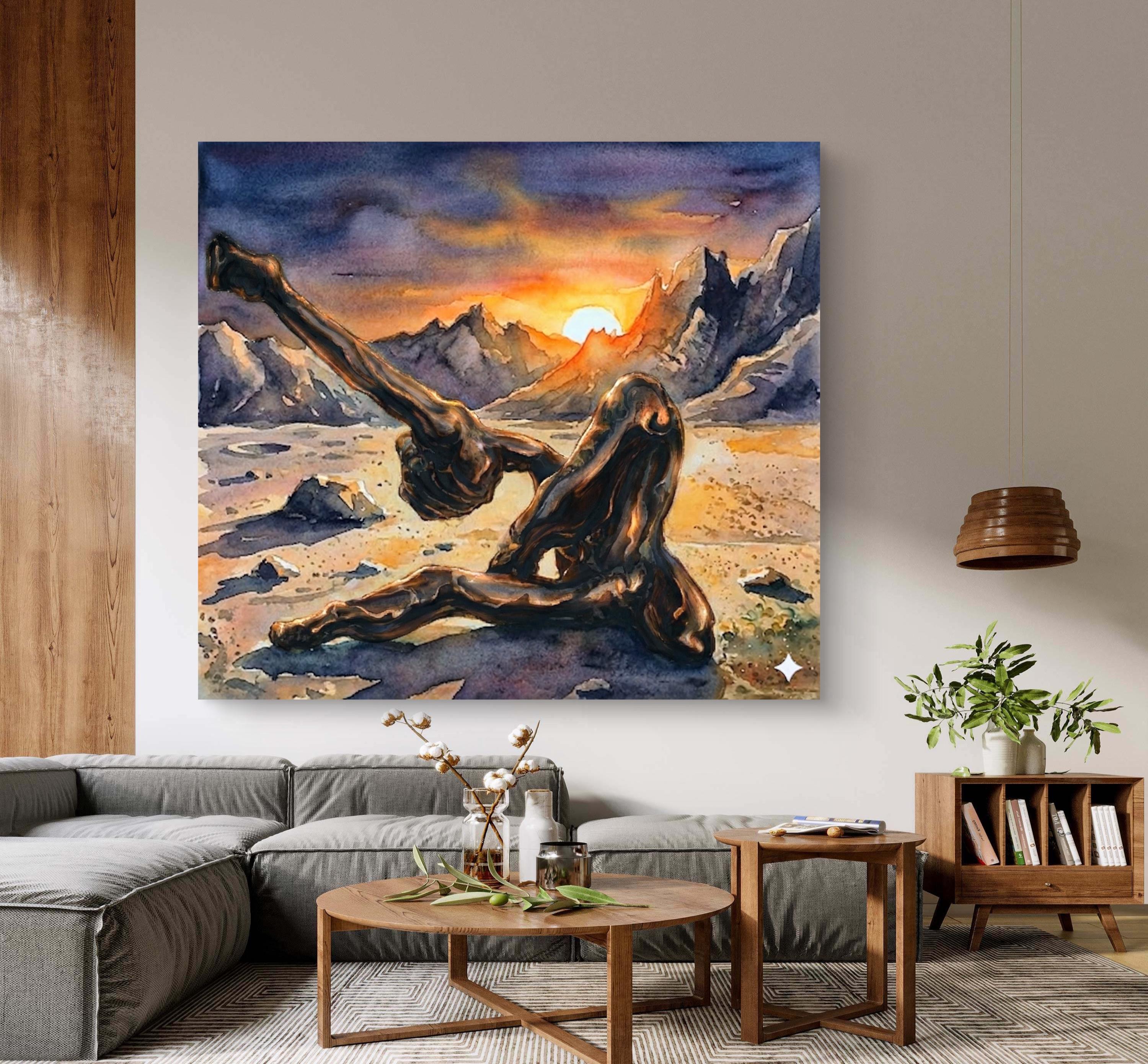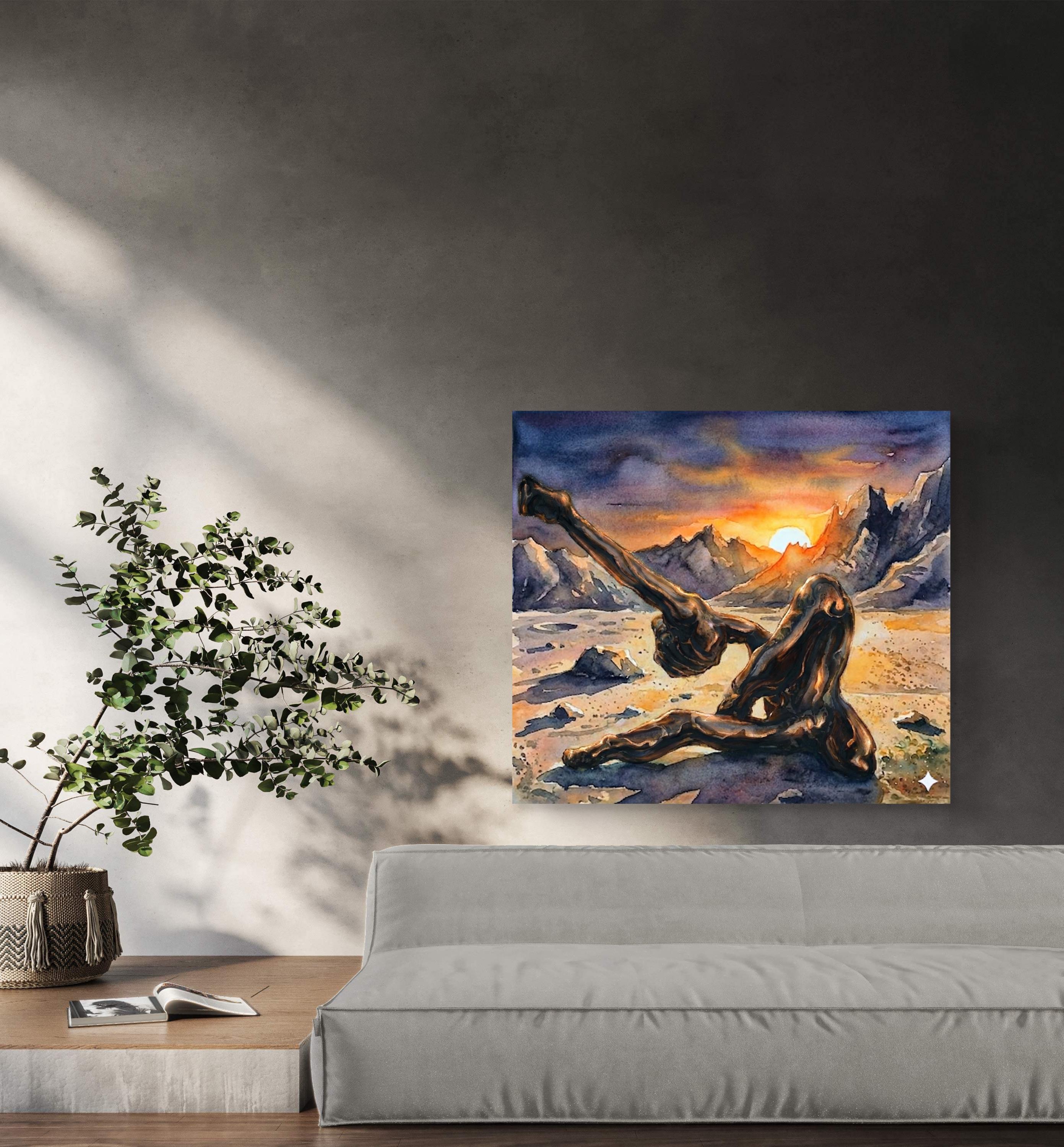 "Echoes in Bronze" is a captivating fusion of traditional craftsmanship and modern digital artistry. This piece began as a hand-crafted, original bronze sculpture, which was then professionally photographed and reimagined within a breathtaking, surreal landscape using advanced artistic AI tools. The result is a powerful visual narrative where the heavy, grounded nature of bronze meets the ethereal, fluid beauty of a watercolor sunset.