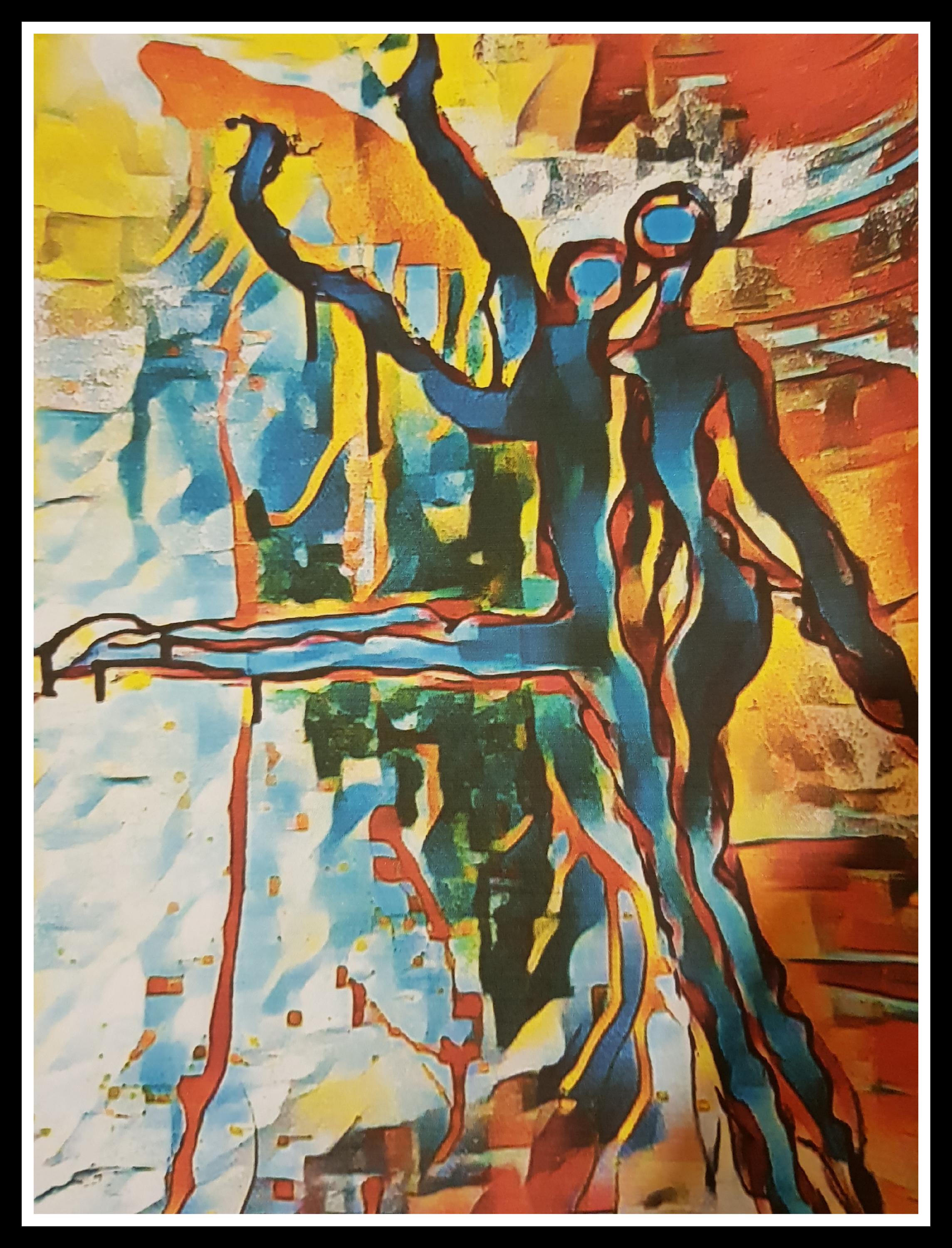 The background creates a striking contrast with a blaze of warm colors—bright yellows, fiery oranges, and deep reds—evoking the feeling of intense sunlight or heat. To the left, cooler tones of blue and white introduce a textured, almost mosaic or water-like element. The painting’s expressive brushstrokes and bold palette convey a sense of energy, connection, and primitive rhythm.