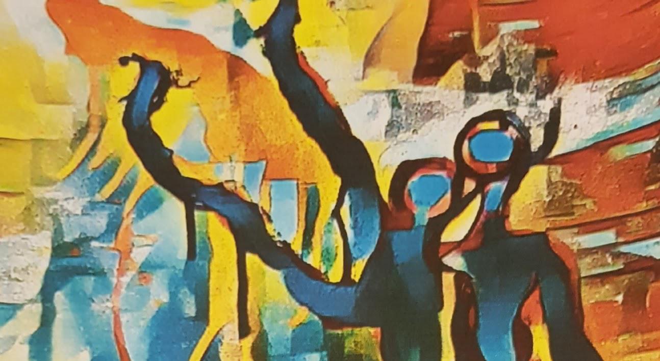 This vibrant abstract artwork depicts silhouette-like figures that appear to be intertwined, merging the human form with the organic structure of a tree. The figures, rendered in deep shades of blue and black, seem to be dancing or swaying, with limbs extending like branches and bodies rooting into the ground.