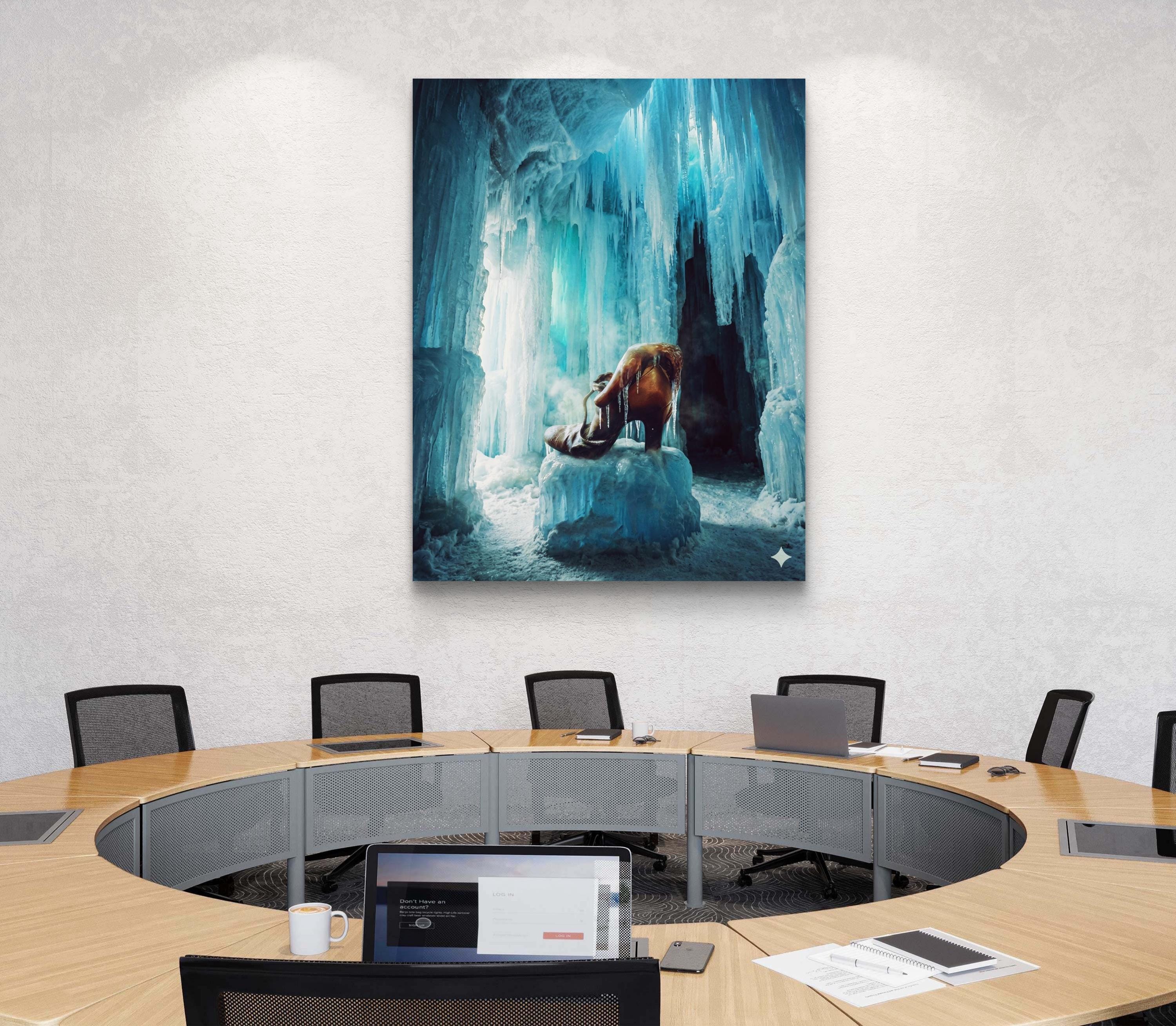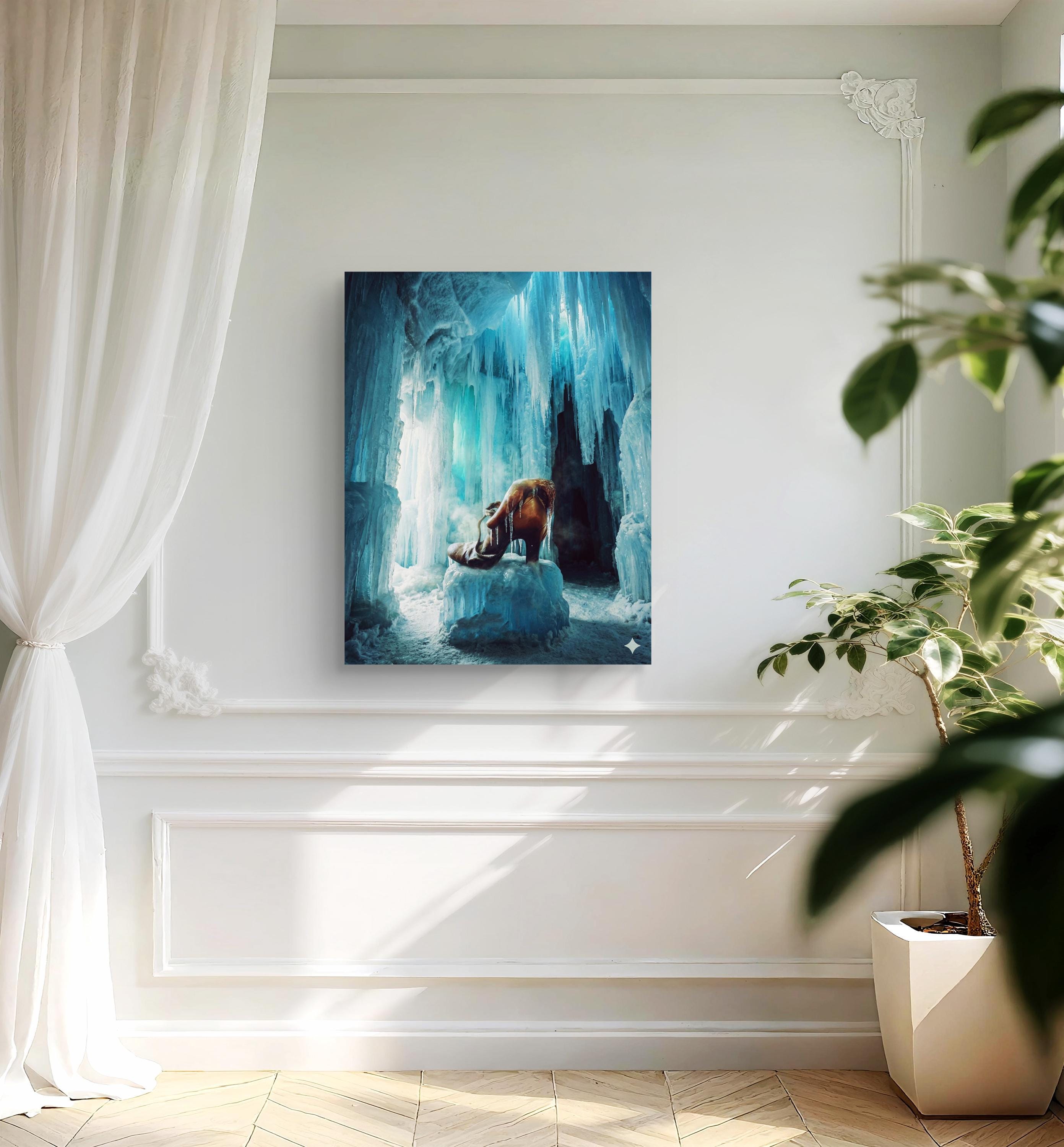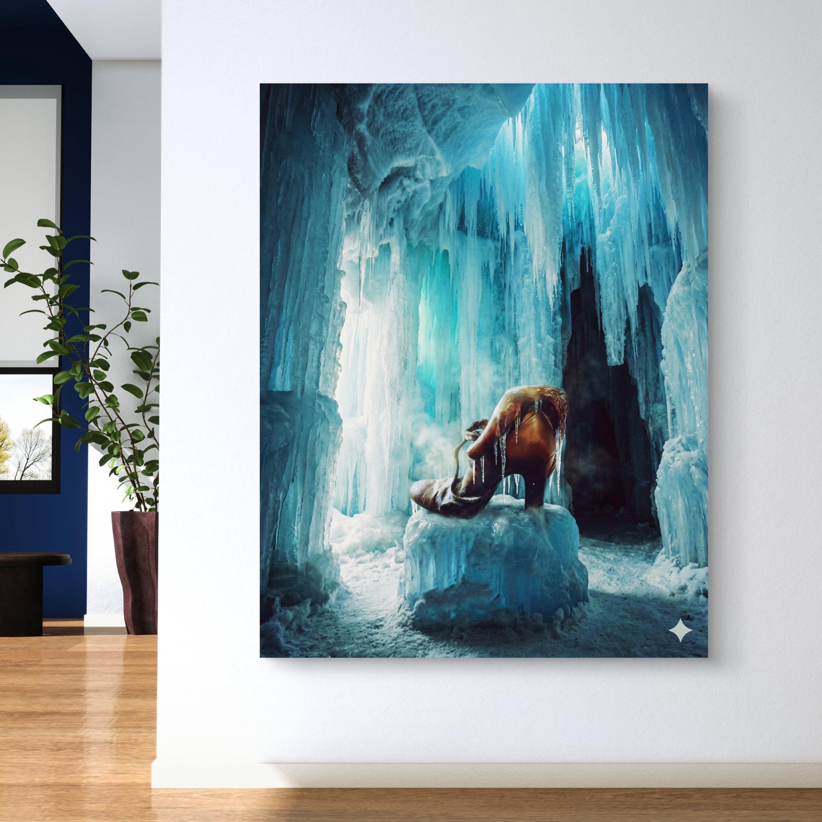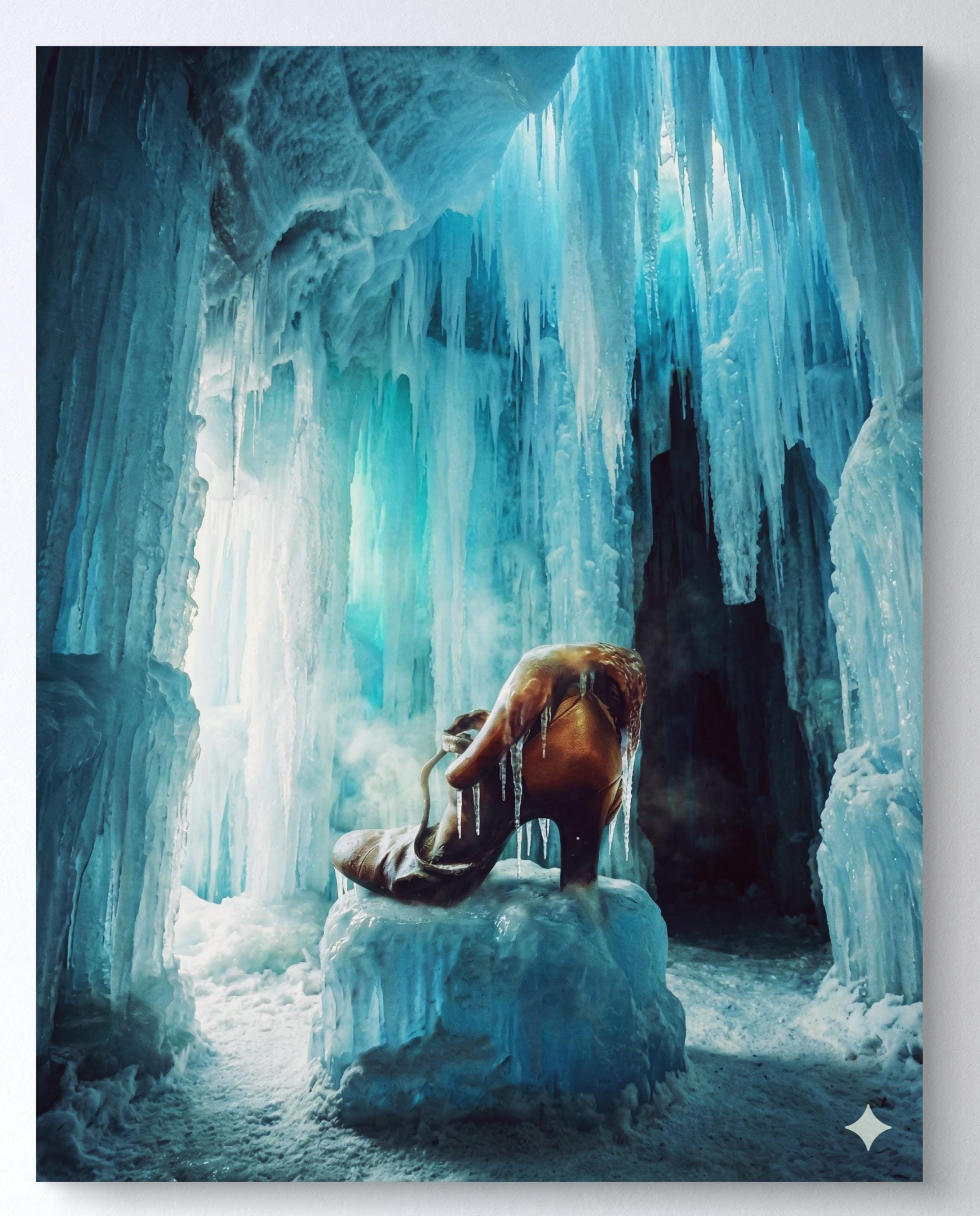 This Artwork Immerse your space in the mystical atmosphere of this surrealist masterpiece. This striking artwork features a fluid bronze sculpture—morphing between the silhouette of a high-heel shoe and organic woman curves—placed deep within a crystalline ice cave.
