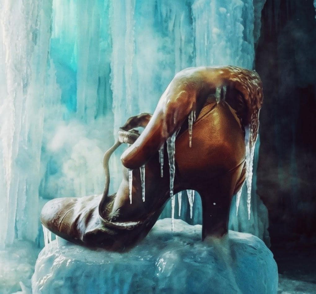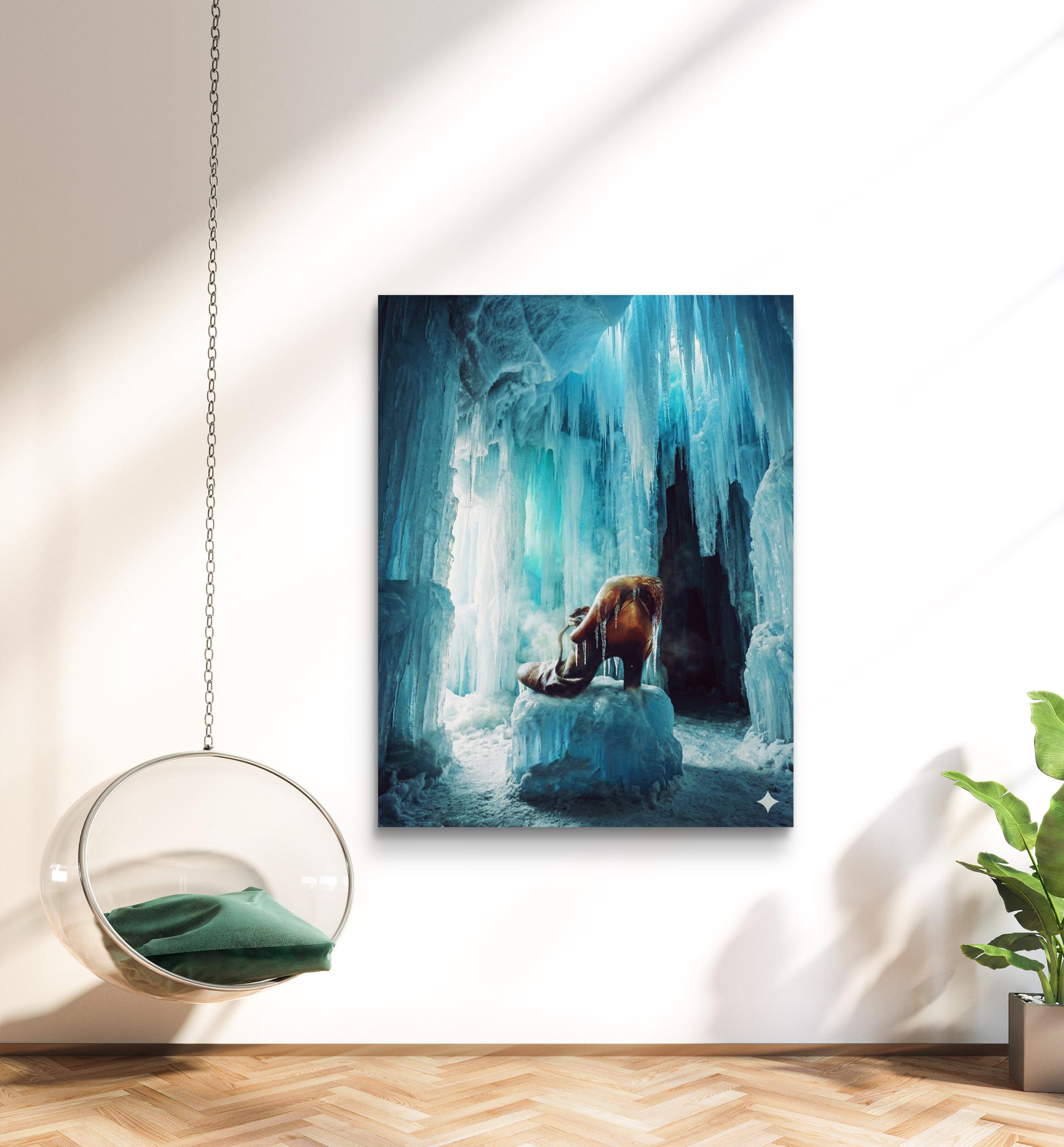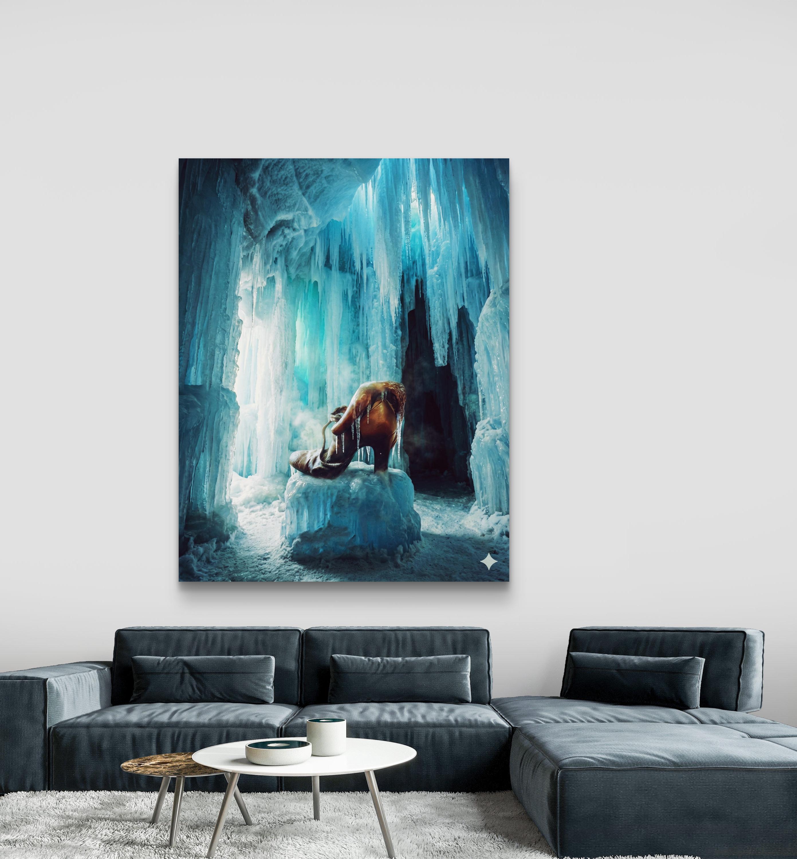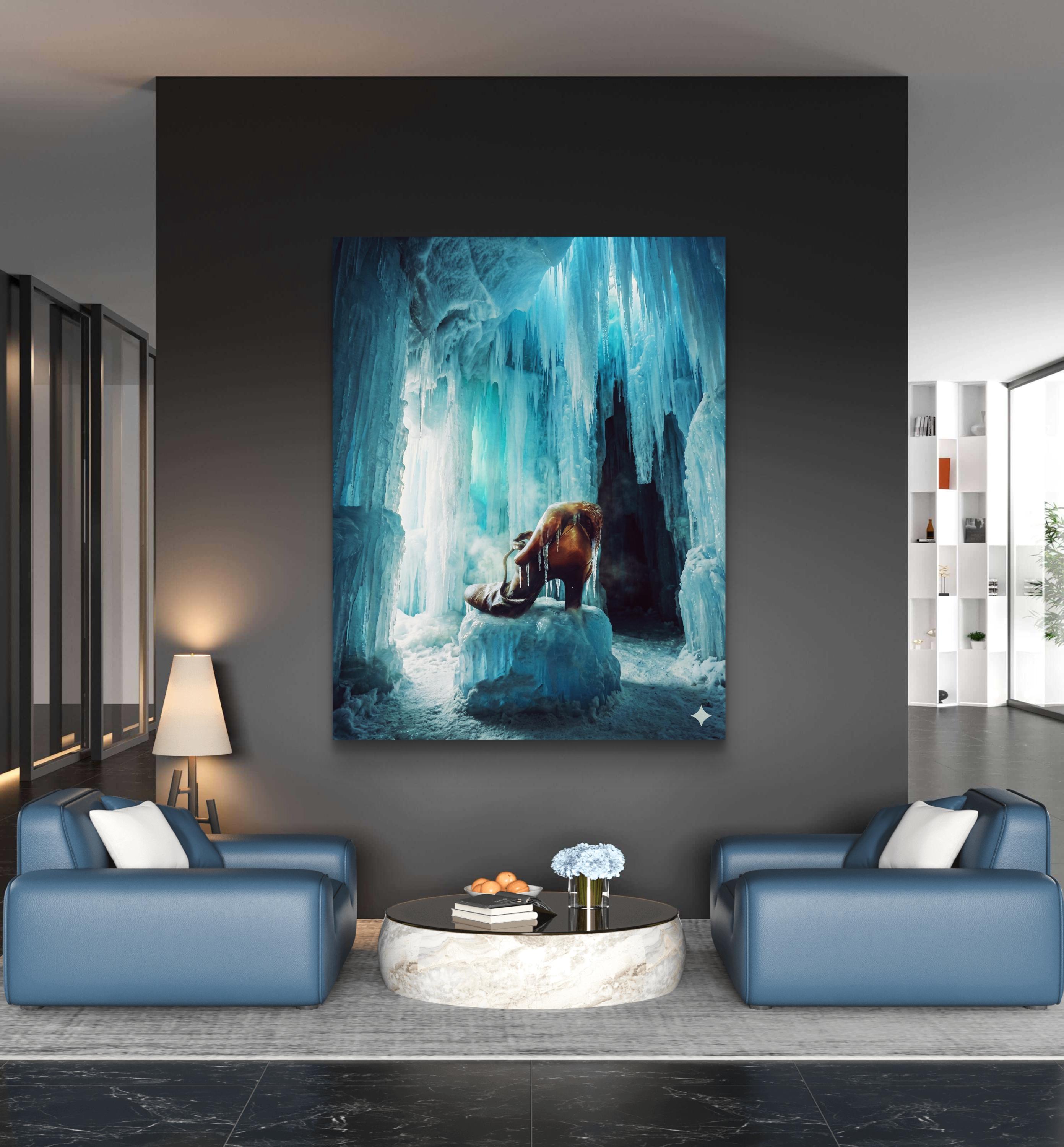 This Artwork Immerse your space in the mystical atmosphere of this surrealist masterpiece. This striking artwork features a fluid bronze sculpture—morphing between the silhouette of a high-heel shoe and organic woman curves—placed deep within a crystalline ice cave.