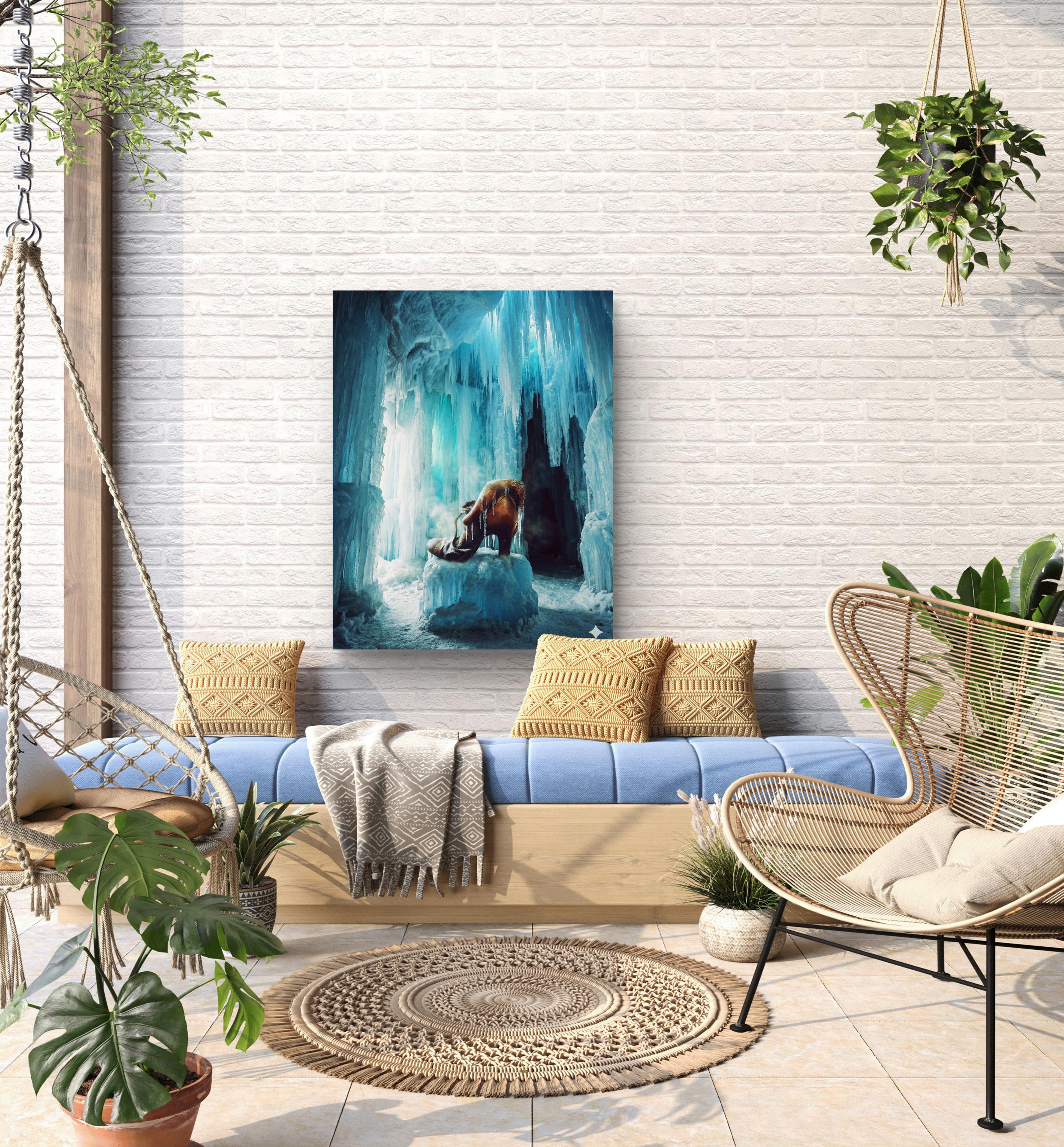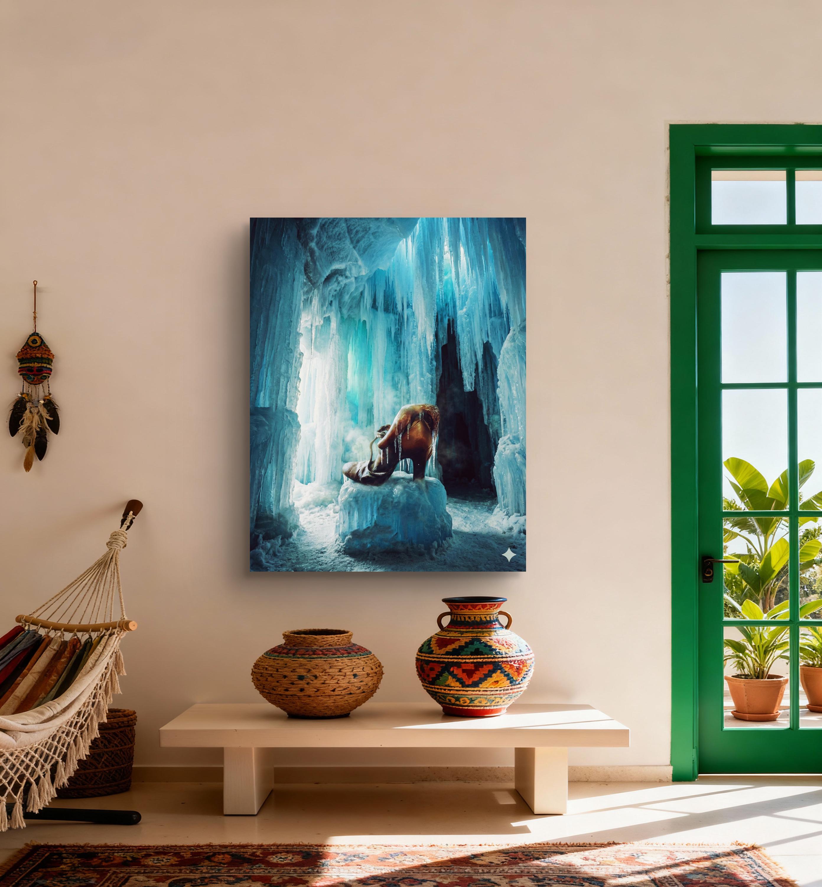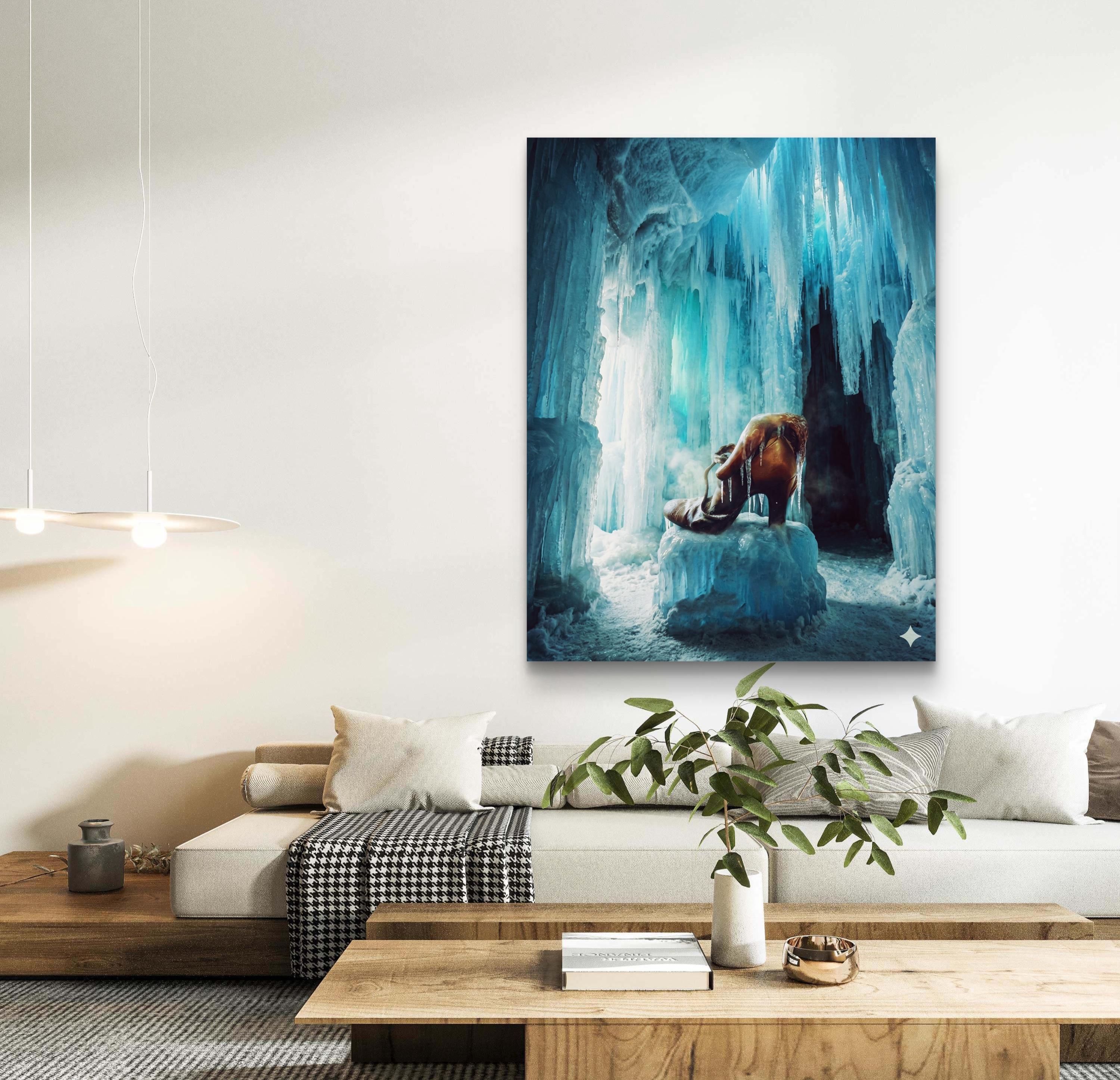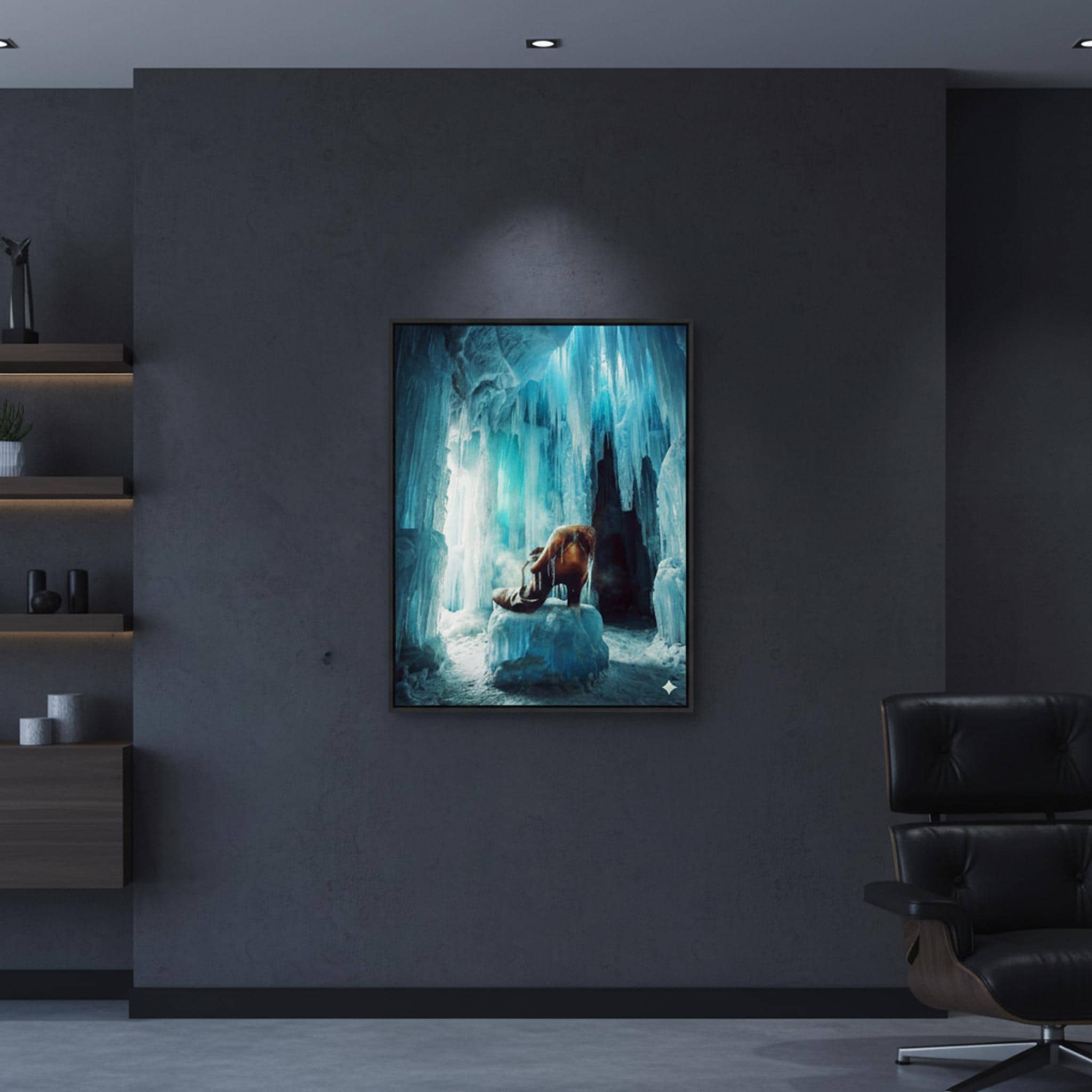 This Artwork Immerse your space in the mystical atmosphere of this surrealist masterpiece. This striking artwork features a fluid bronze sculpture—morphing between the silhouette of a high-heel shoe and organic woman curves—placed deep within a crystalline ice cave.
