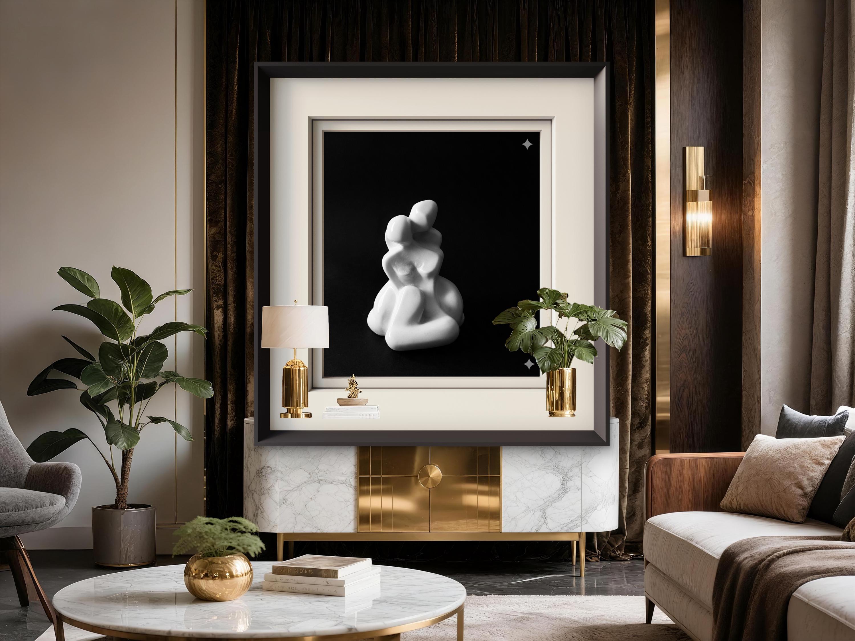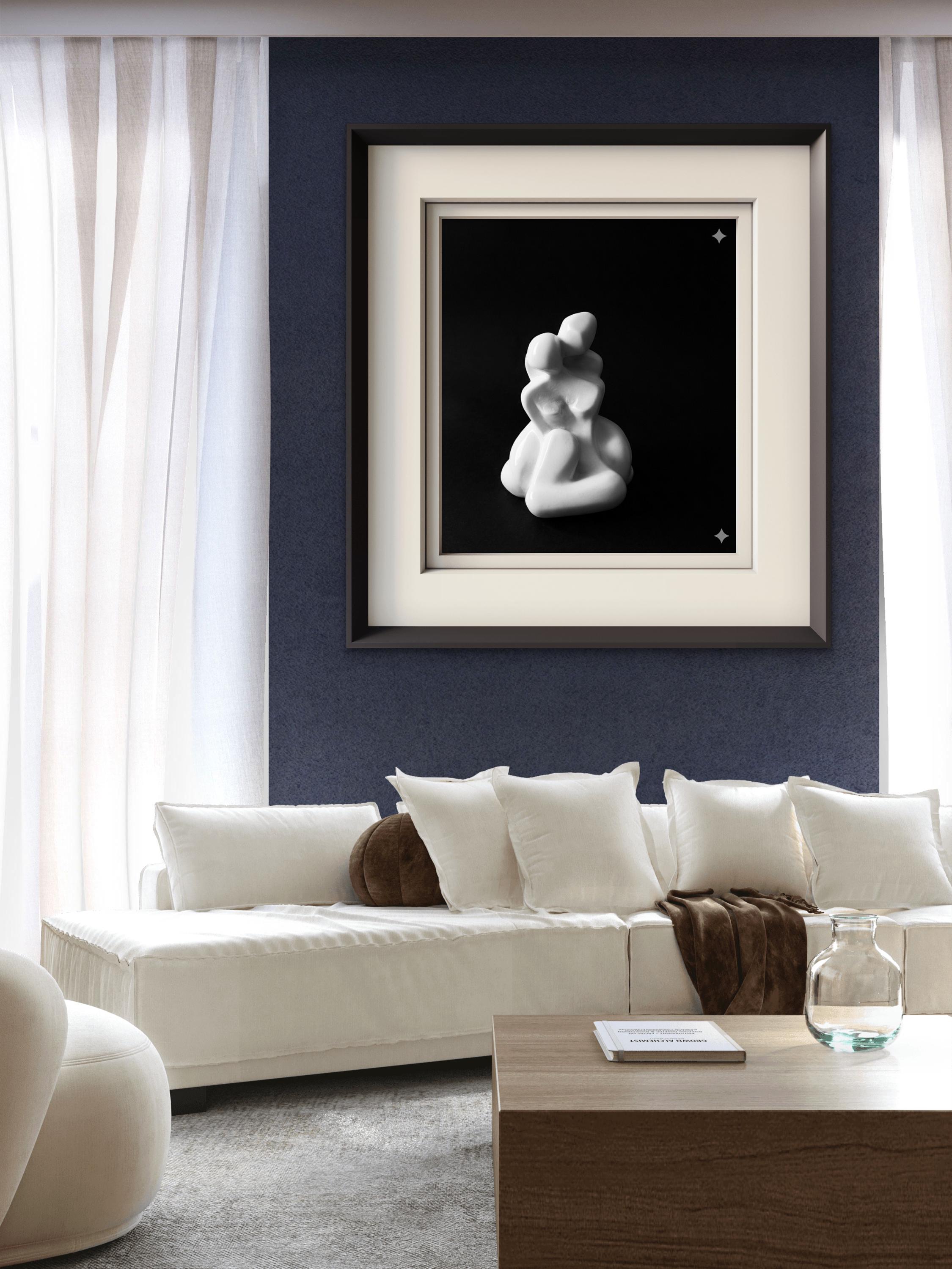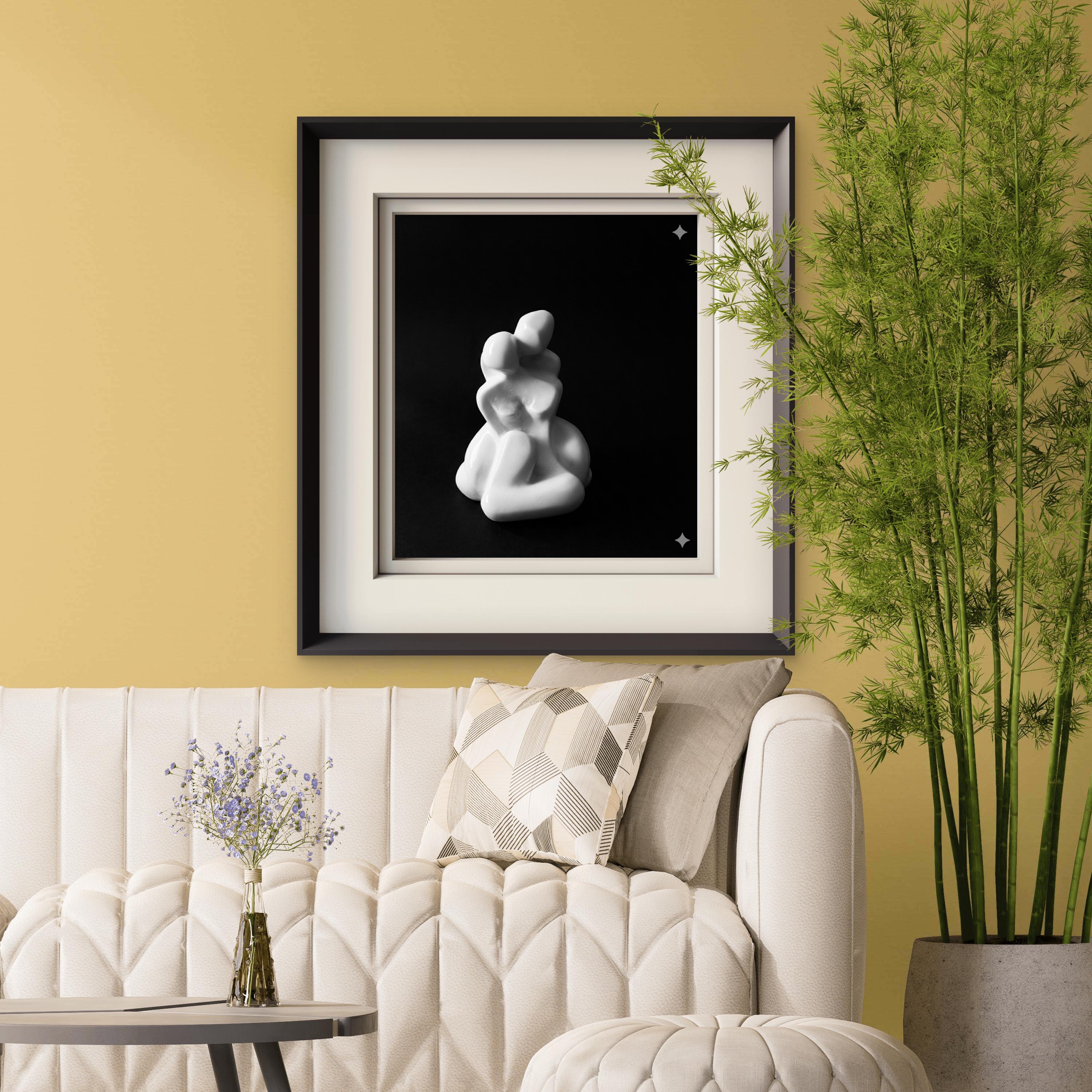 This fine art photograph features an original, hand-sculpted white concrete sculpture, beautifully captured against a deep black background. The striking contrast highlights the fluid lines and tactile texture of the piece, representing an eternal embrace and the beauty of togetherness.